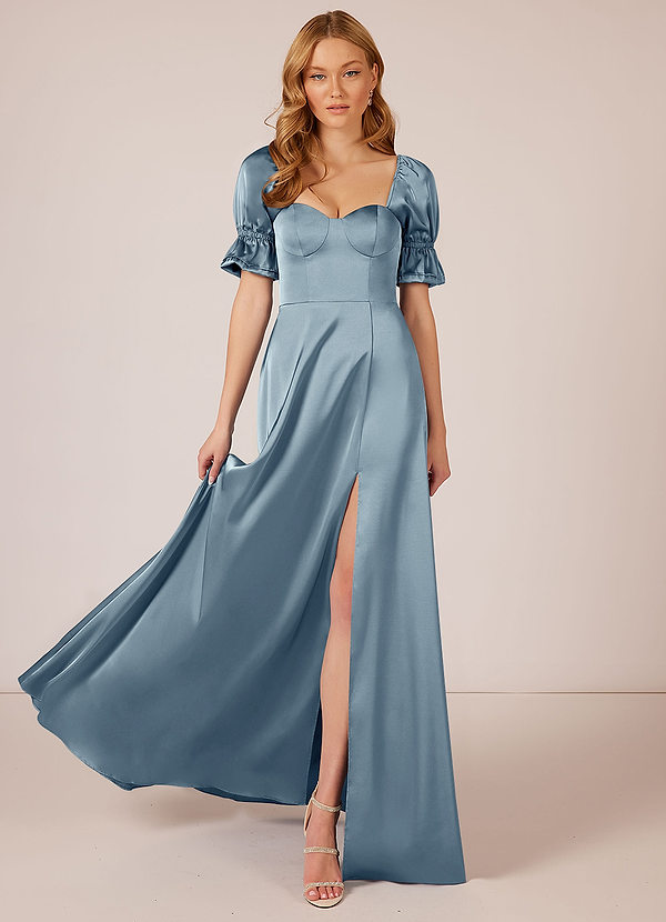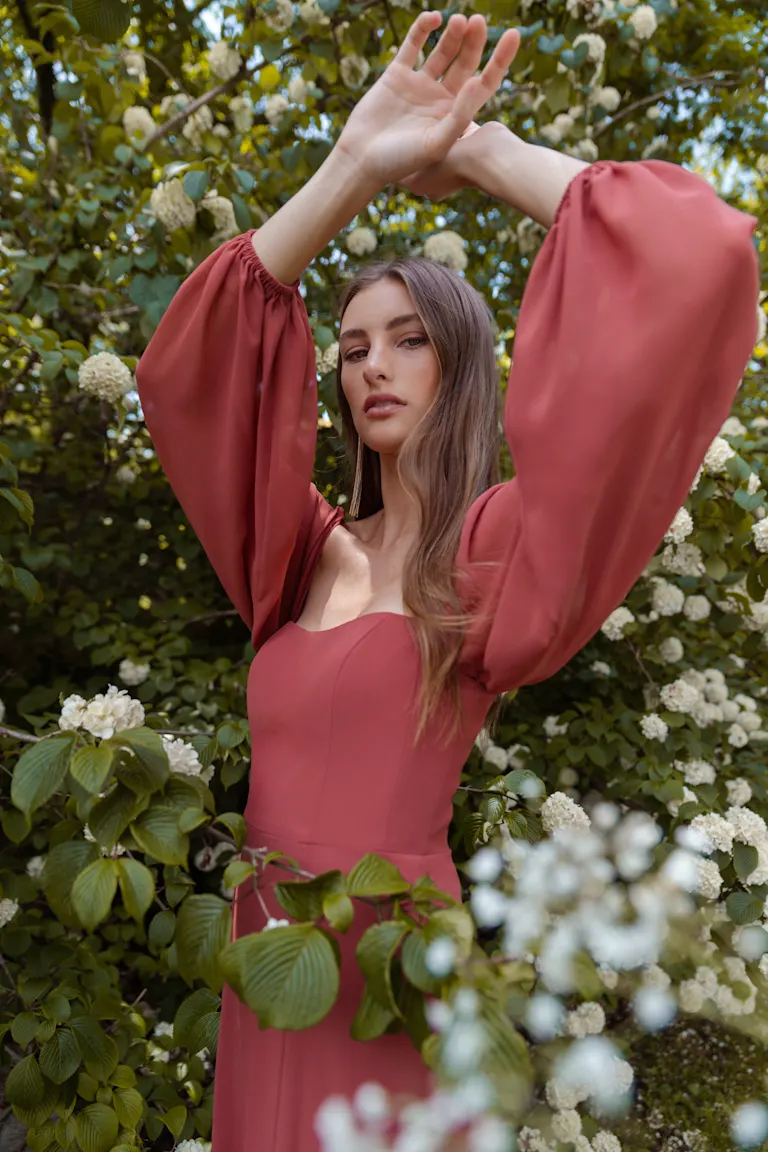 The silk bridesmaid dress with long sleeves is a boho beauty with a clean, modern edge. A structured bodice and a sweetheart neckline that everyone is talking about perfectly offset the billowing silky sleeves. A slit in the flowing A-line skirt reveals a hint of flesh.