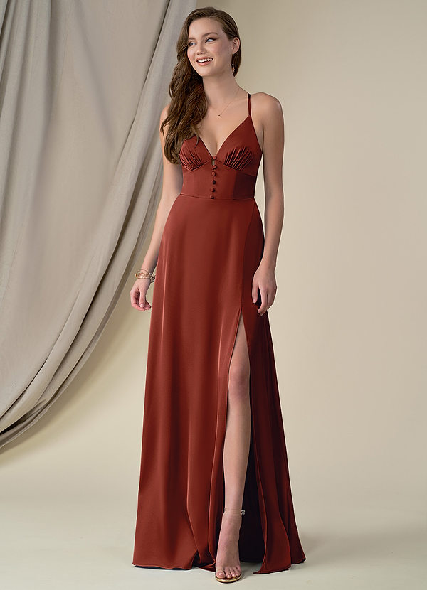 This satin gown is incredibly charming, with a beautiful halter neckline and an appealing open back. The deep copper hue is also quite flexible and a wonderful choice for autumn weddings. This maxi is cut on the bias for the ideal slip draping we're all after. The top wraps lightly around your neck to create a beautiful high neck and a stunning open back.