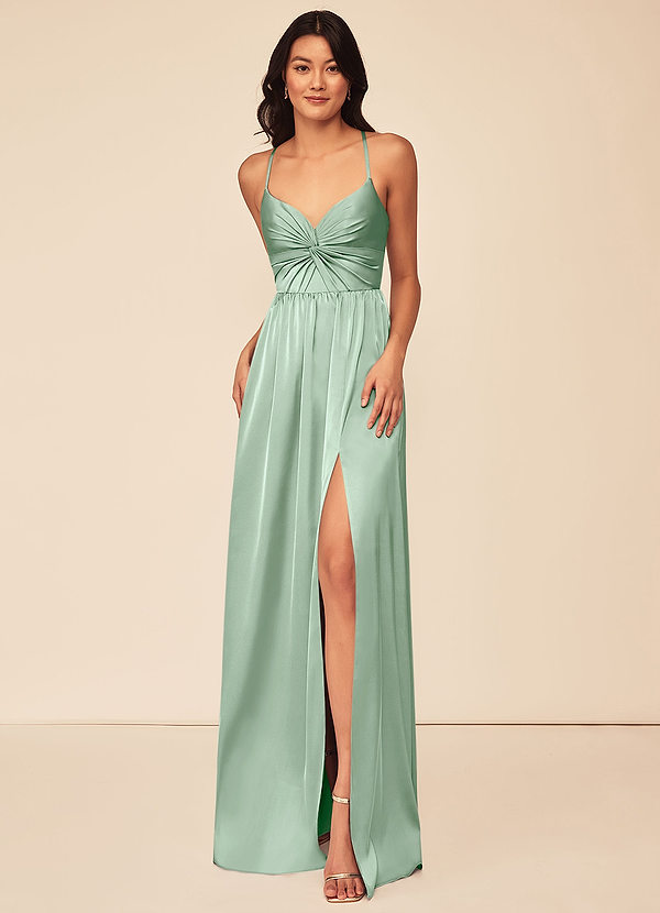 It is a sophisticated option for your main women. This dress was created using our stretch satin, which has a glossy sheen while being comfortable. The pleated bodice has a V-neckline that is universally flattering and is held up by spaghetti straps that cross in the back for an eye-catching lace-up design. The floor-length A-line skirt includes a leg slit for ease of walking and dancing.