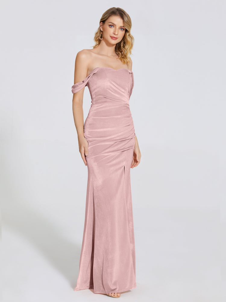 Need to glam up for another formal Christmas party? This mermaid gown with a flirty off-the-shoulder neckline should be your wardrobe of choice. It has a dramatic sweeping train that will drop jaws and turn heads.