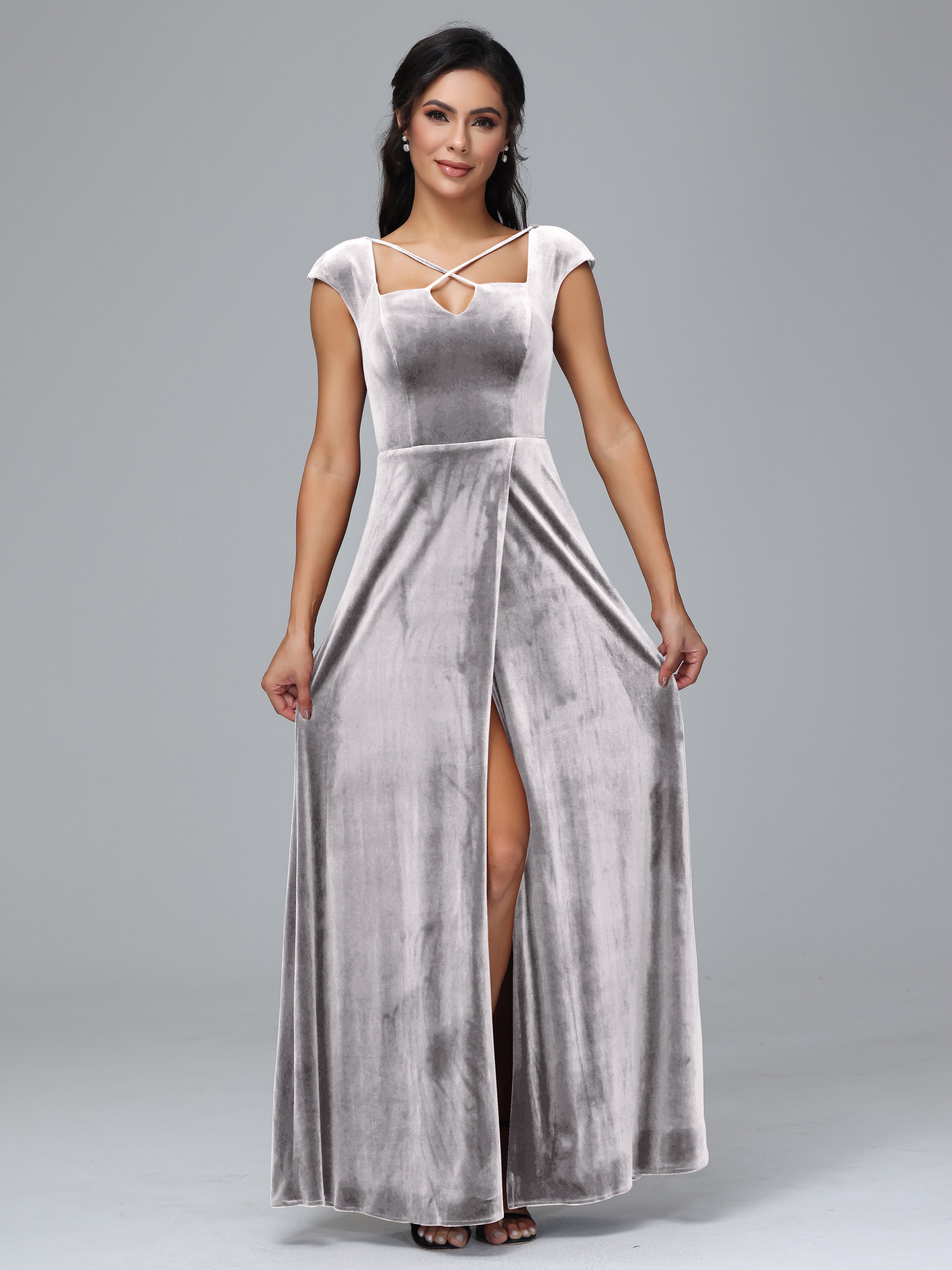Scoop Neck Long Velvet Bridesmaid Dresses With Split
