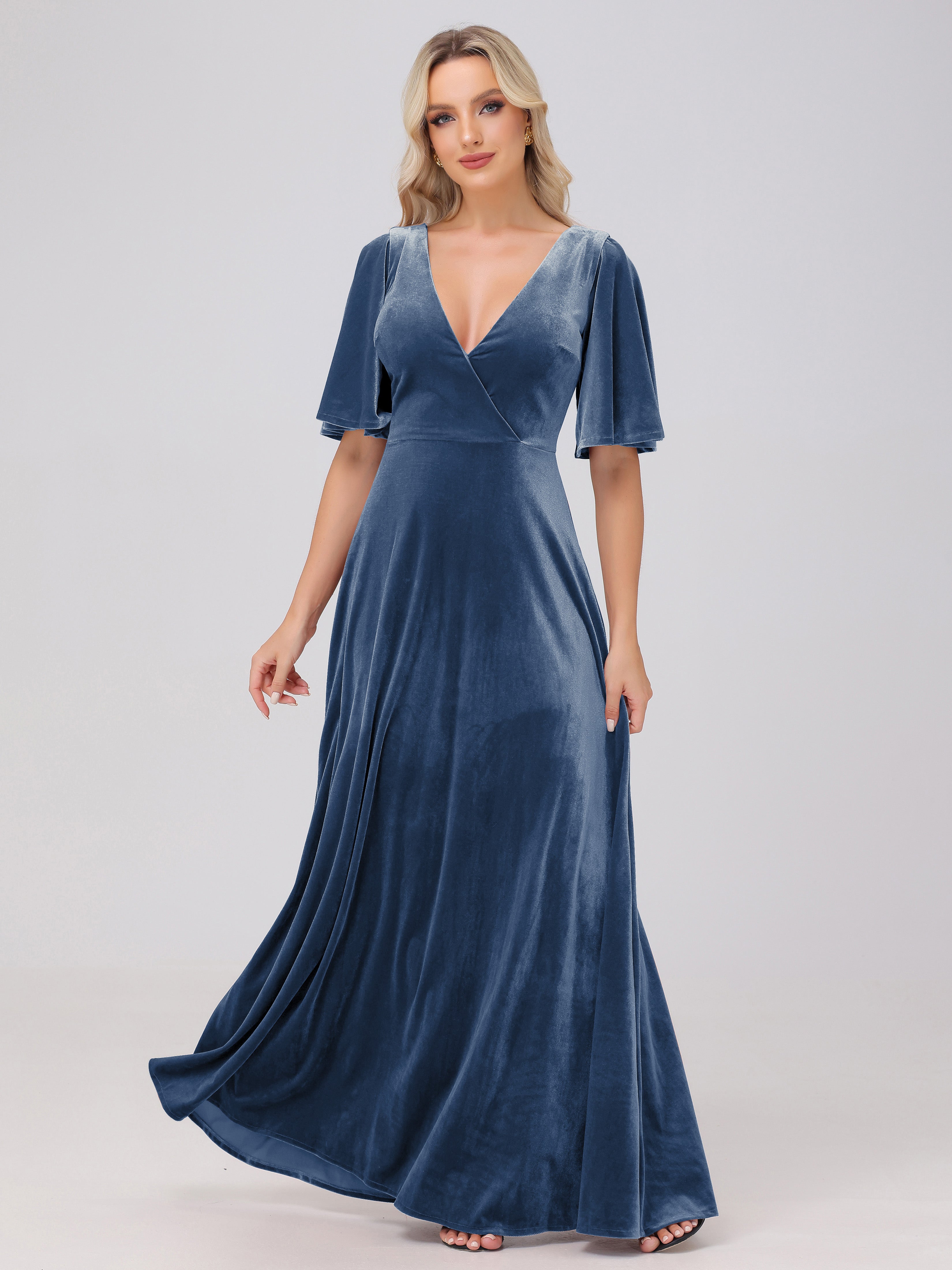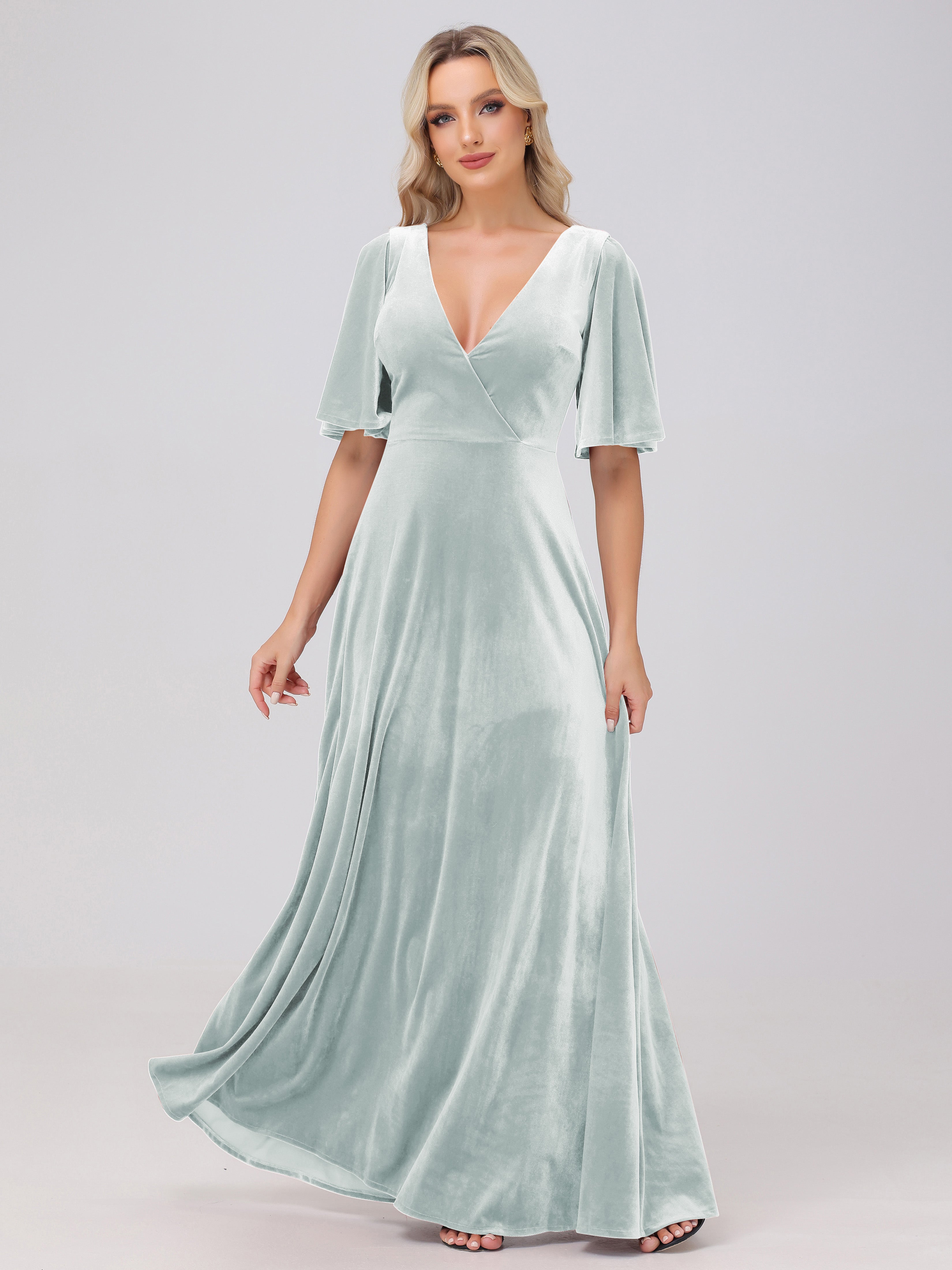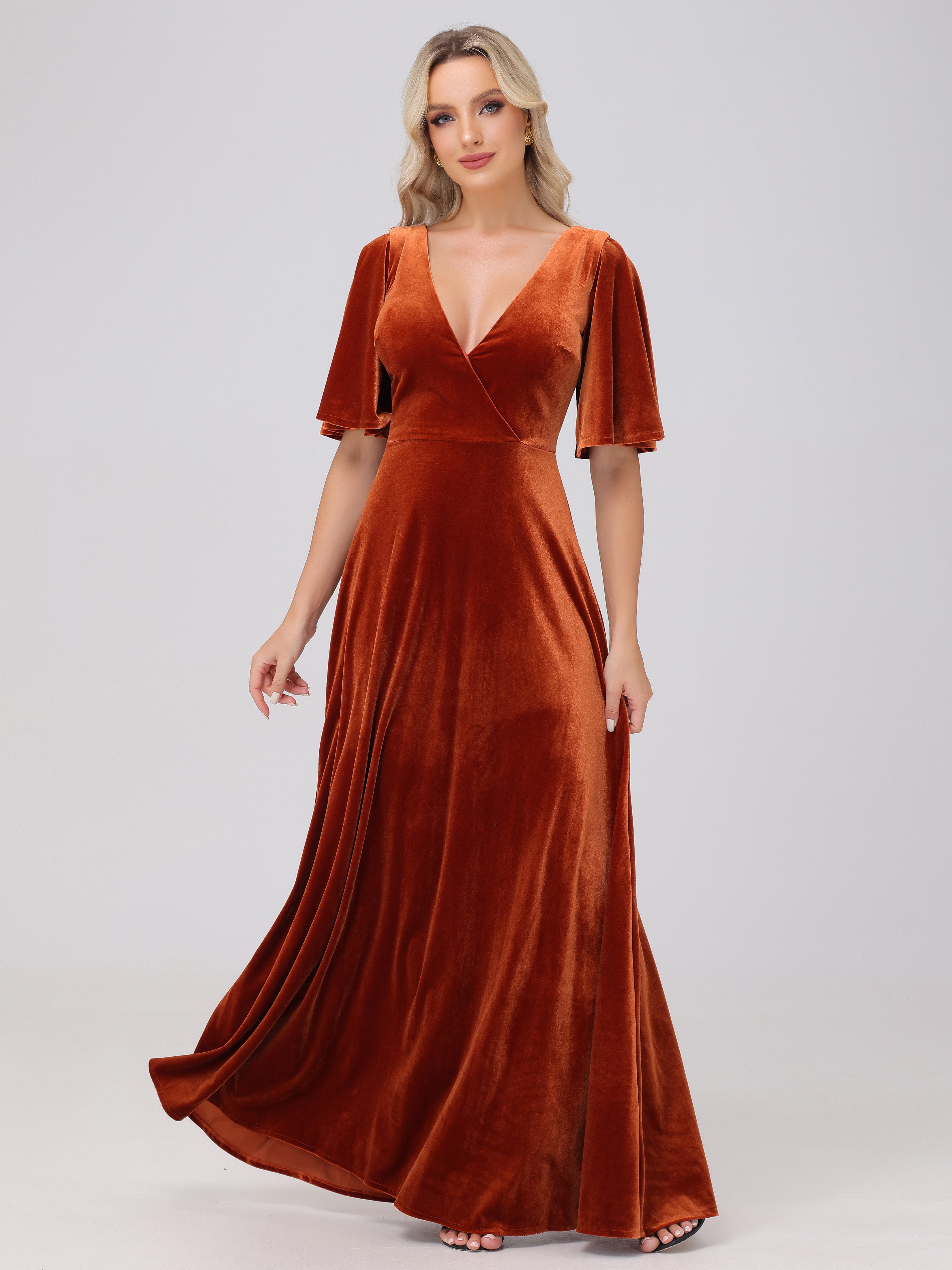 A-Line Half Sleeves V-Neck Floor-Length Velvet Bridesmaid Dresses