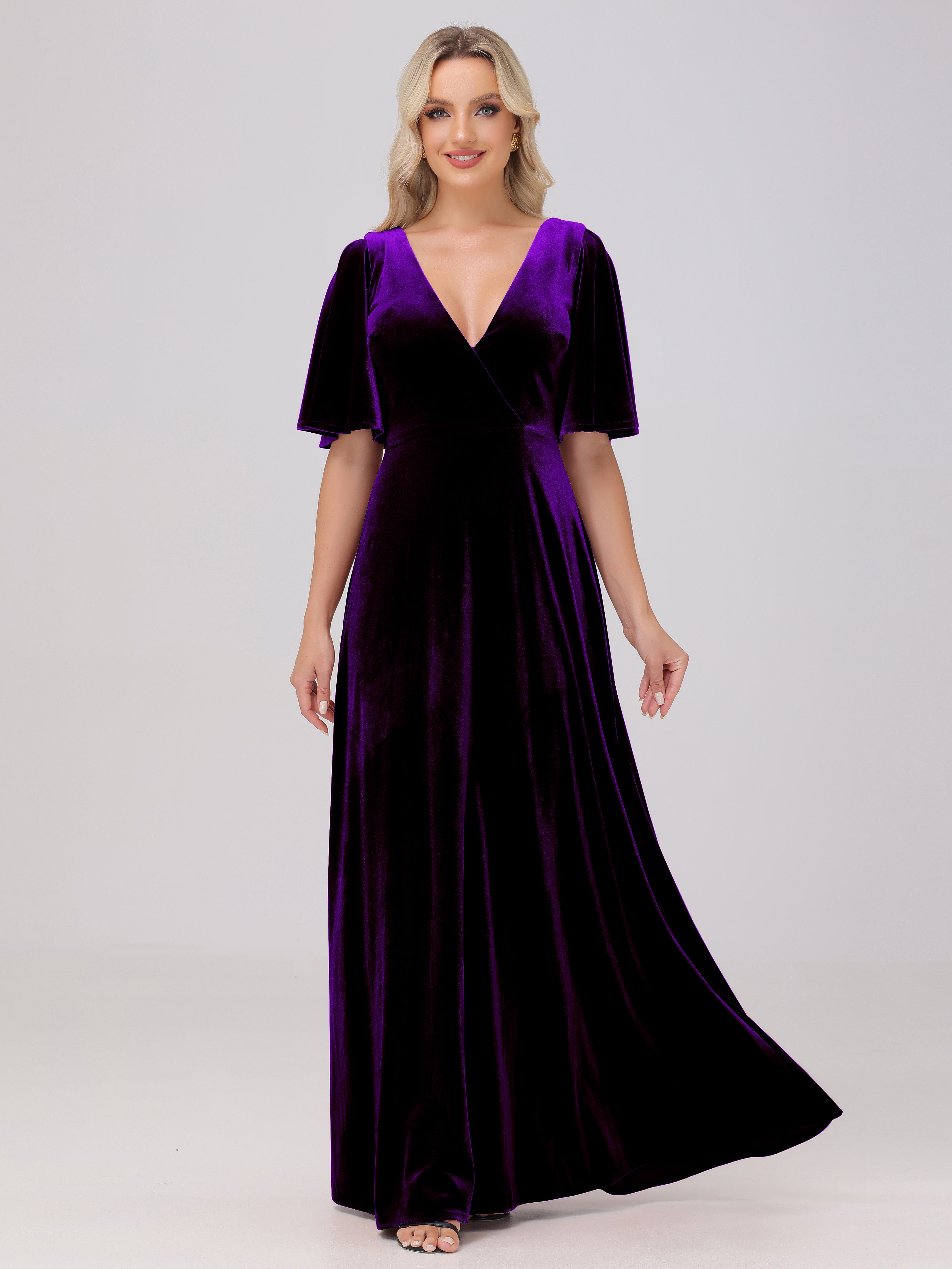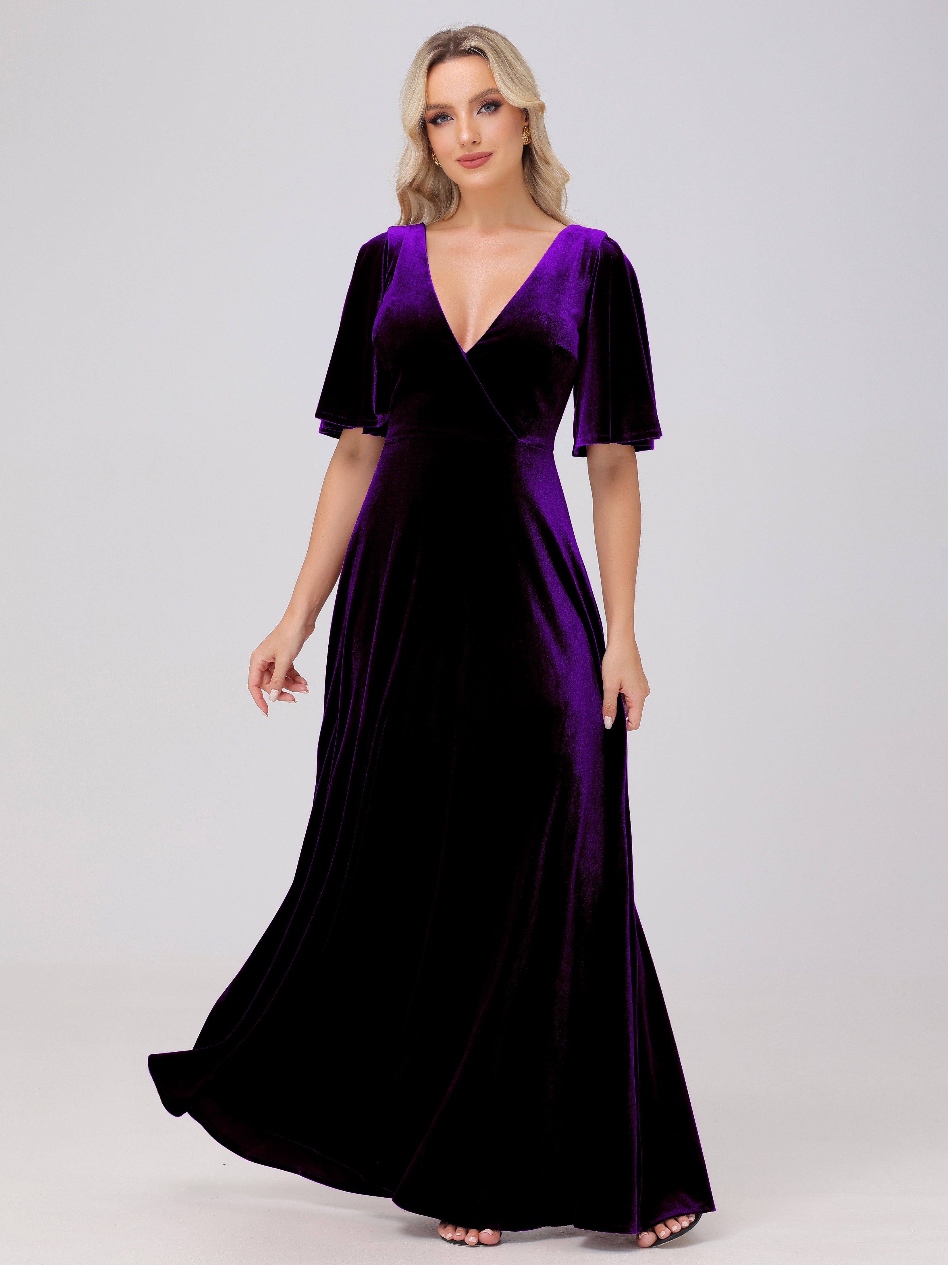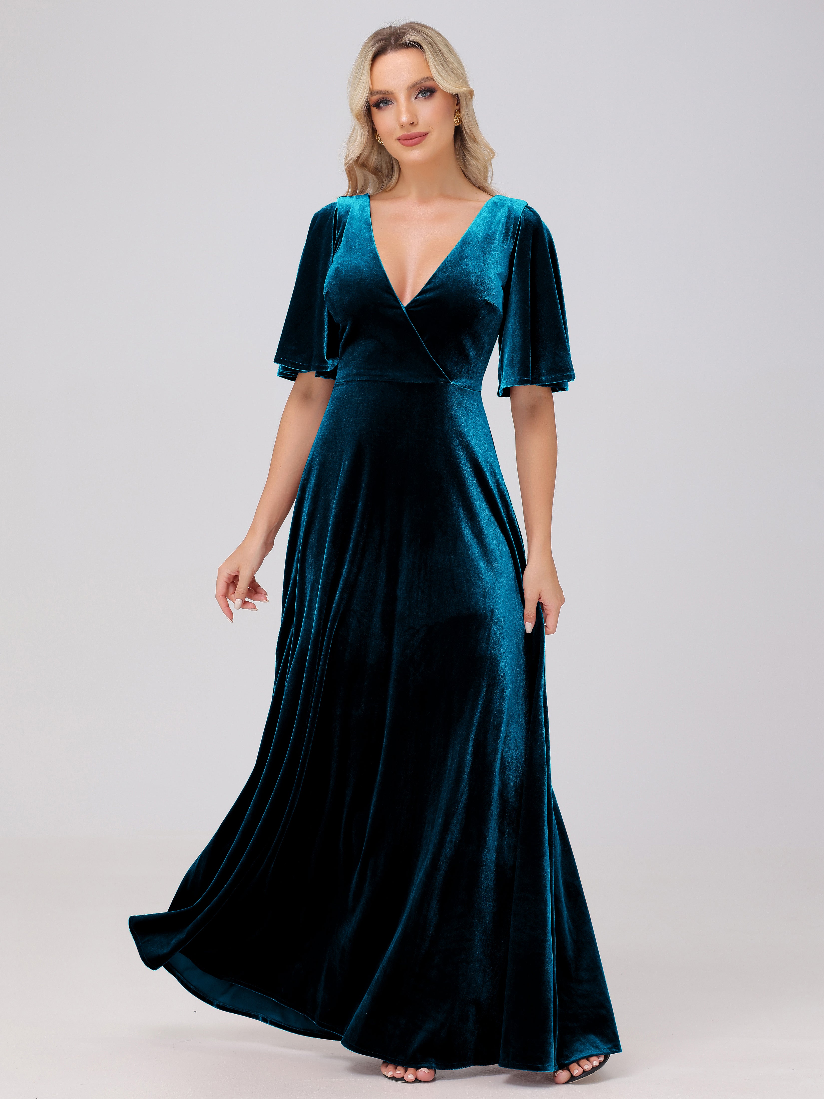 A-Line Half Sleeves V-Neck Floor-Length Velvet Bridesmaid Dresses