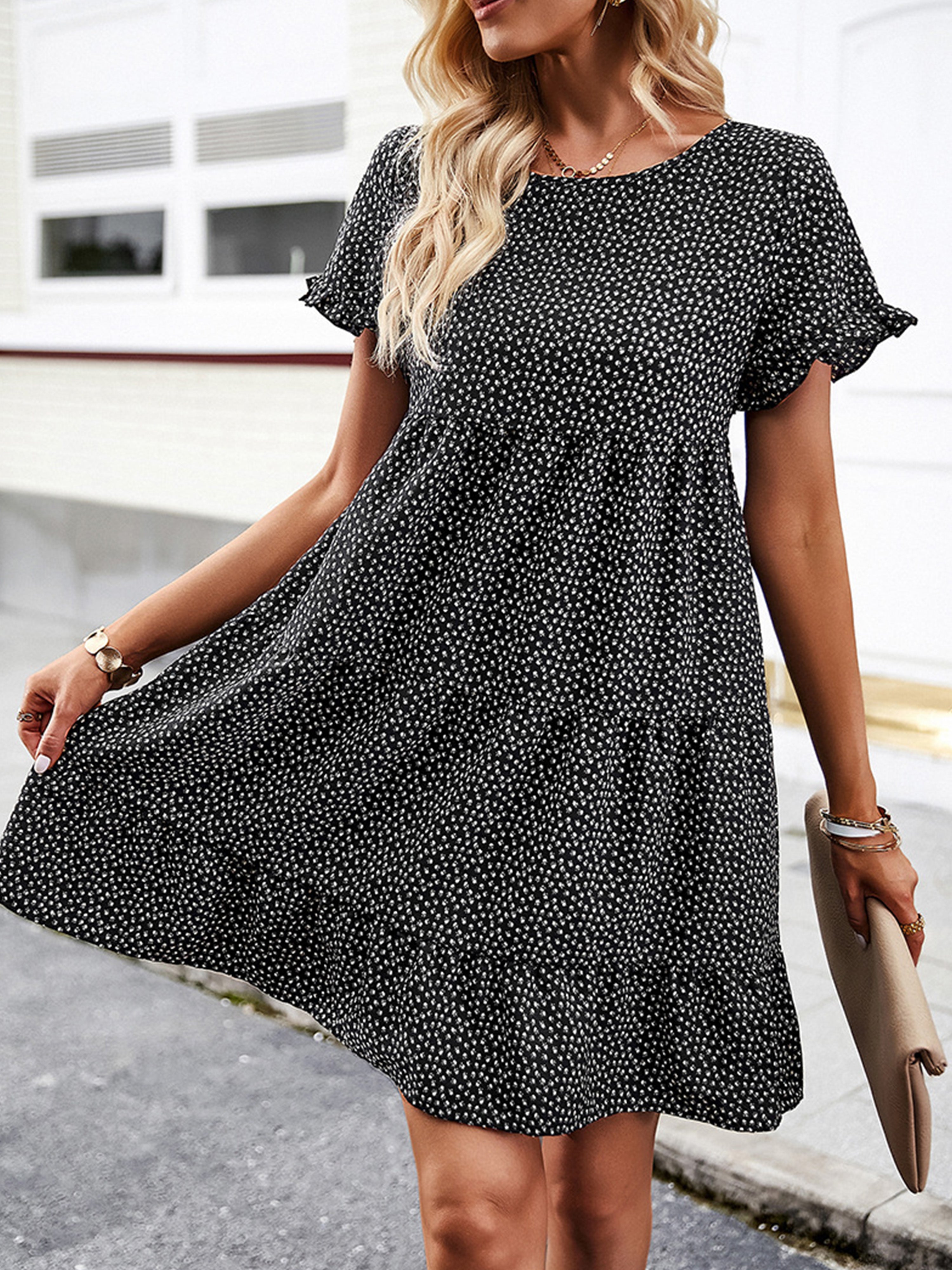 A Line Polka Dot Round Neck Black Short Sleeves Wedding Guest Dress