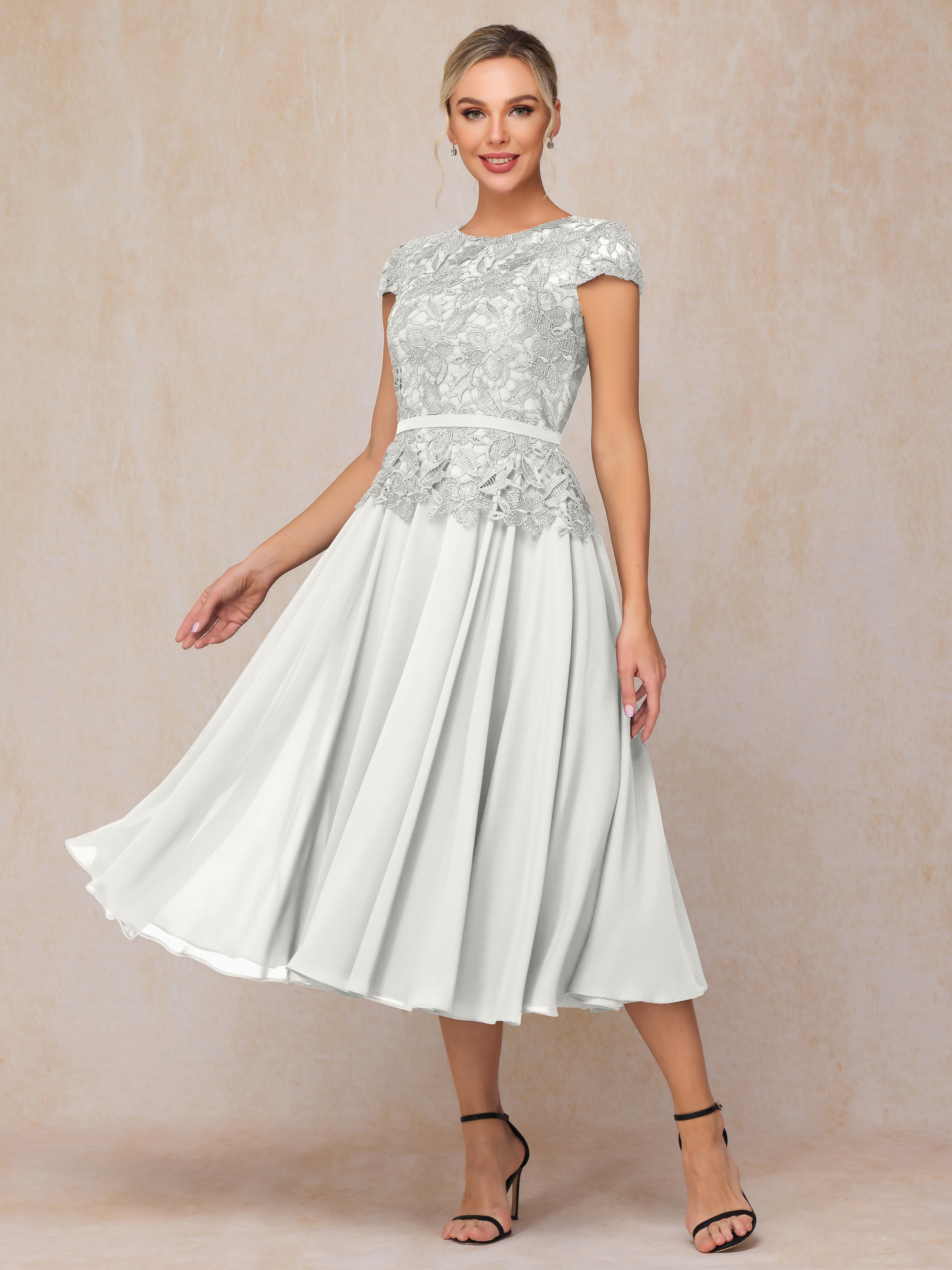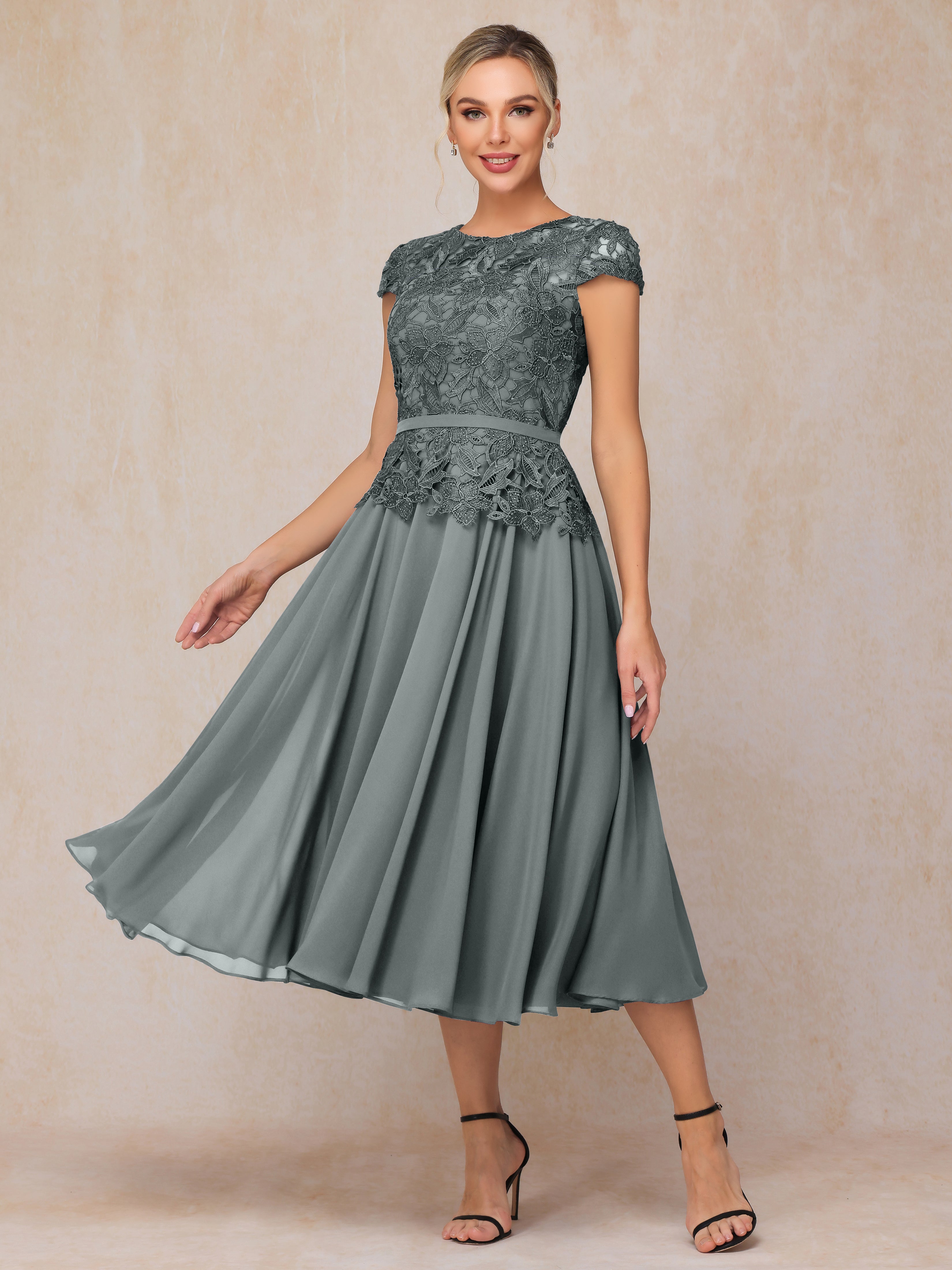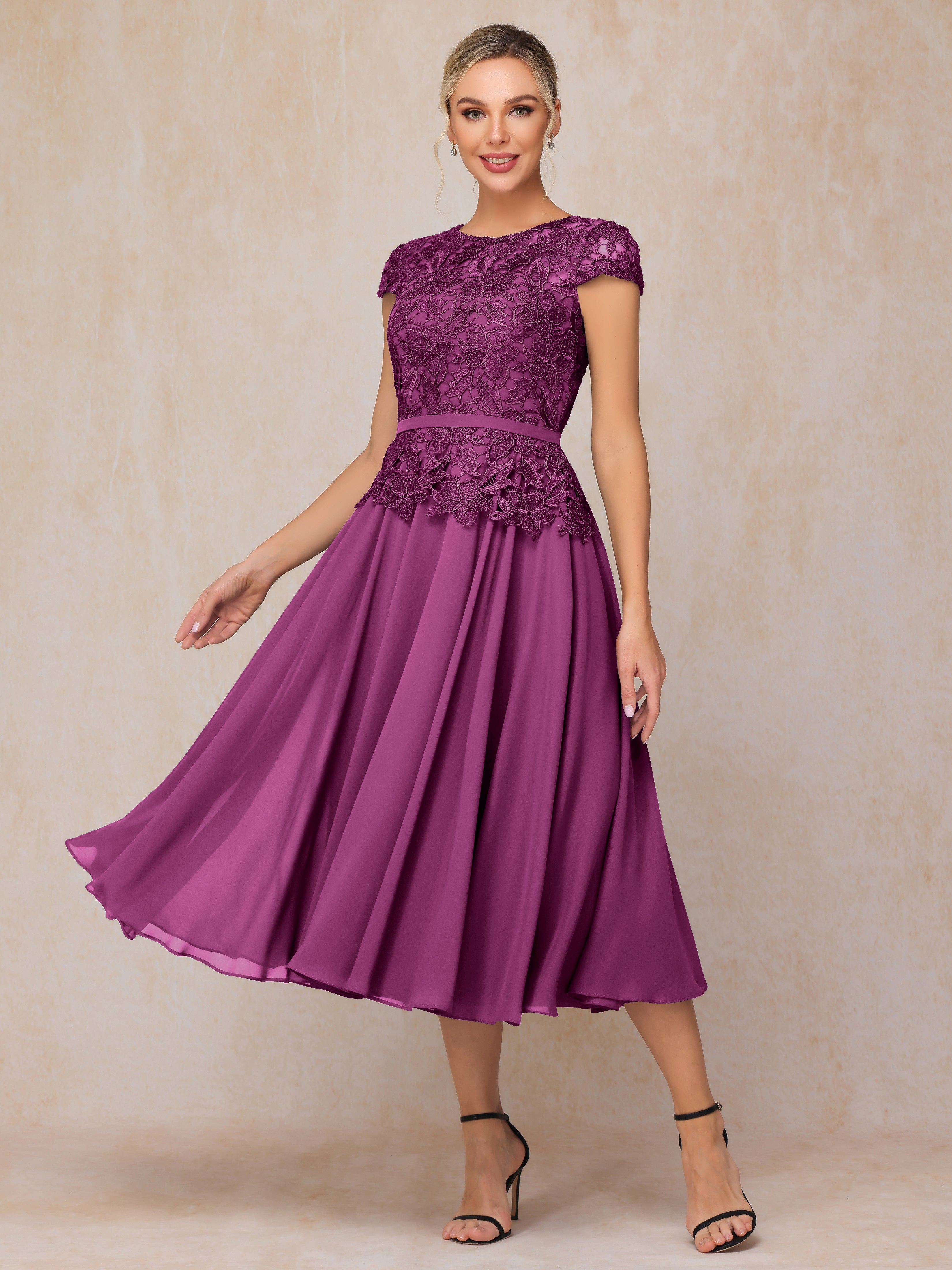 A-Line Scoop Tea-Length Chiffon Mother of the Bride Dresses With Lace