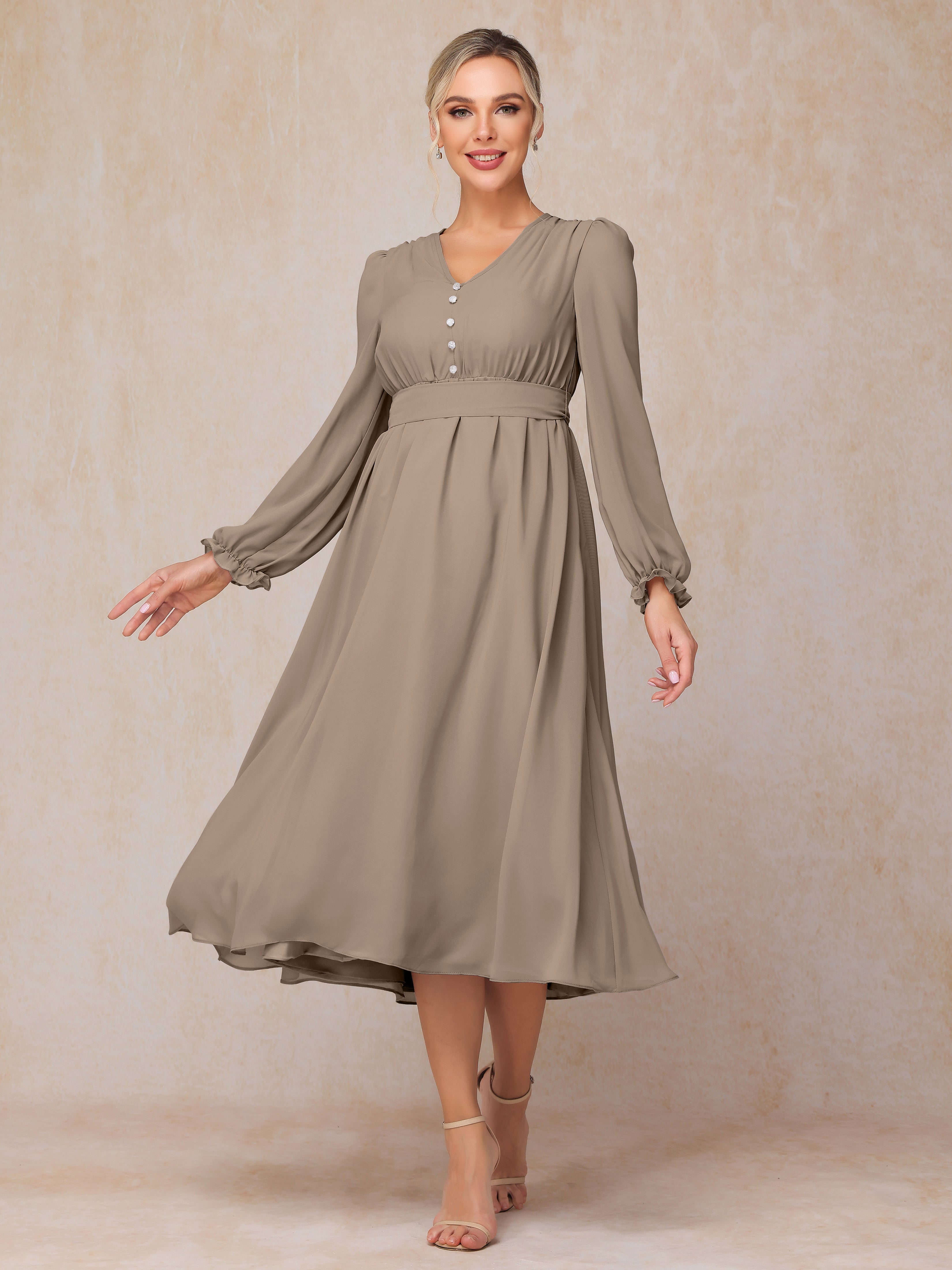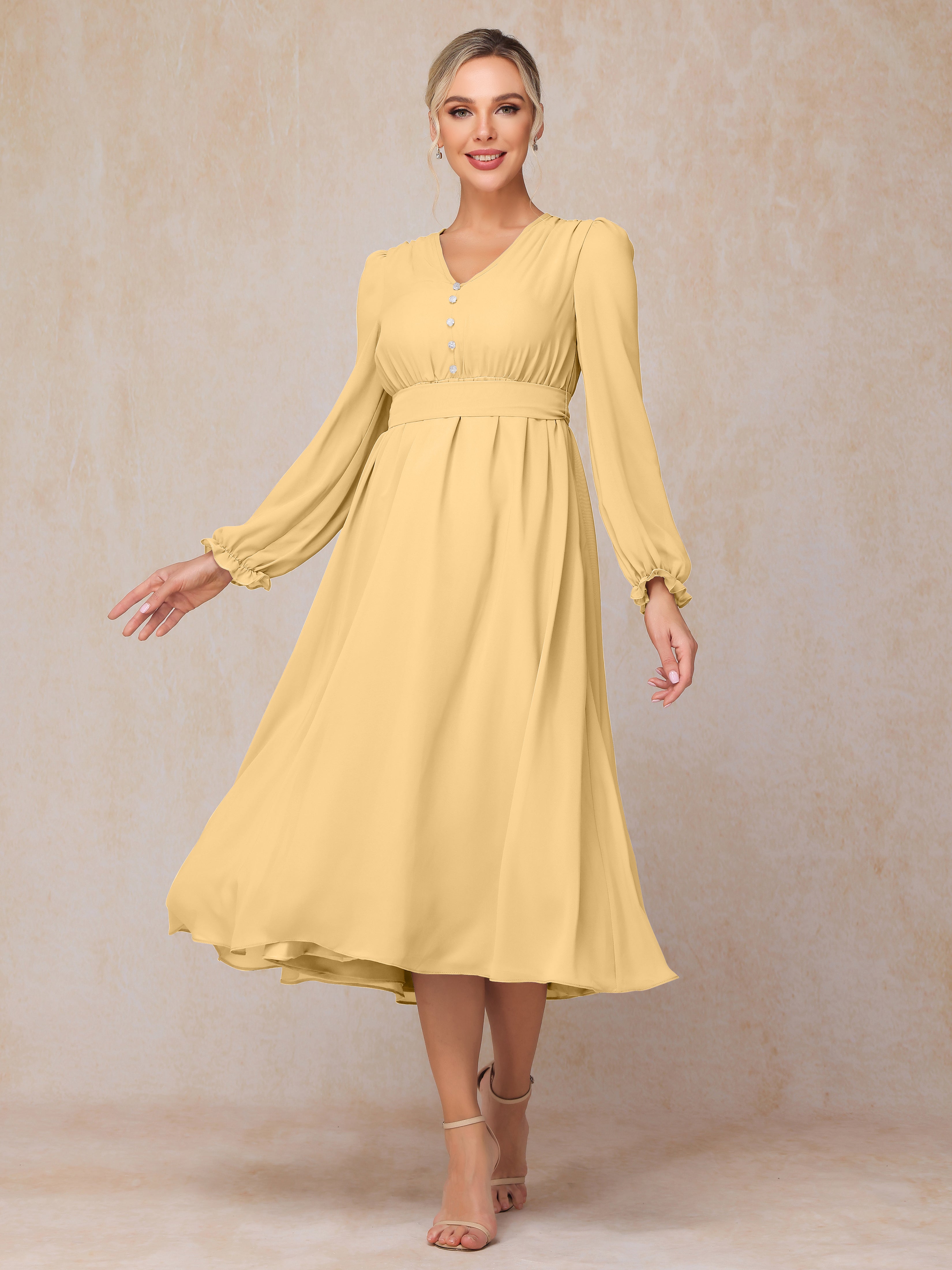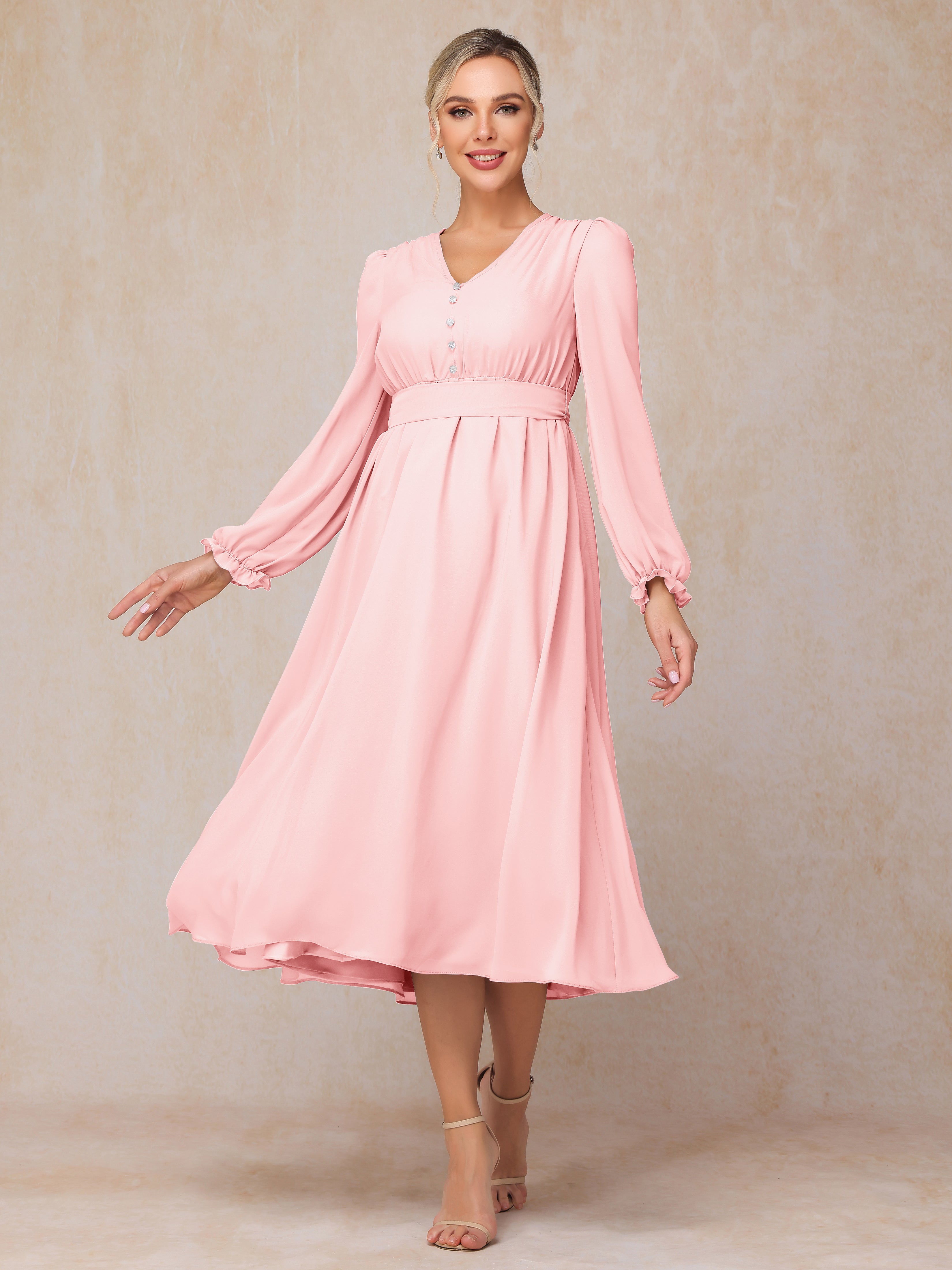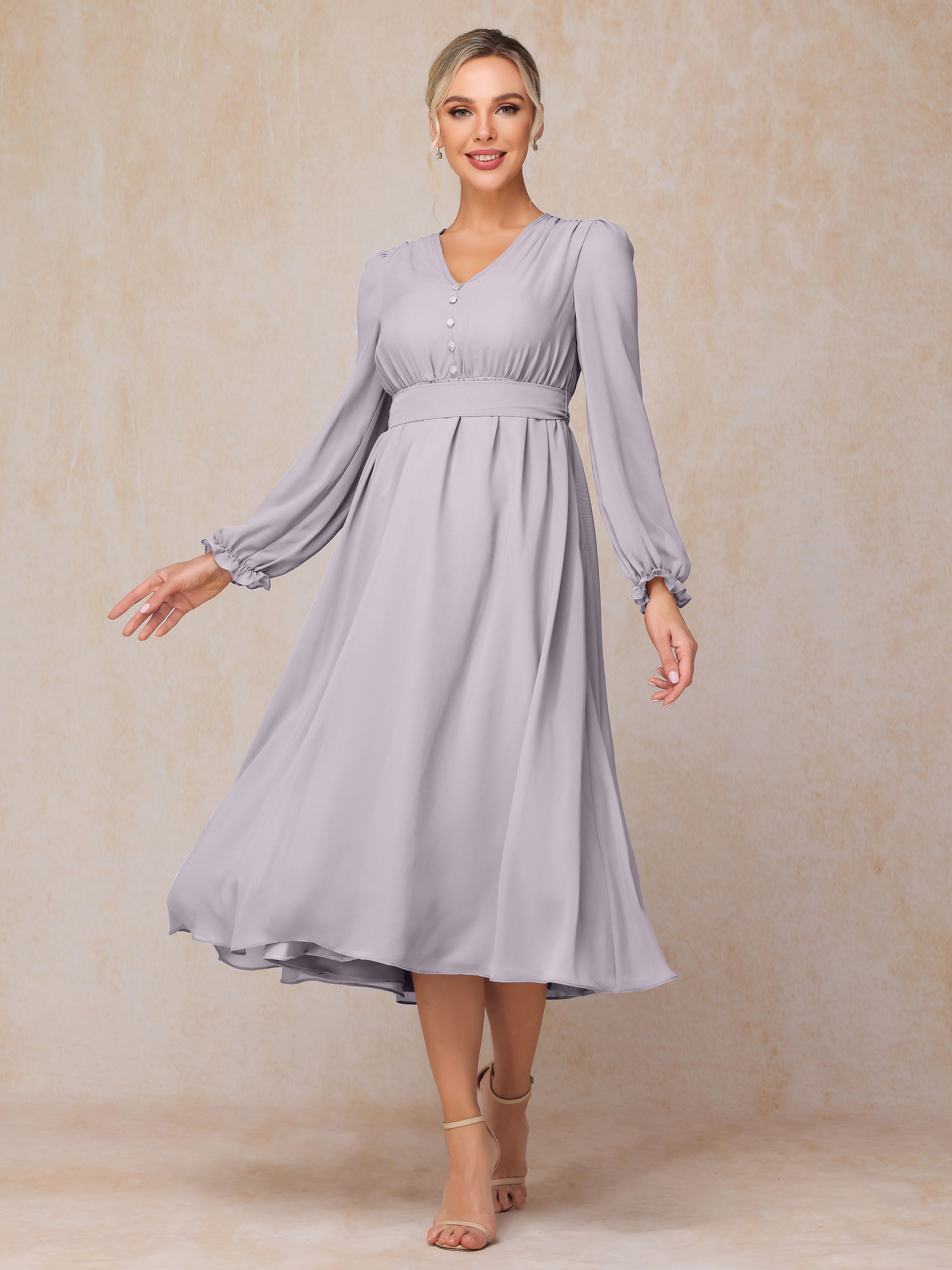 A-Line V Neck Tea-Length Chiffon Mother of the Bride Dresses With Belt