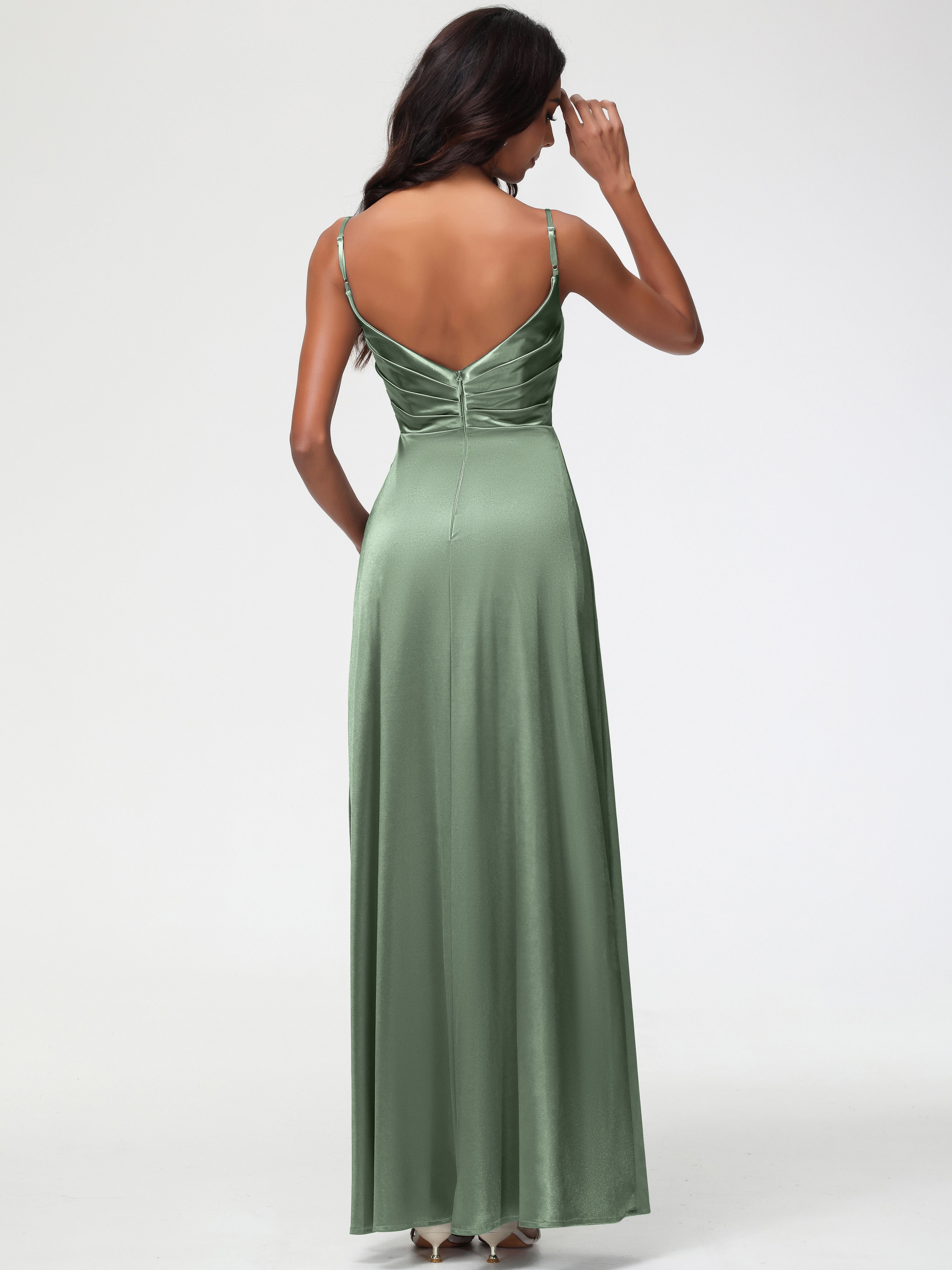 Bridesmaid Dress Dusty Sage Spaghetti Straps Pleated Sleeveless V-Neck Long Stretch Satin Bridesmaid Dresses