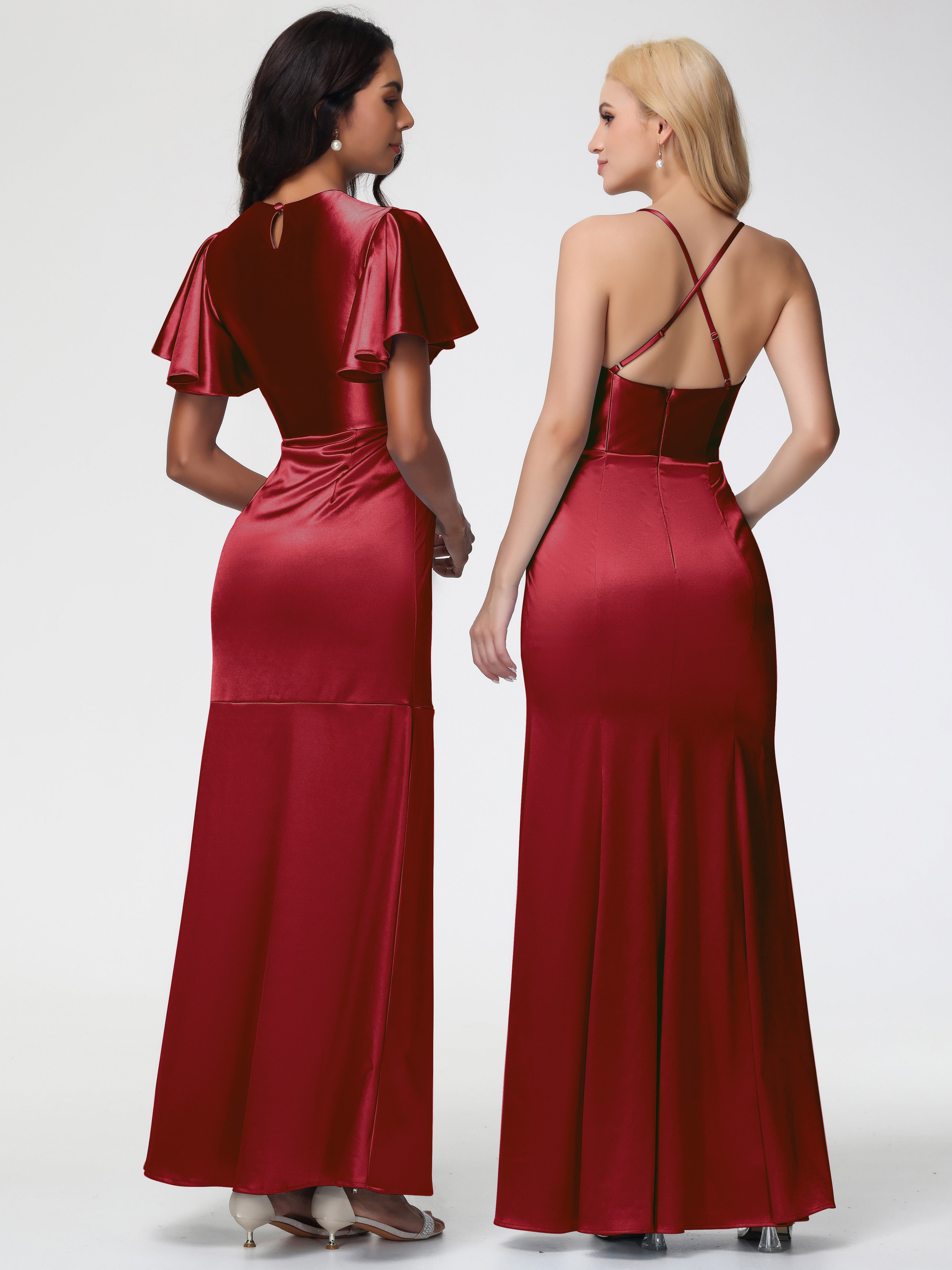 Burgundy Bridesmaid Dresses With Sleeves Short Sleeves Trumpet/Mermaid Zipper Split Long Stretch Satin Bridesmaid Dresses