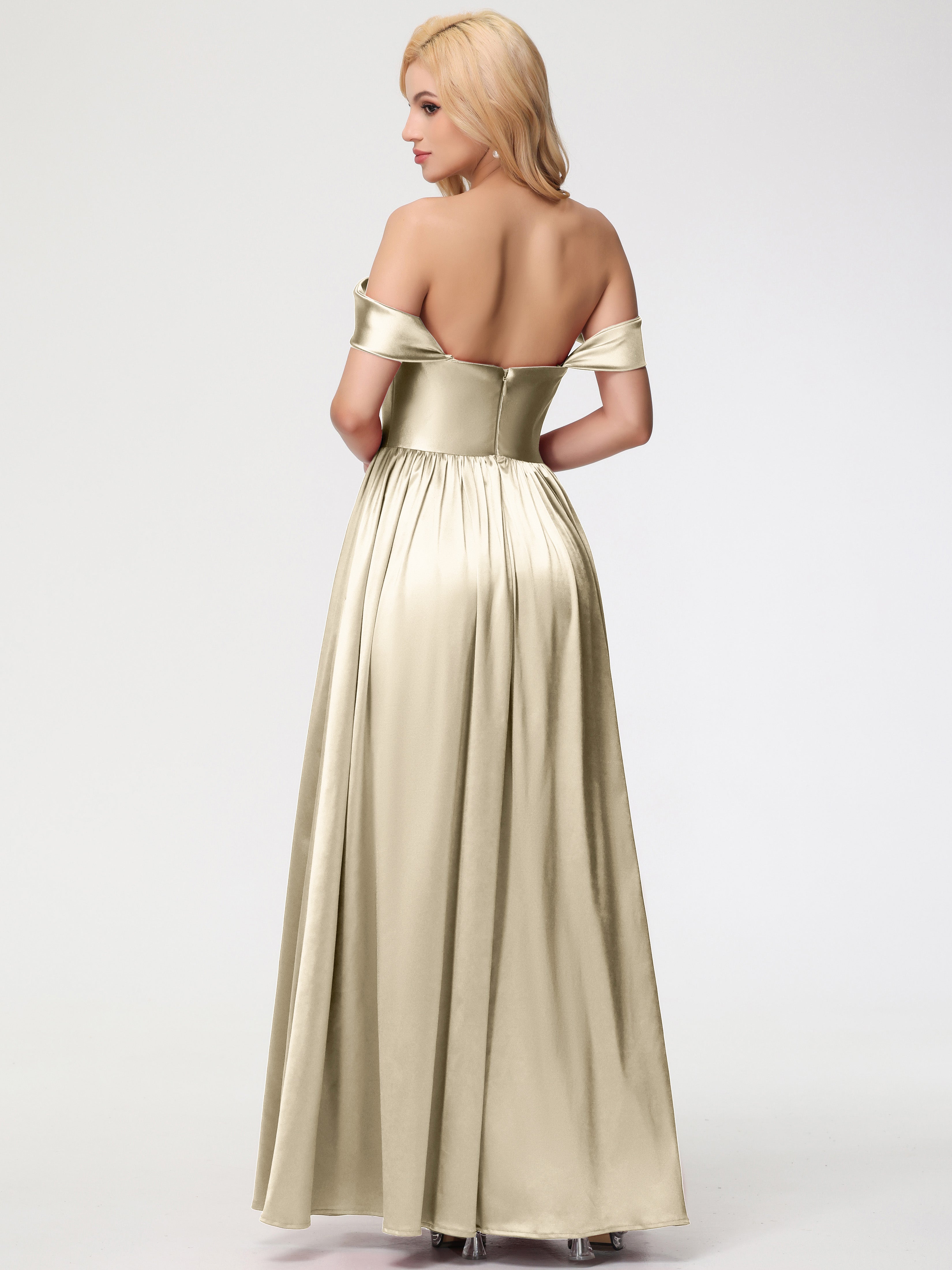 Champagne Bridesmaid Dress Off The Shoulder A-Line Strapless Long Stretch Satin Bridesmaid Dresses