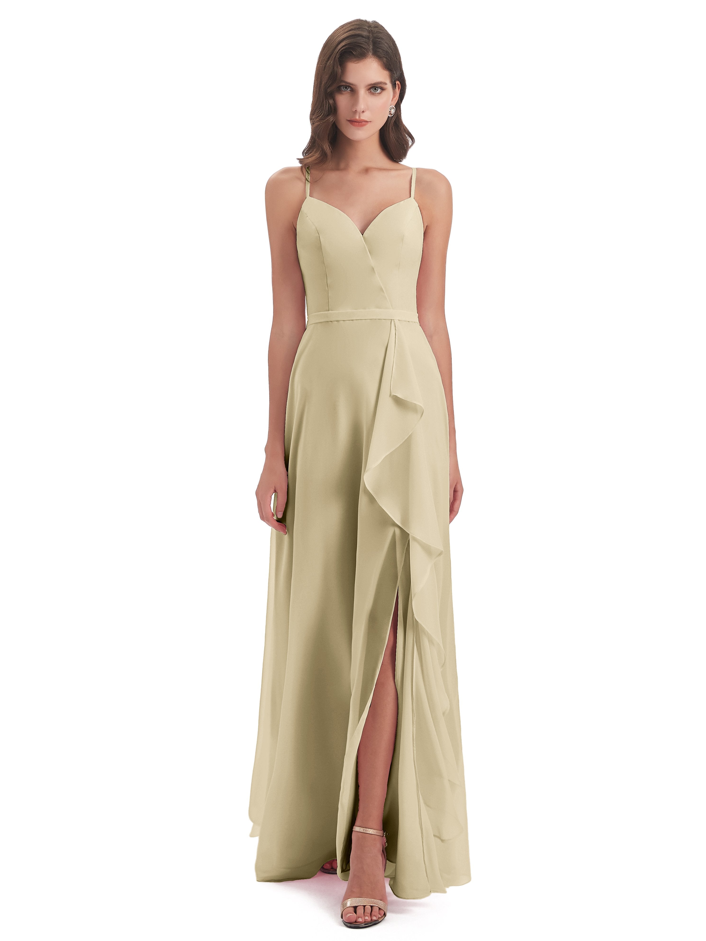Champagne Color Bridesmaids Dresses Chiffon Spaghetti Straps Long Bridesmaid Dresses