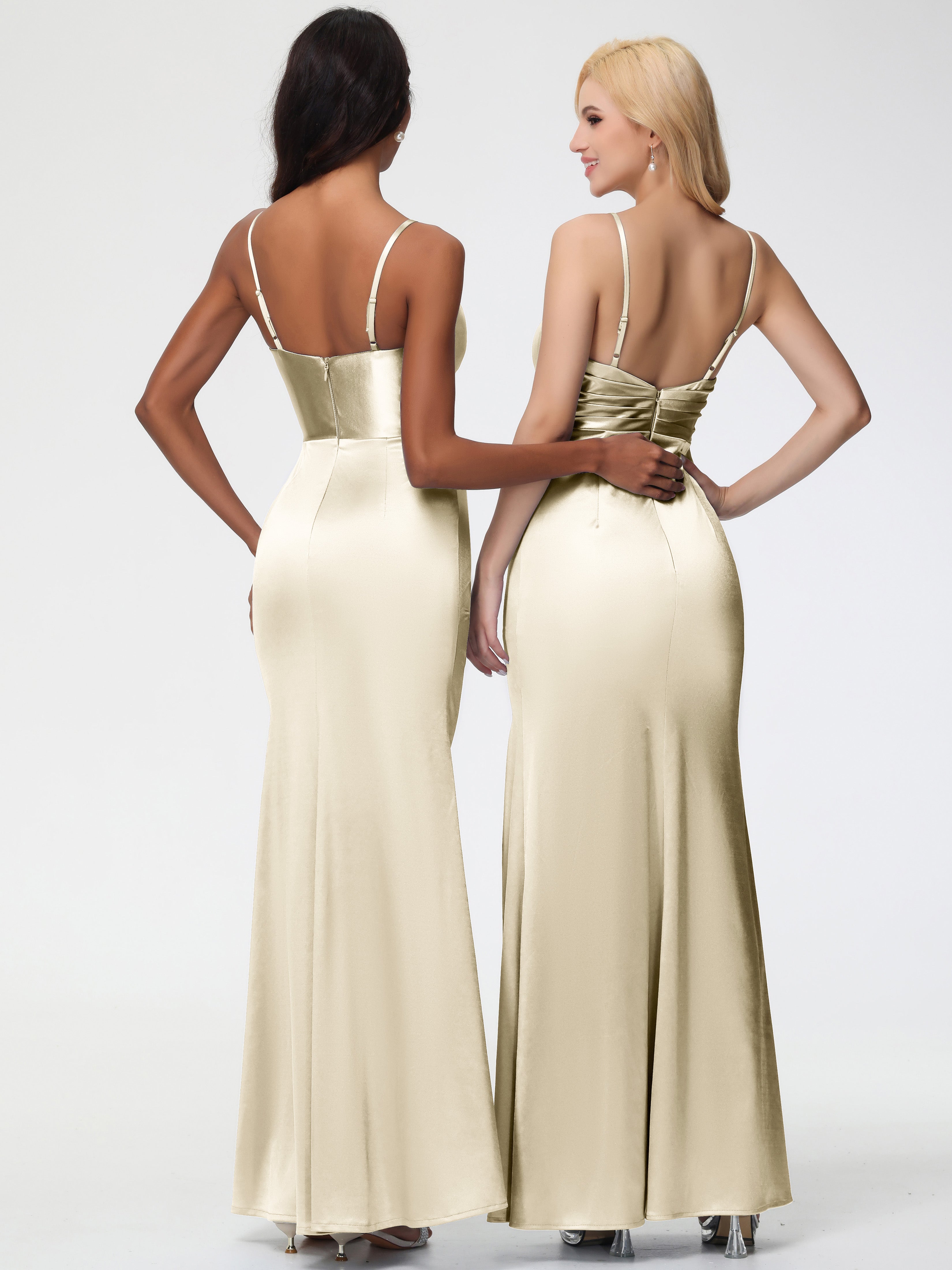 Champagne Satin Bridesmaid Dresses V-Neck Sleeveless Spaghetti Straps Trumpet/Mermaid Split Stretch Satin Bridesmaid Dresses