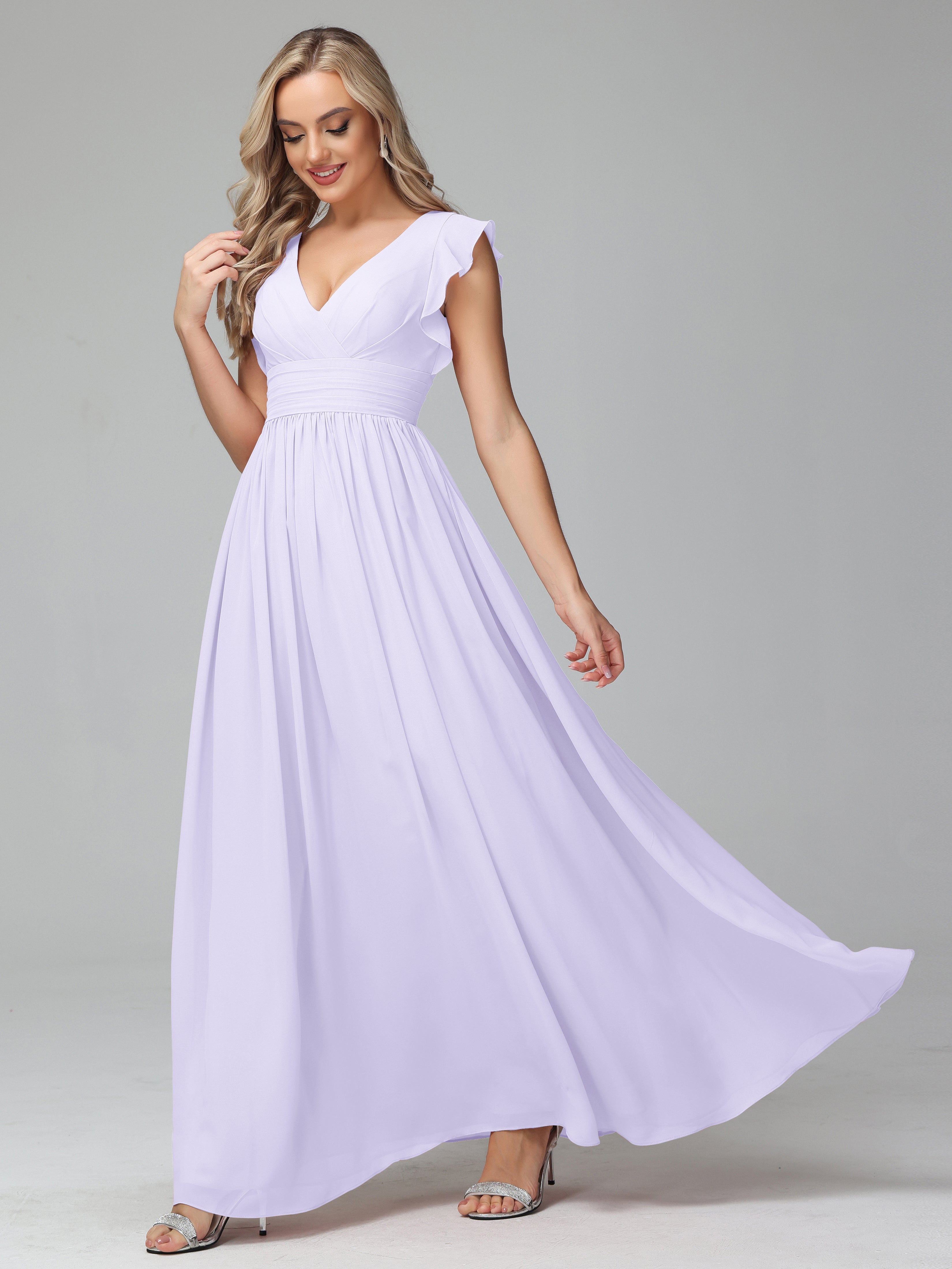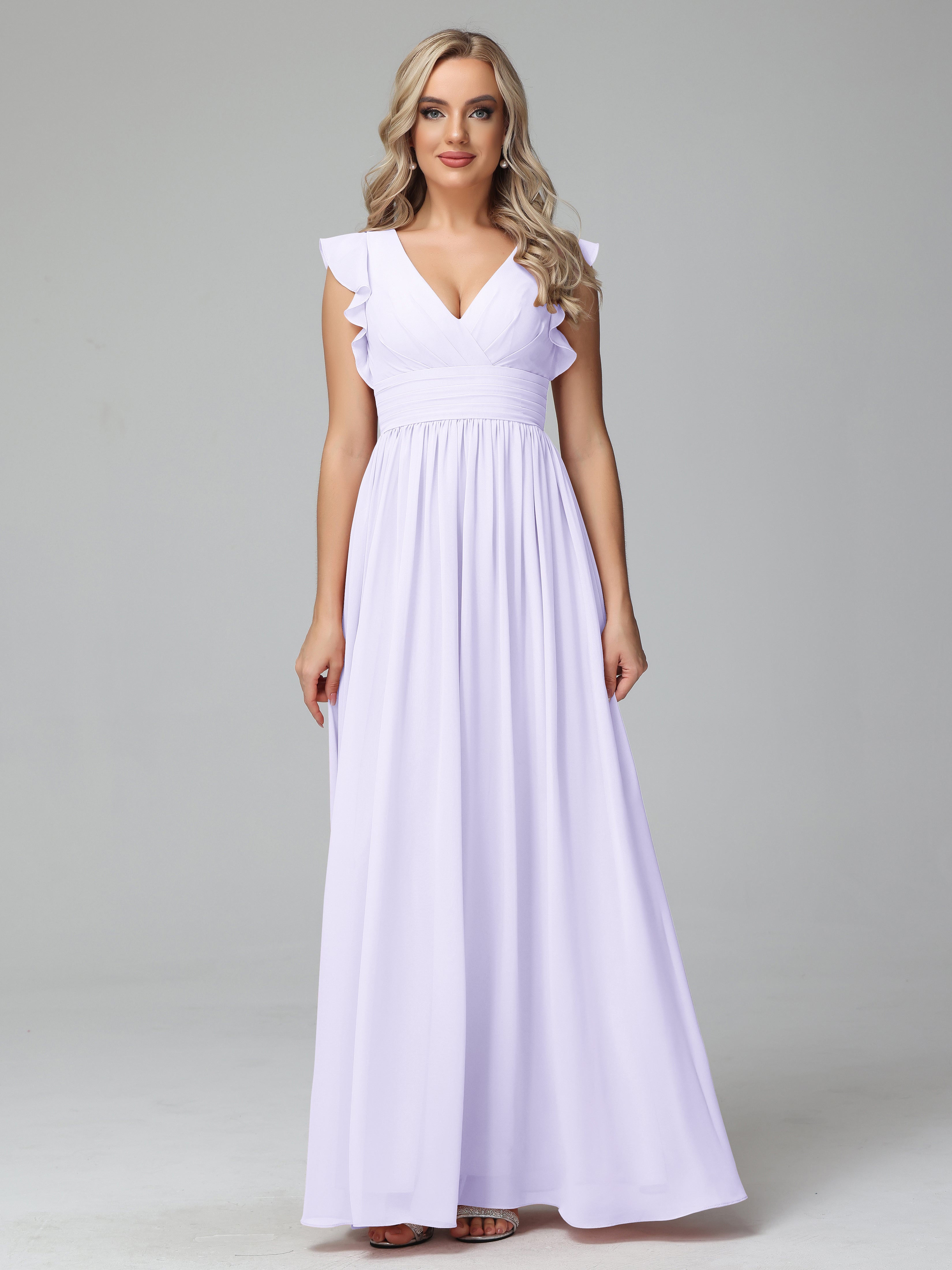 Girls Lilac Bridesmaid Dresses Bonnie V-Neck Chiffon Bridesmaid Dresses With Ruffle Sleeves