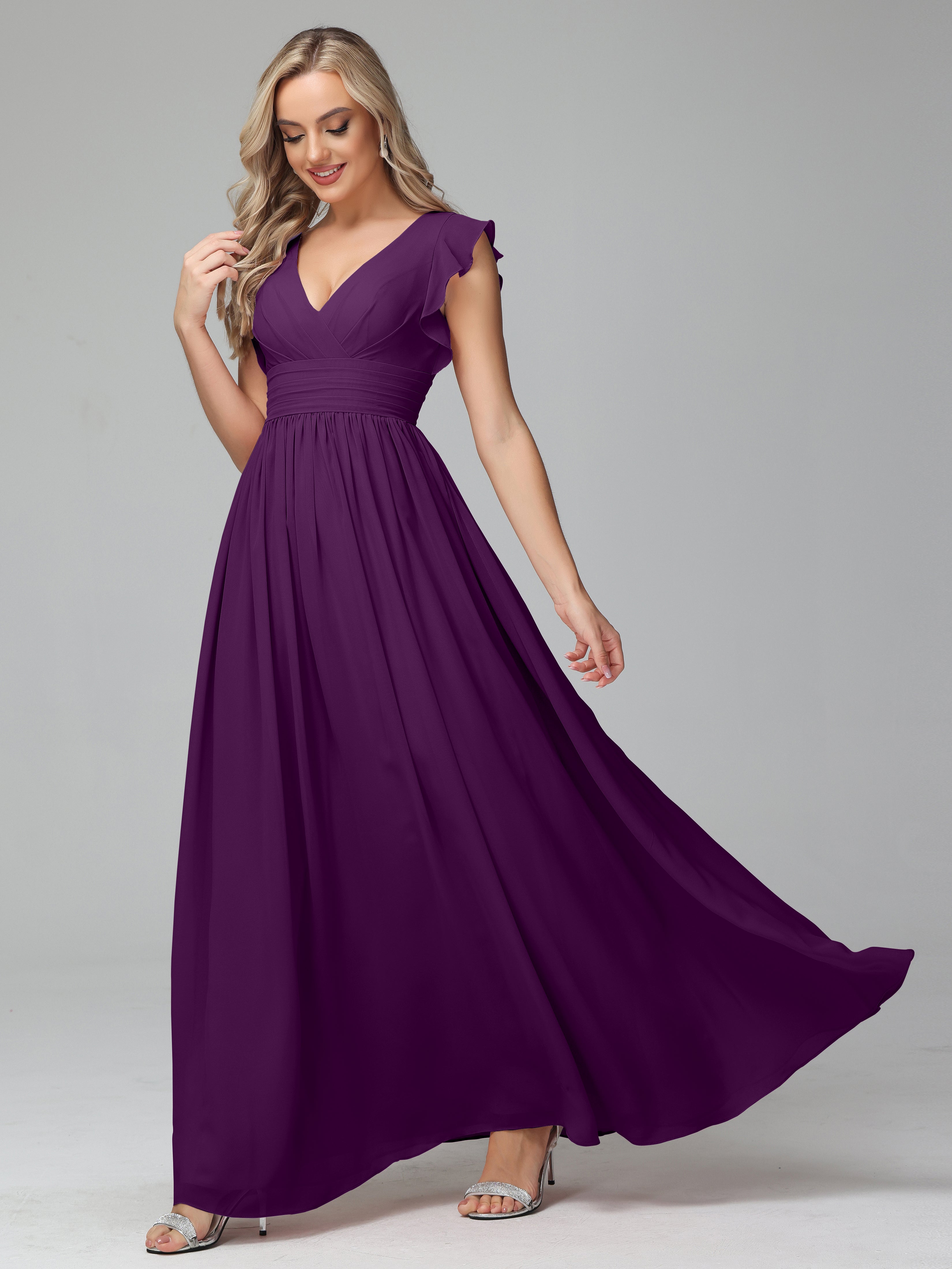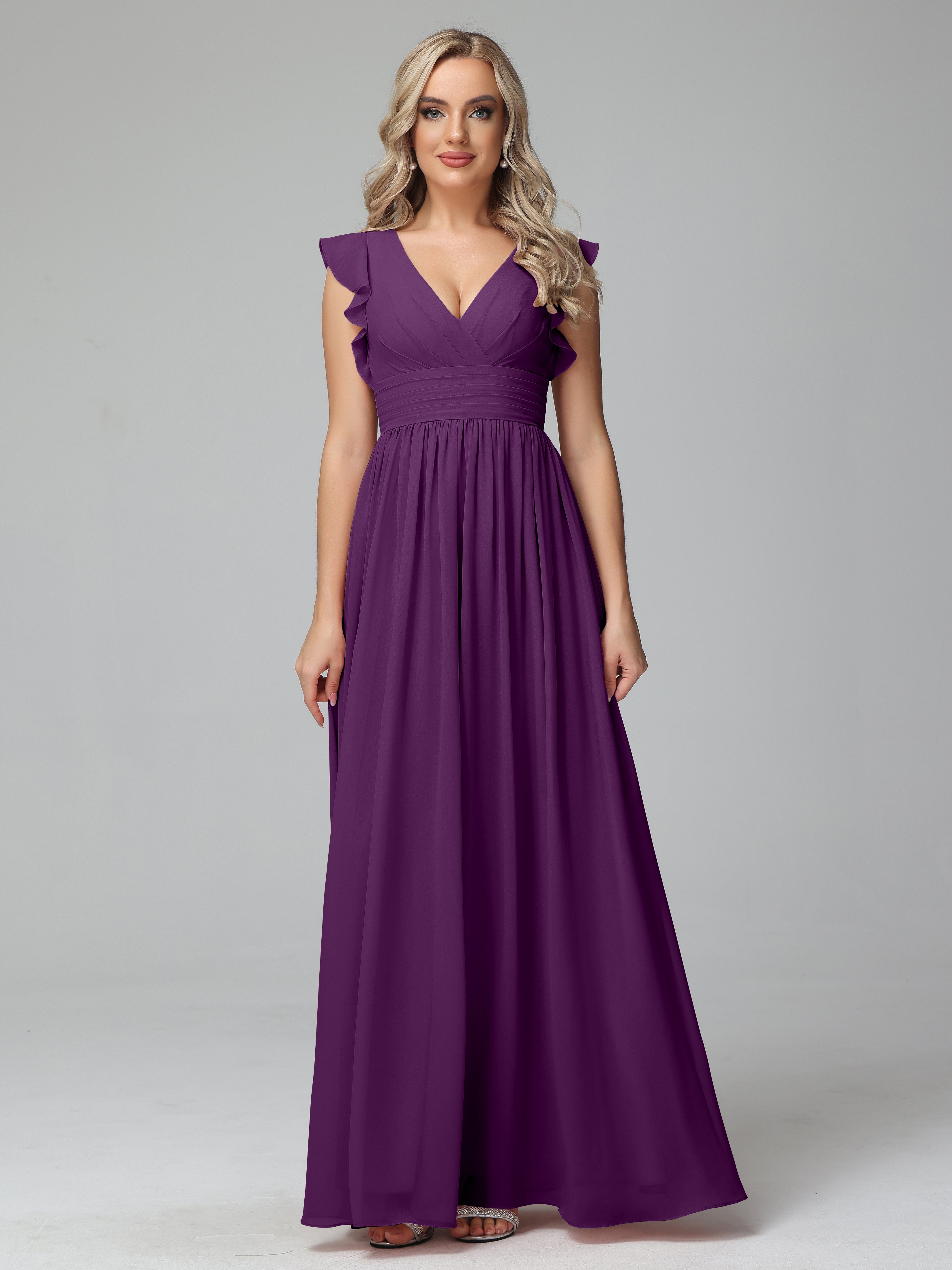 Grape Bridesmaid Bonnie V-Neck Chiffon Bridesmaid Dresses With Ruffle Sleeves