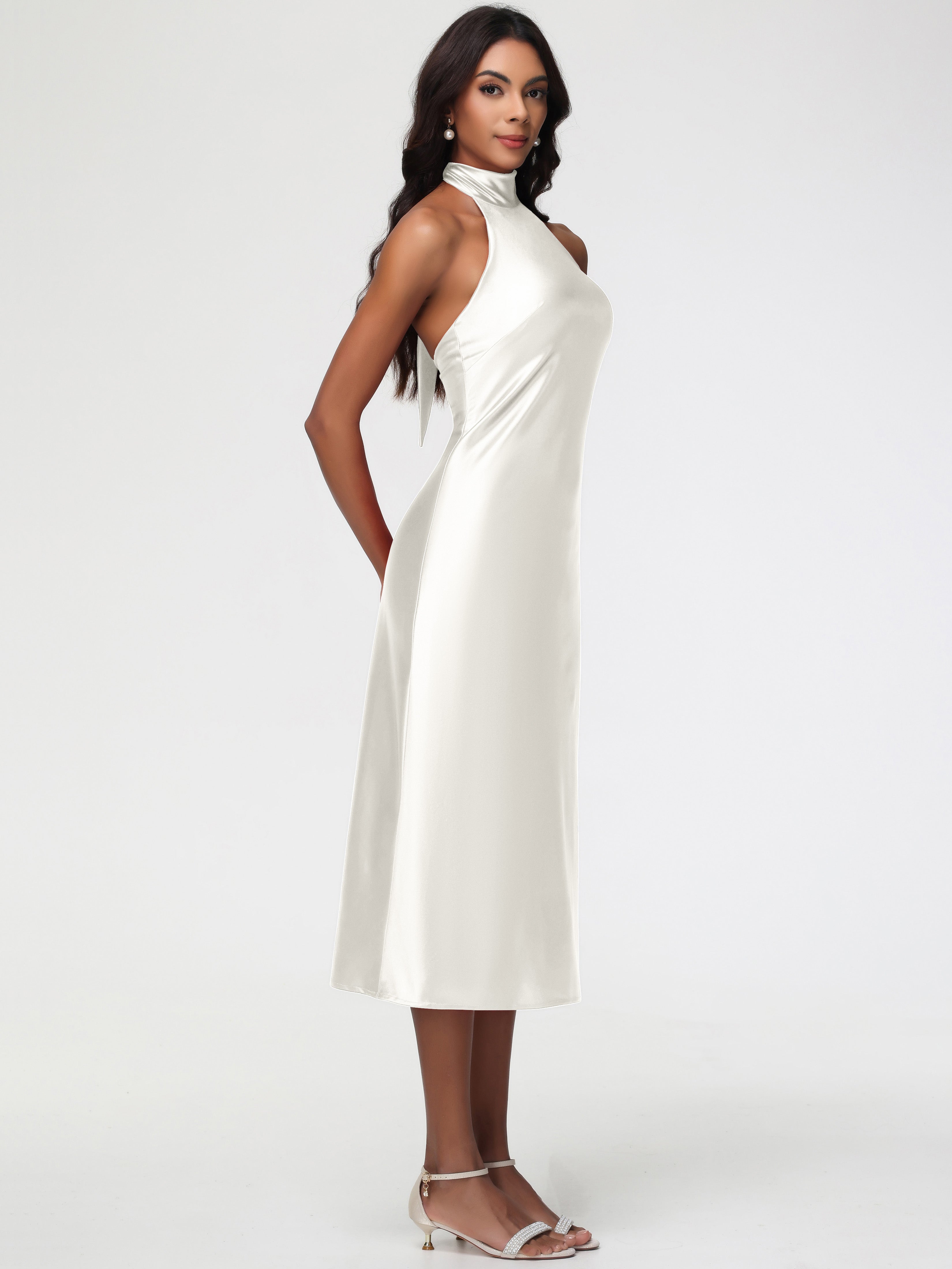 Ivory Bridesmaid Dresses Tea-Length High Neck Sleeveless Stretch Satin Bridesmaid Dresses