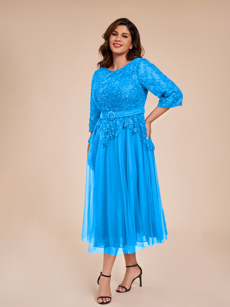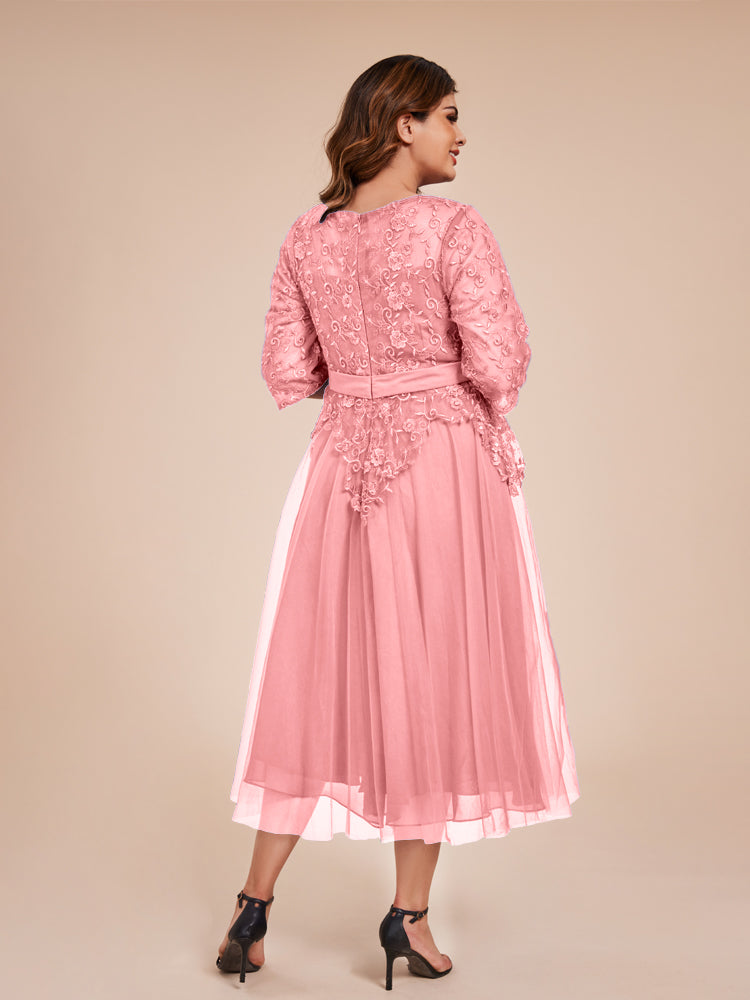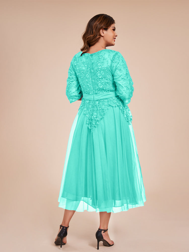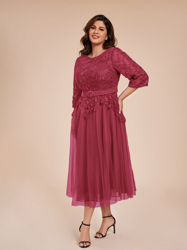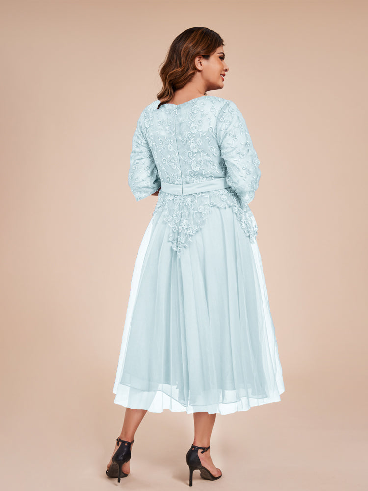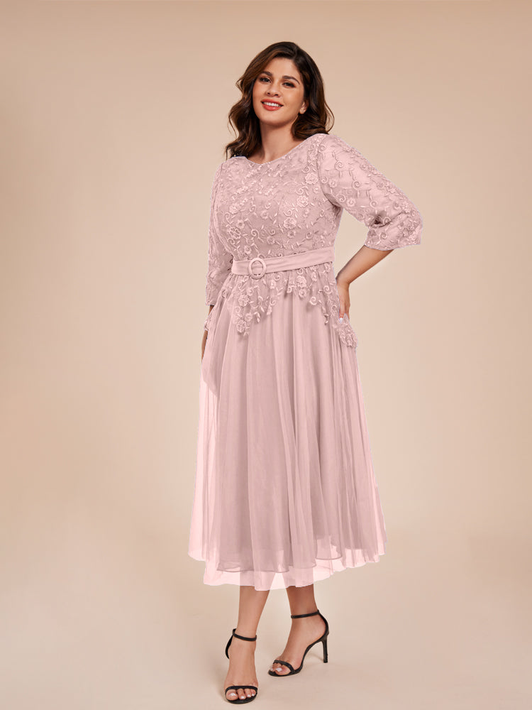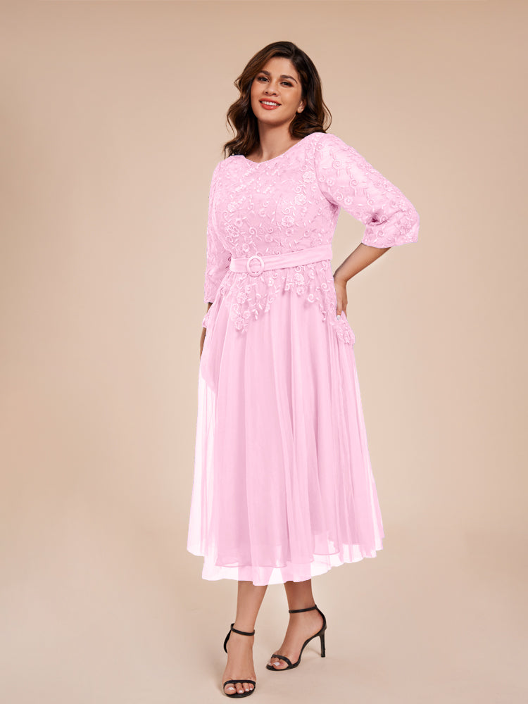 Lace Bodice 3/4 Length Sleeves Tea-Length Chiffon Mother Of The Bride Dress With Belt