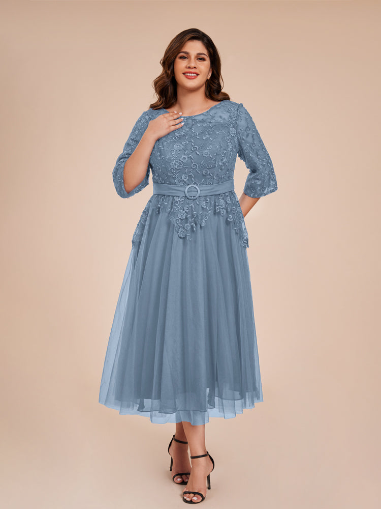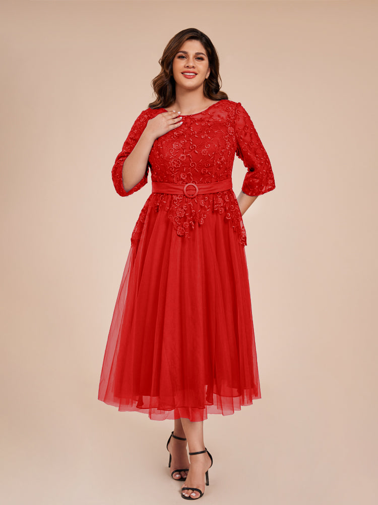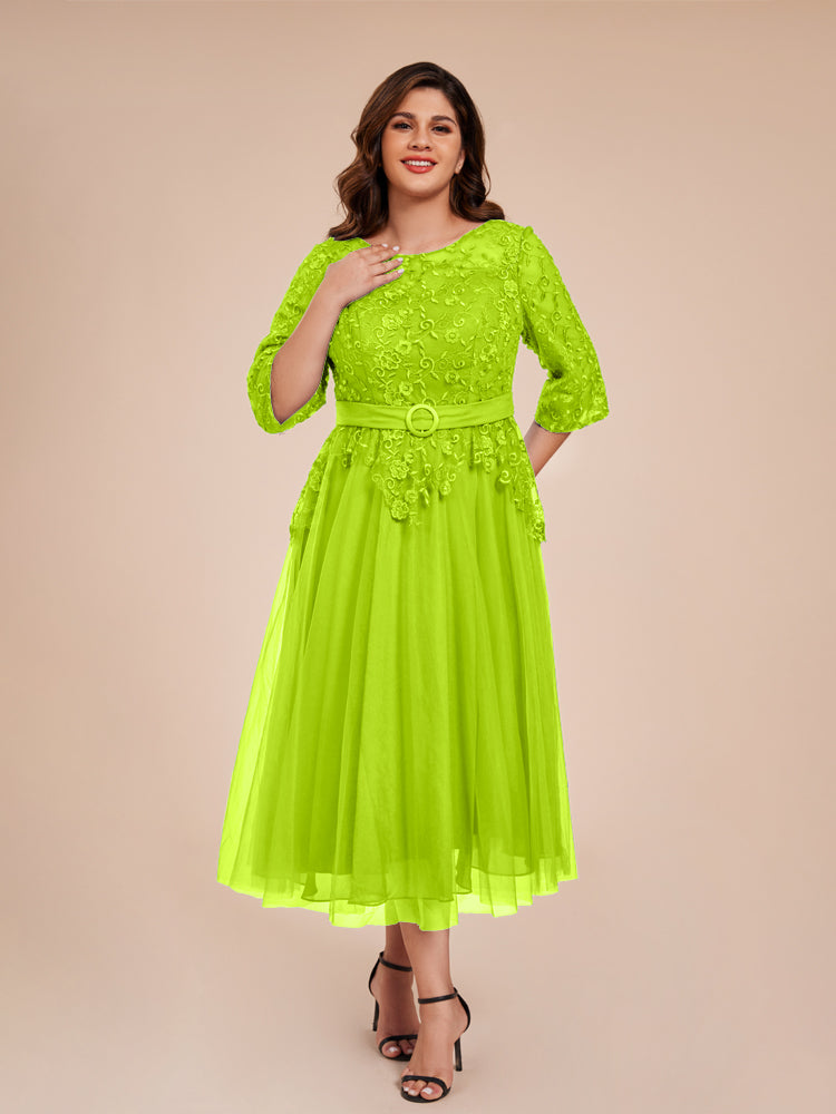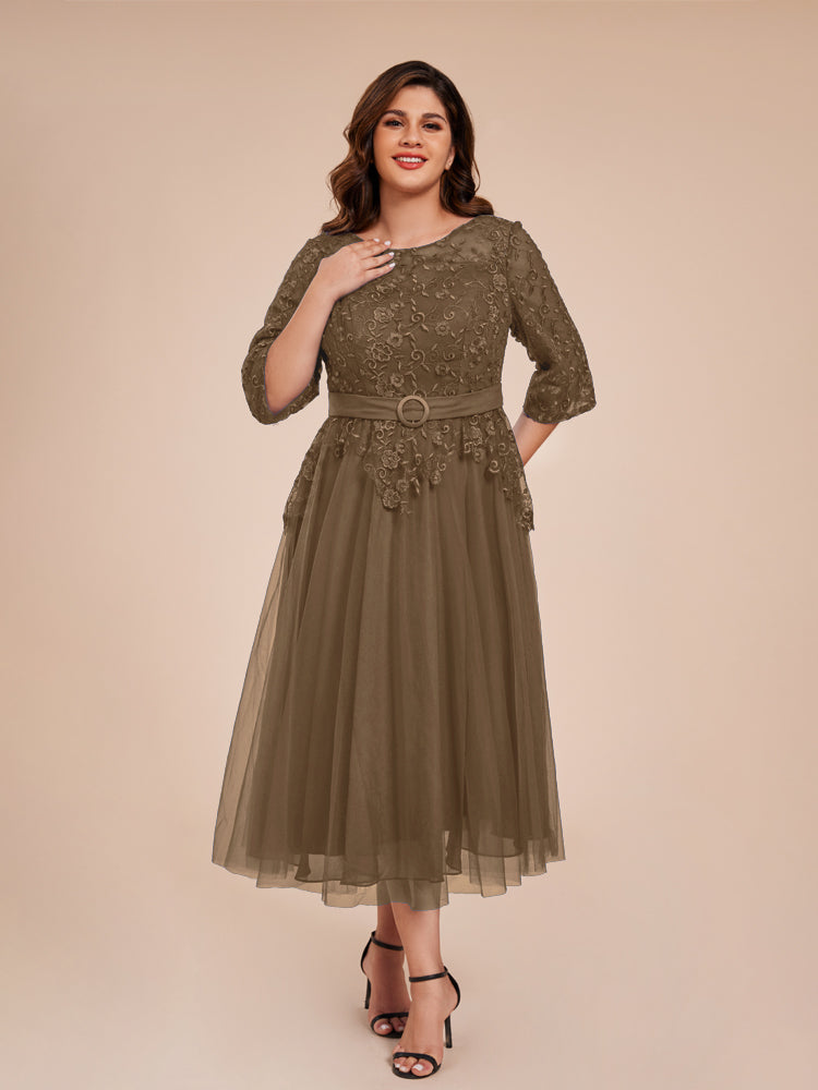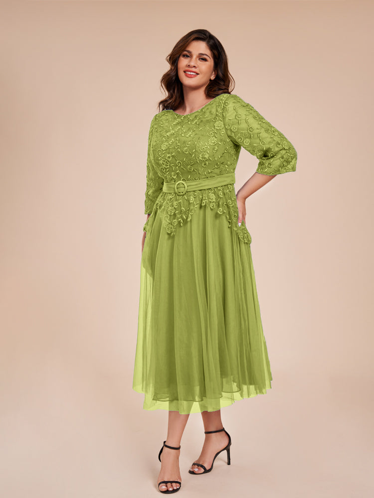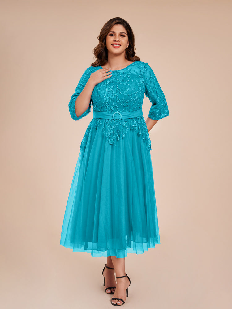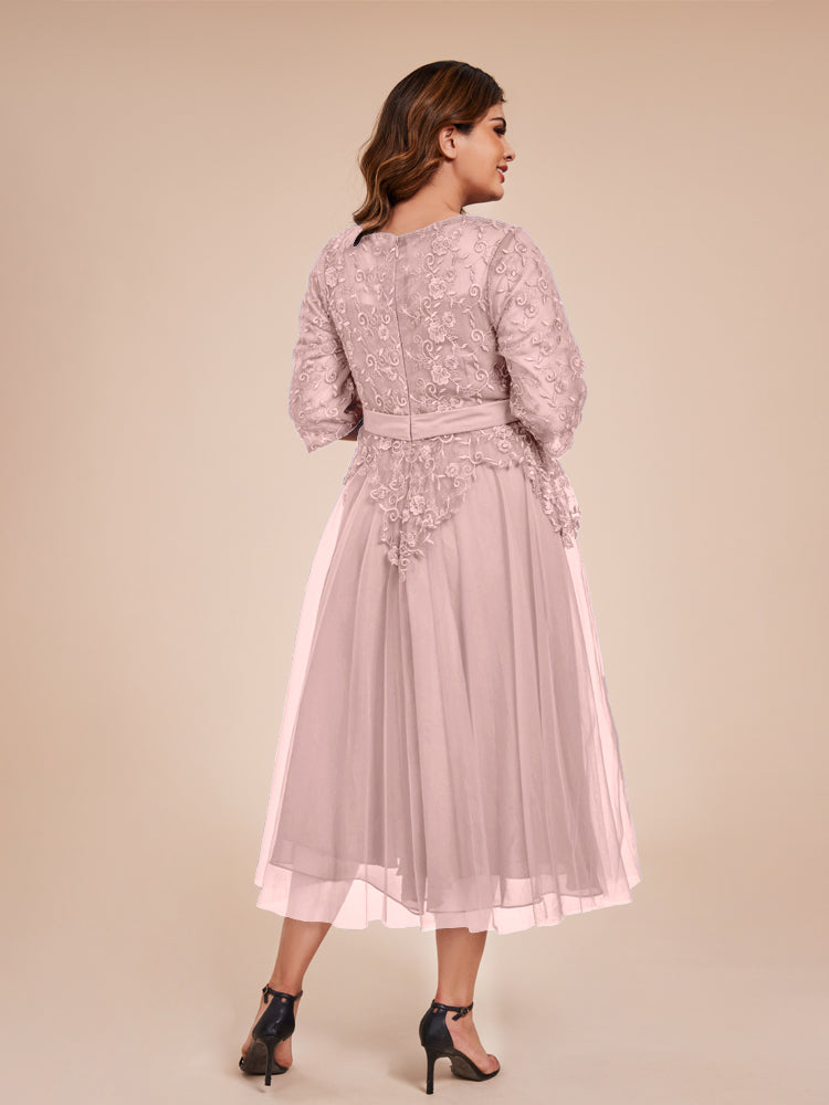 Lace Bodice 3/4 Length Sleeves Tea-Length Chiffon Mother Of The Bride Dress With Belt