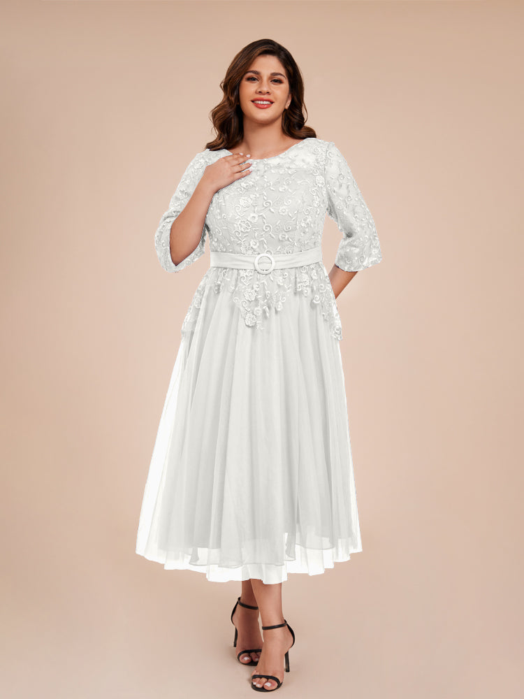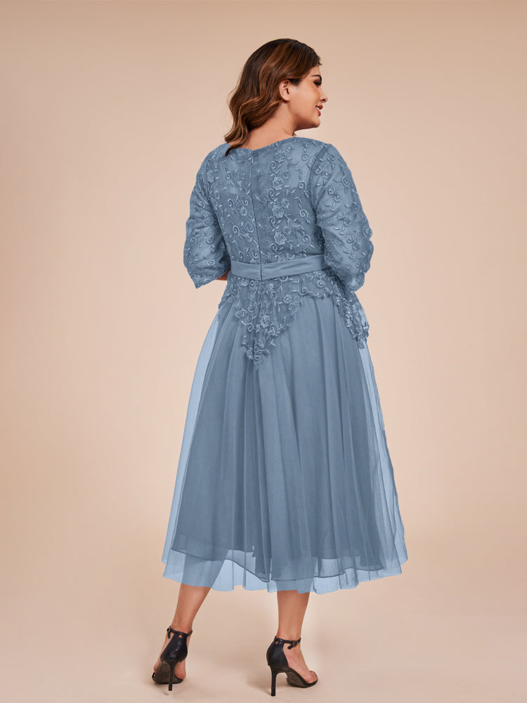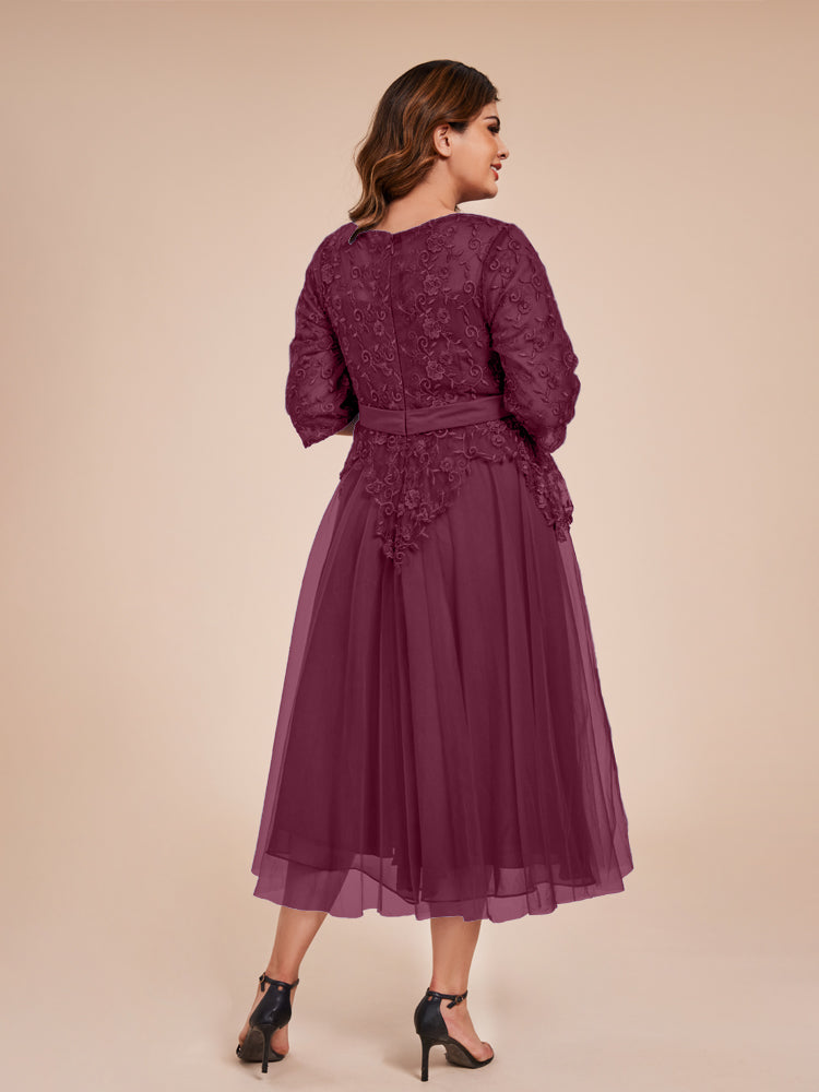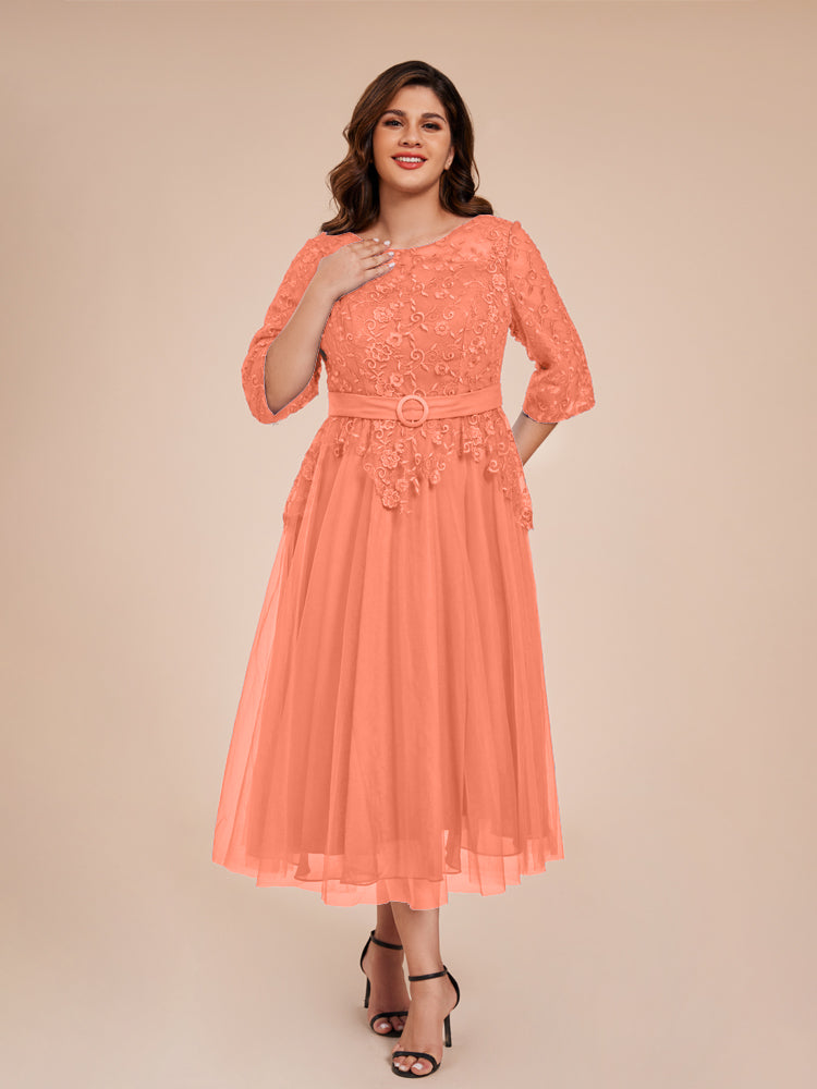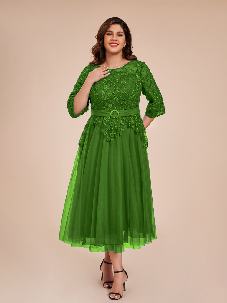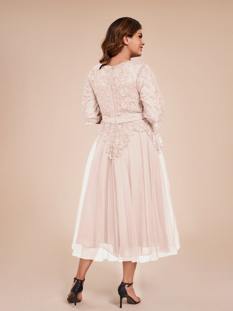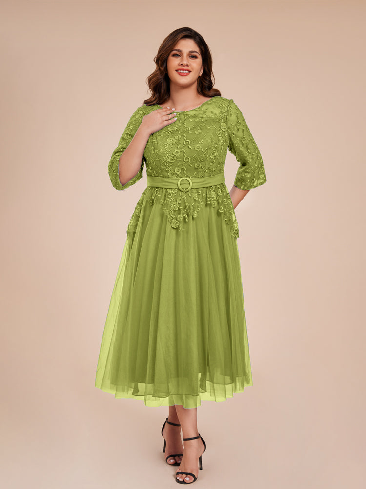 Lace Bodice 3/4 Length Sleeves Tea-Length Chiffon Mother Of The Bride Dress With Belt