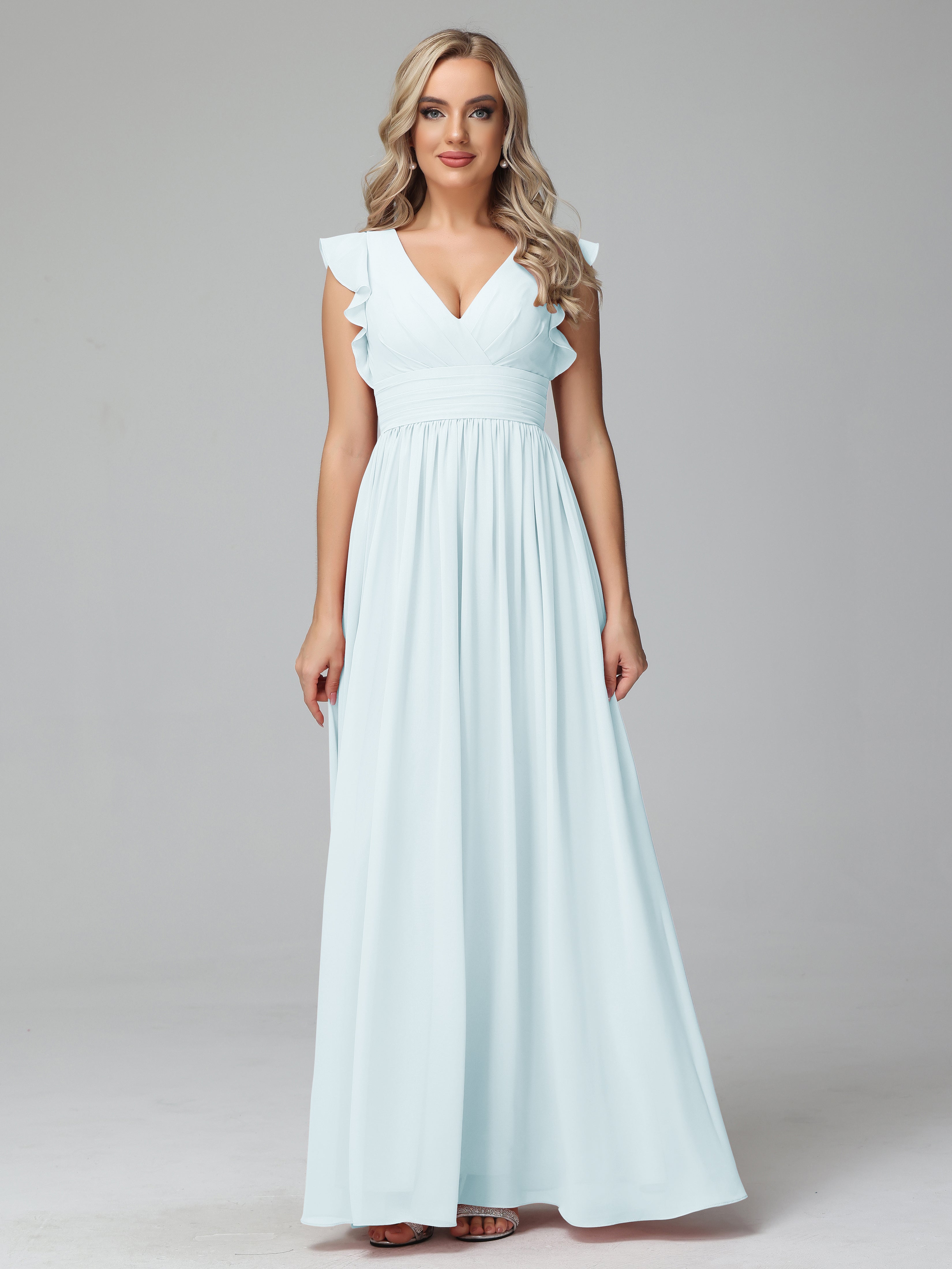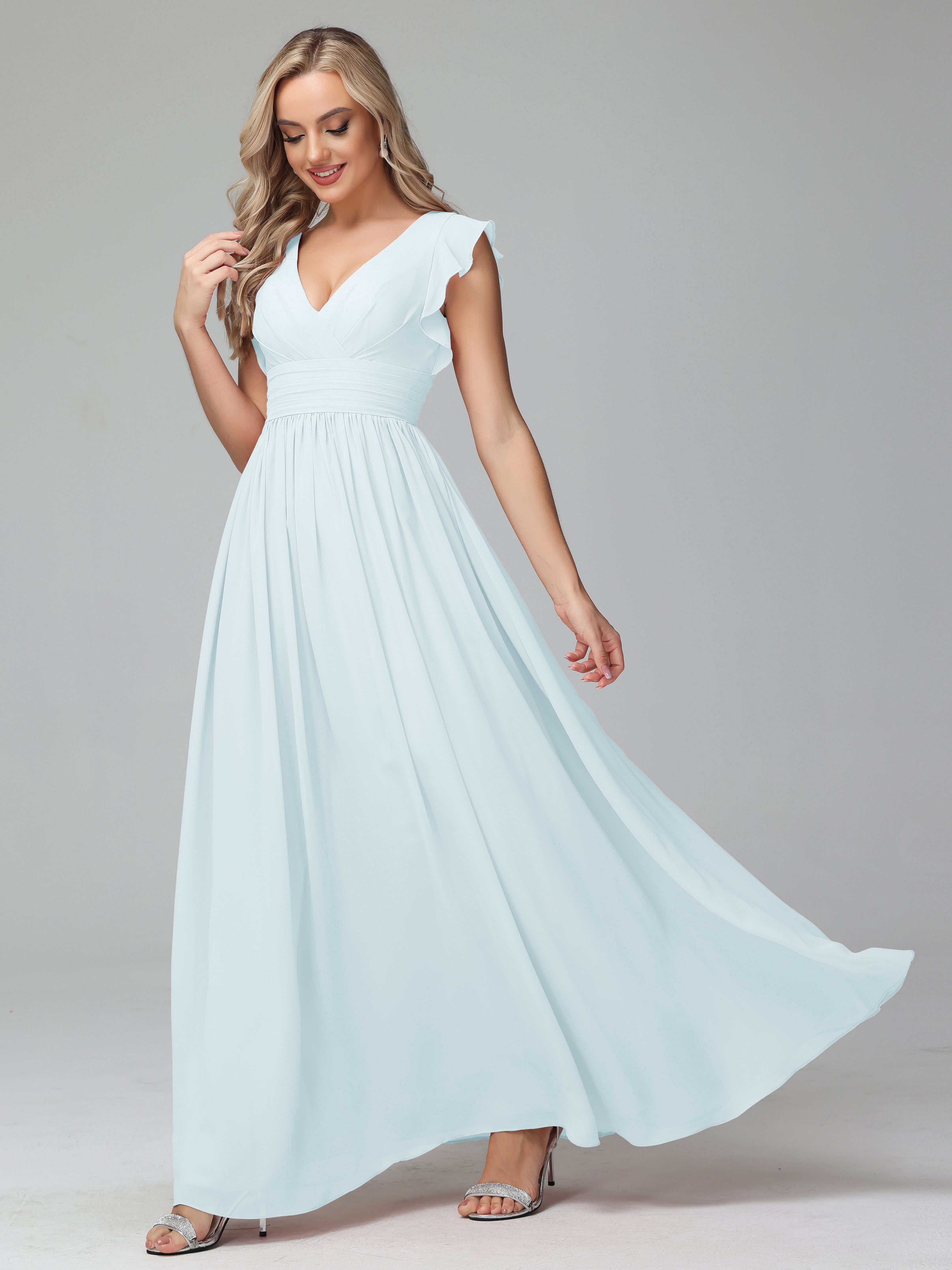 Mist Bridesmaid Dresses Bonnie V-Neck Chiffon Bridesmaid Dresses With Ruffle Sleeves