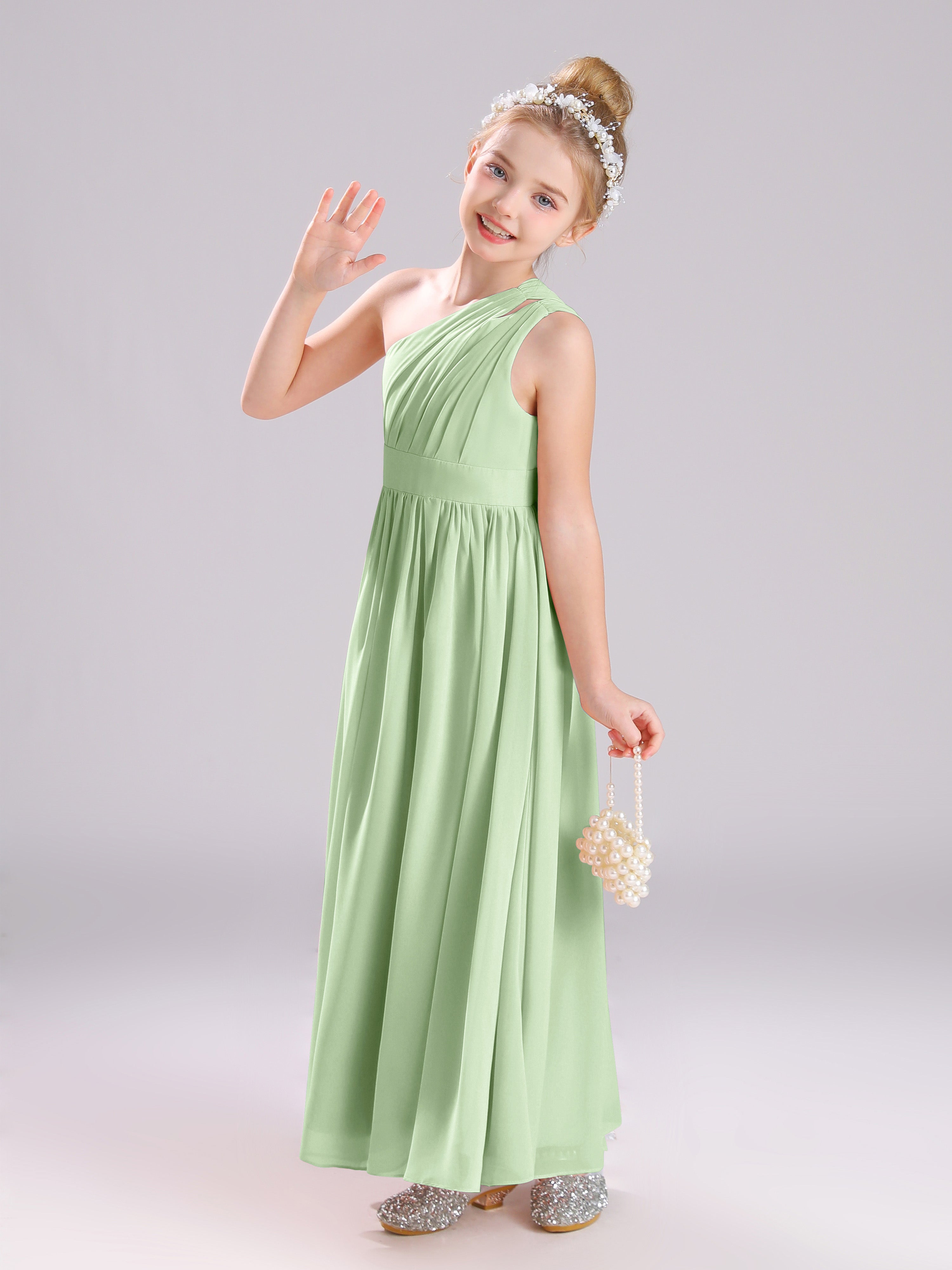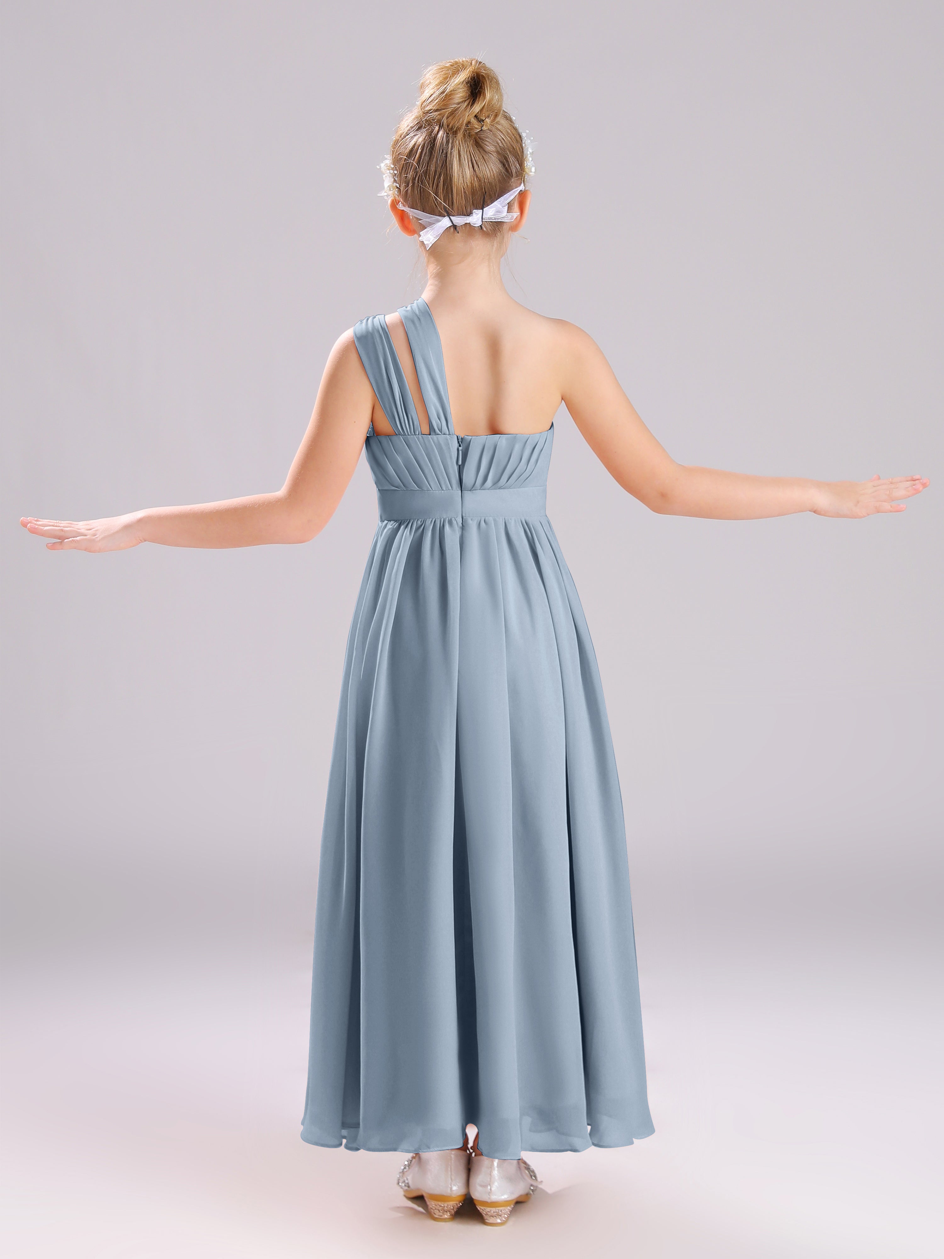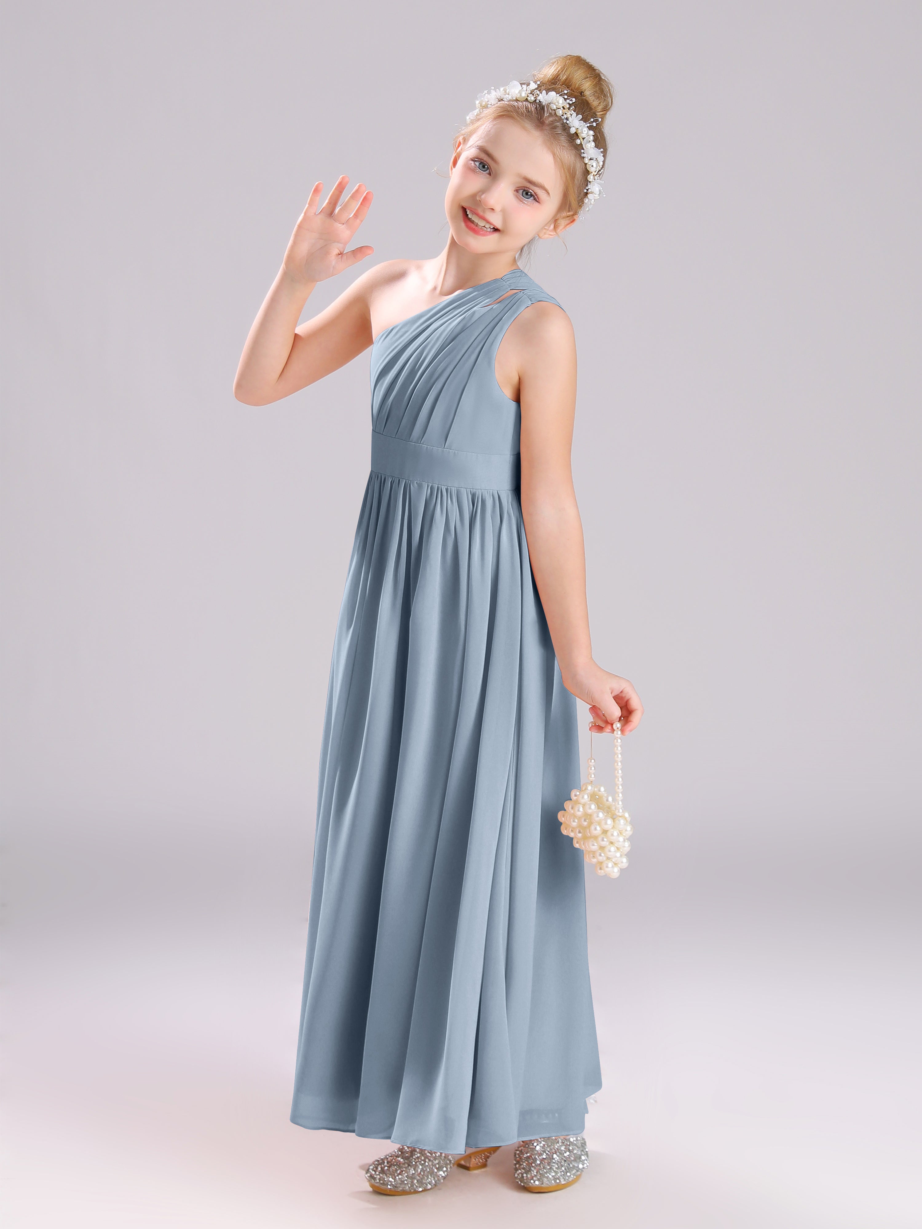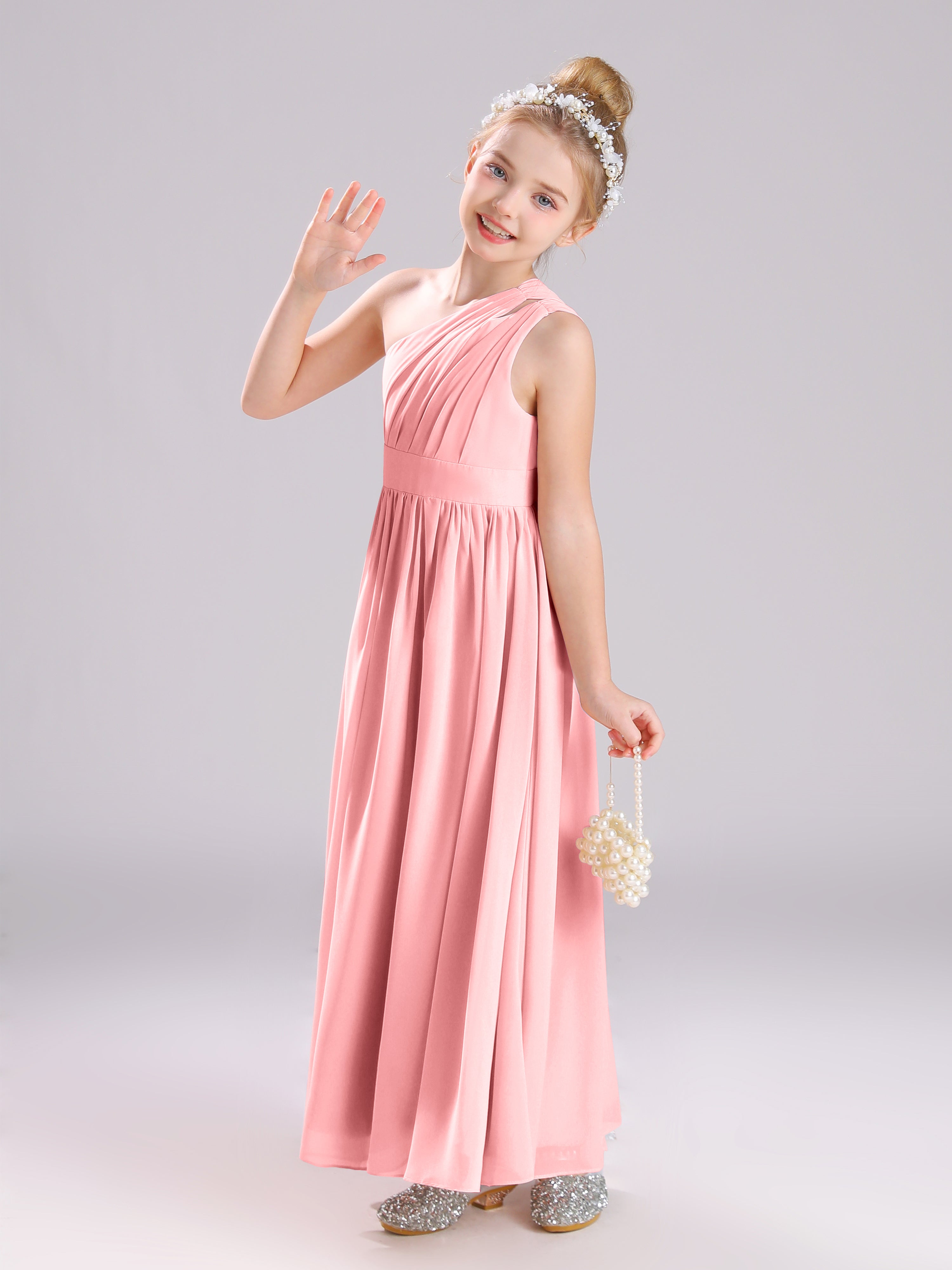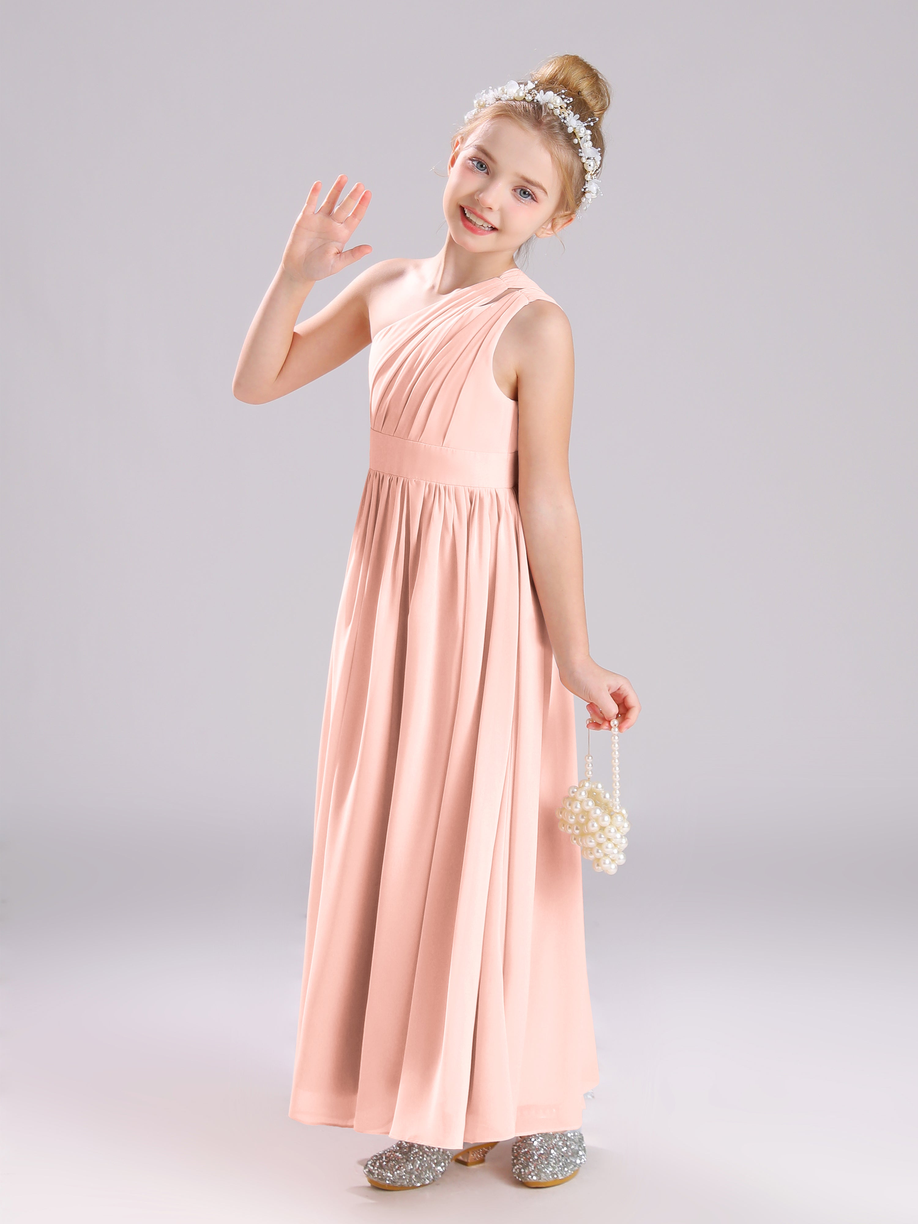 One Shoulder Pleats Long Chiffon Junior Bridesmaid Dresses