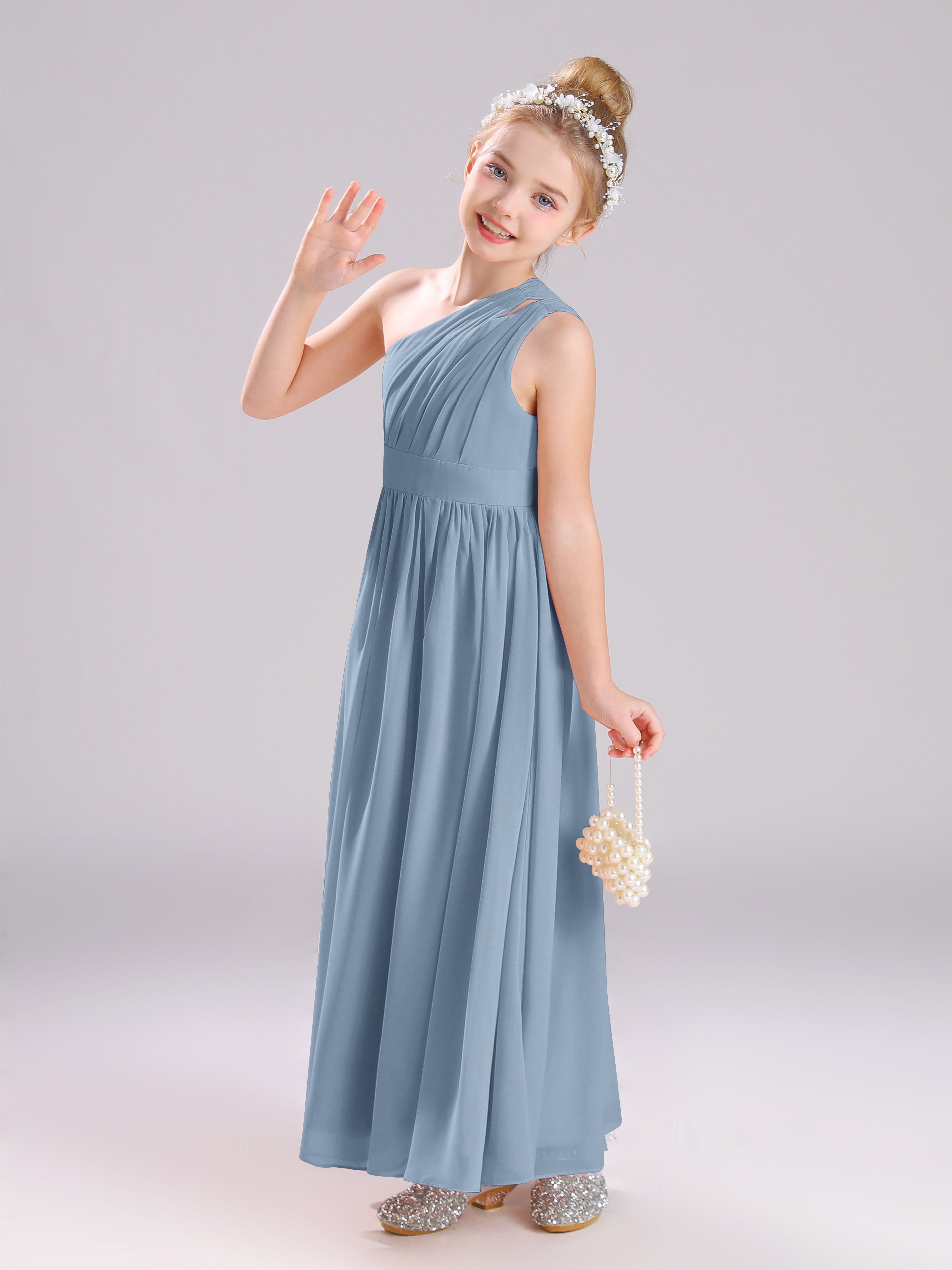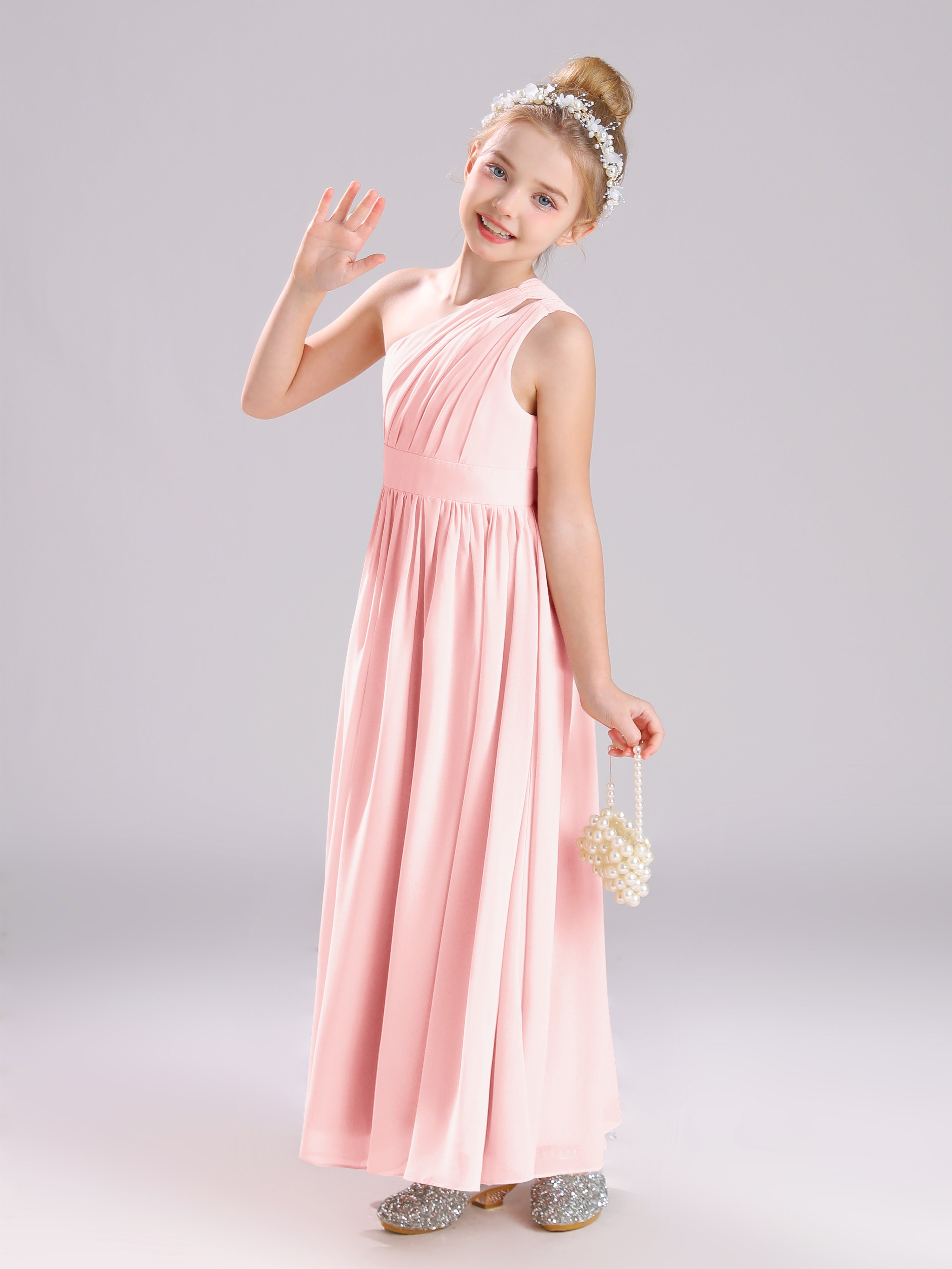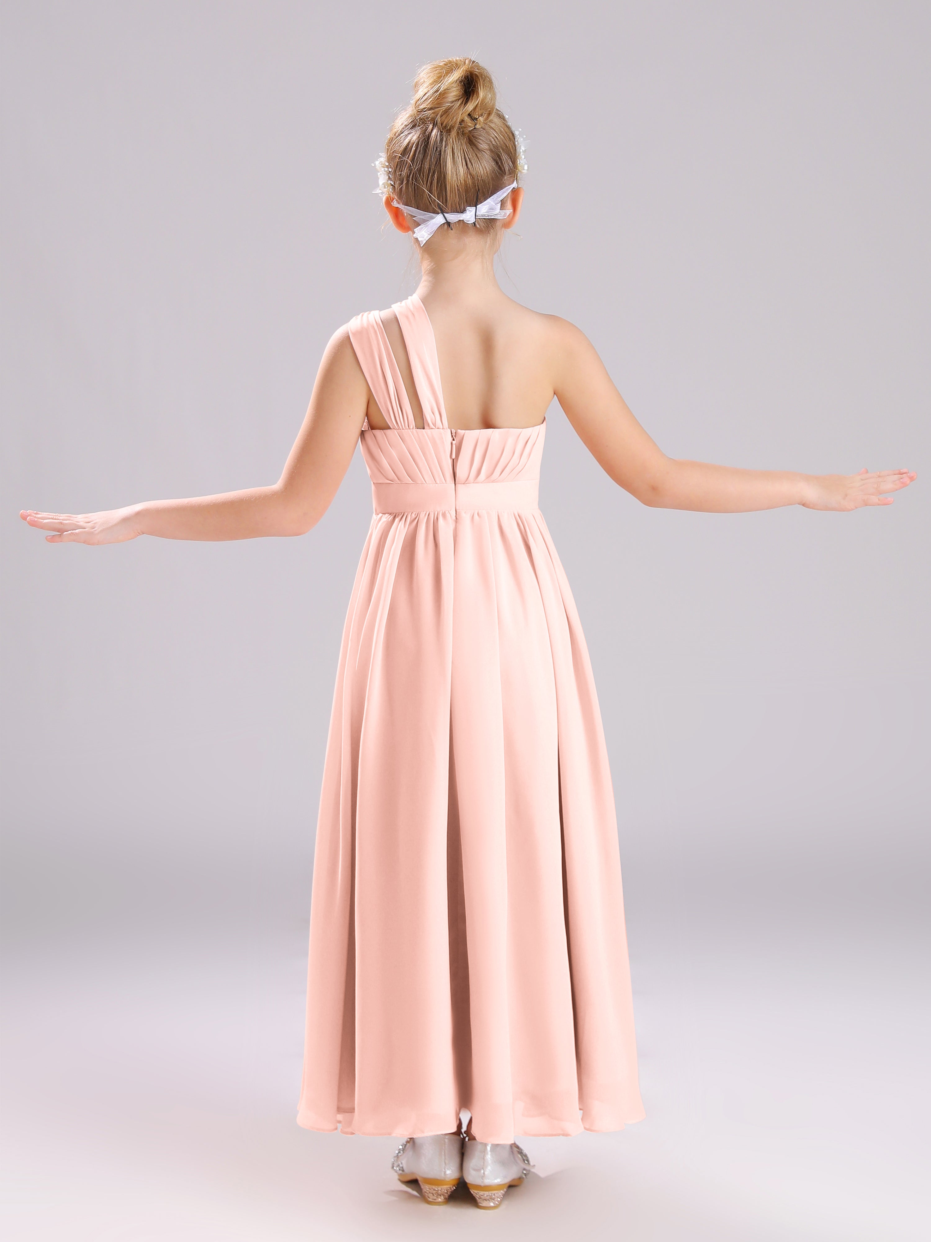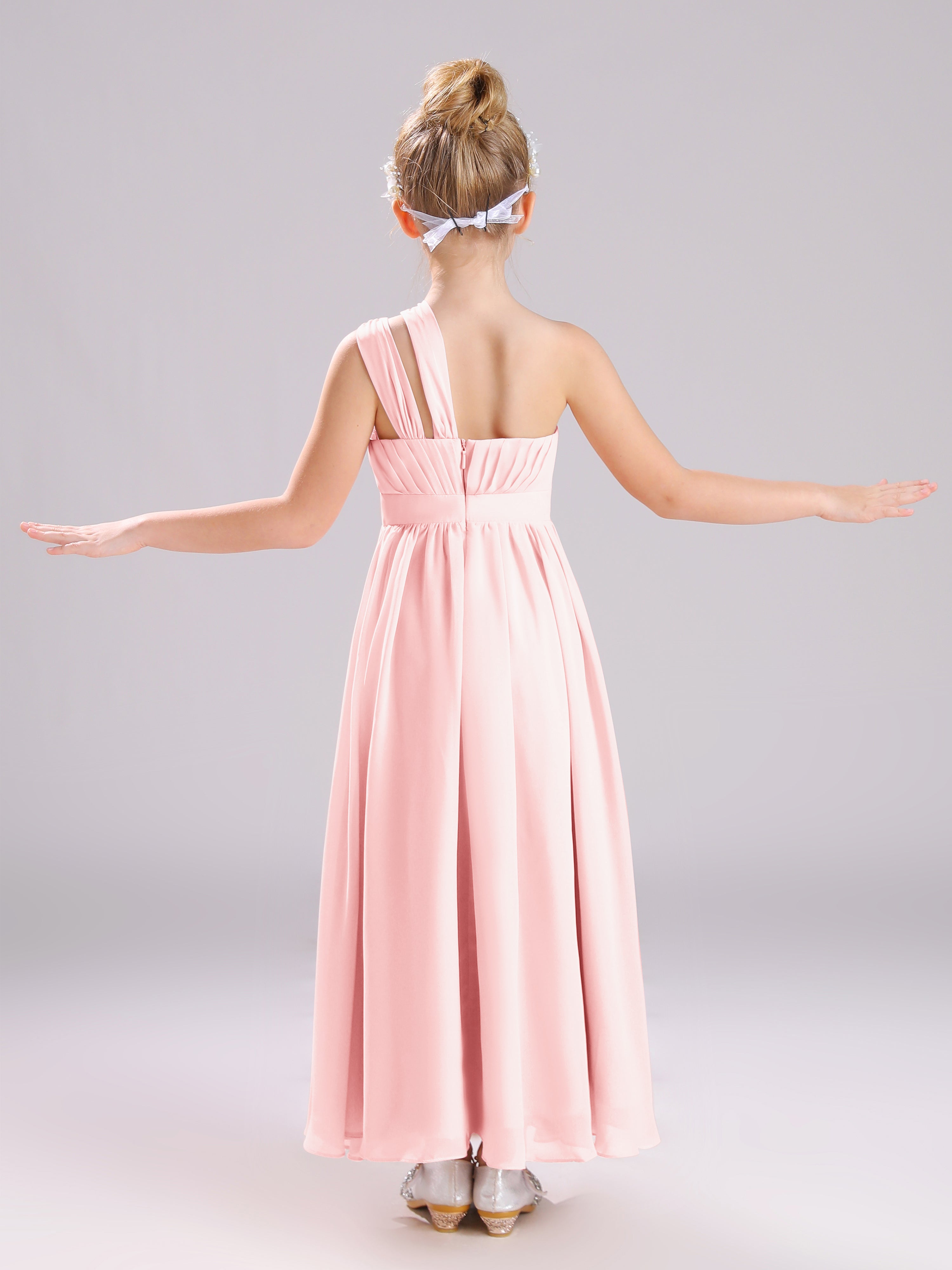 One Shoulder Pleats Long Chiffon Junior Bridesmaid Dresses