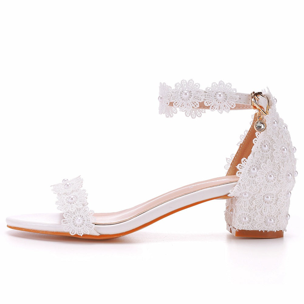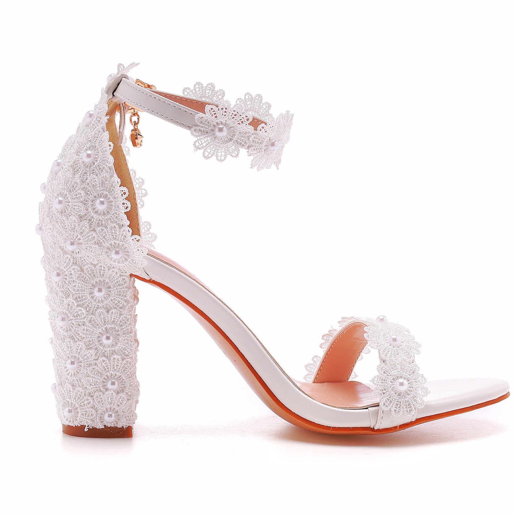 Open Toe Lace Pearl Ankle Strap Chunky Heel