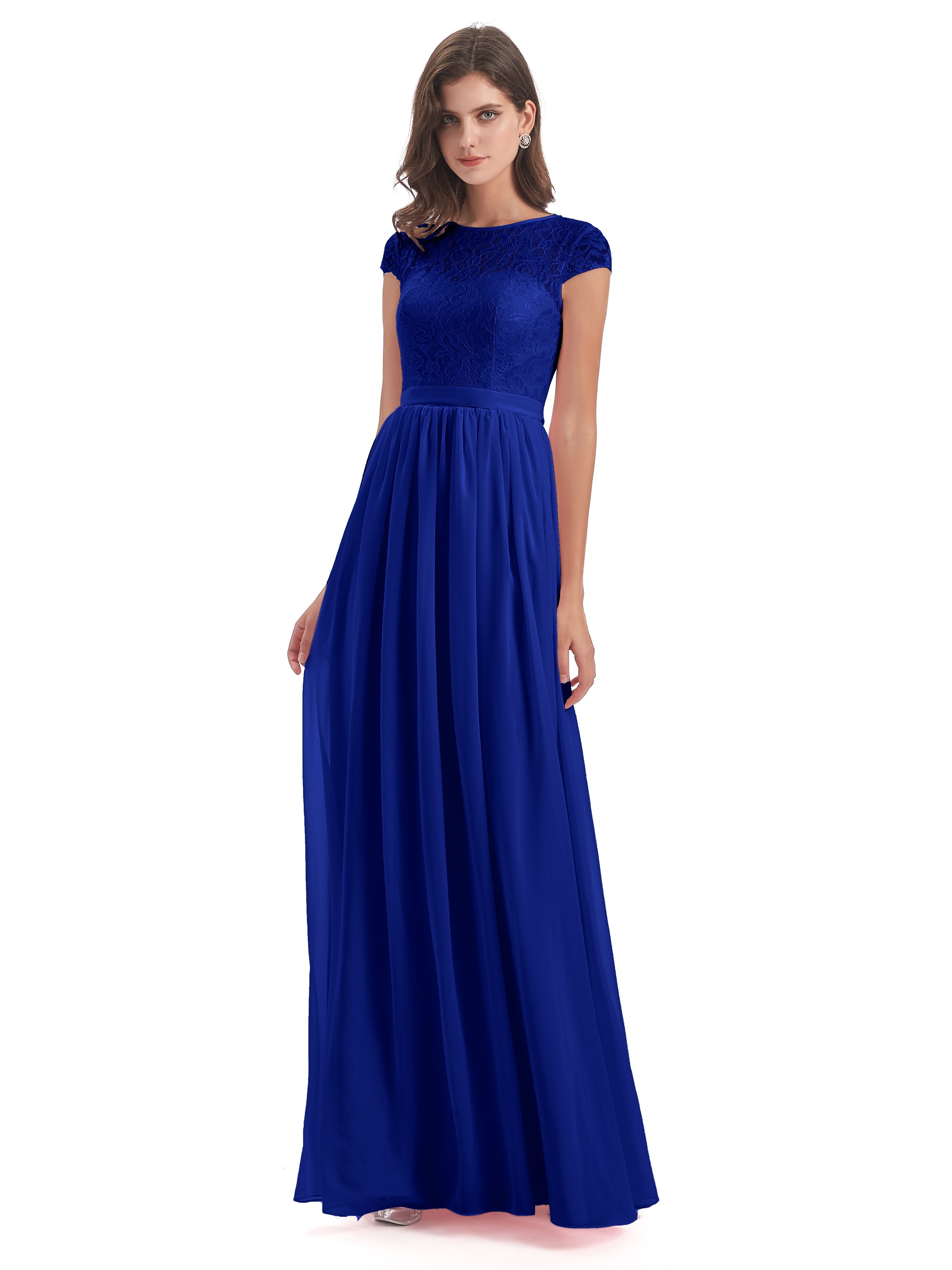 Royal Blue Dress Bridesmaid Darcy Modest Cap Sleeves Illusion Long Chiffon Bridesmaid Dresses