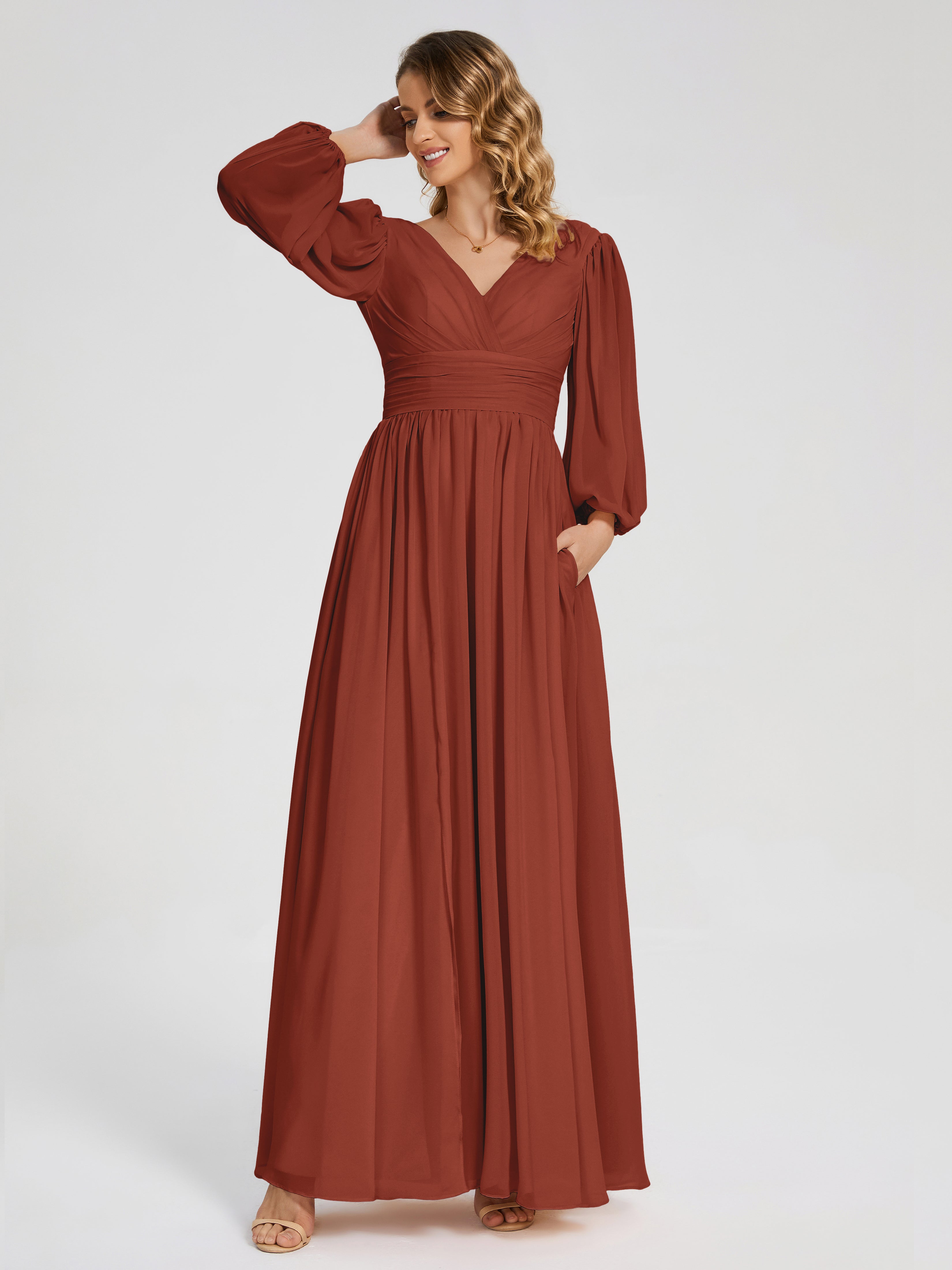Rust Chiffon Bridesmaid Dress Journey Long Sleeves Split Chiffon Bridesmaid Dresses