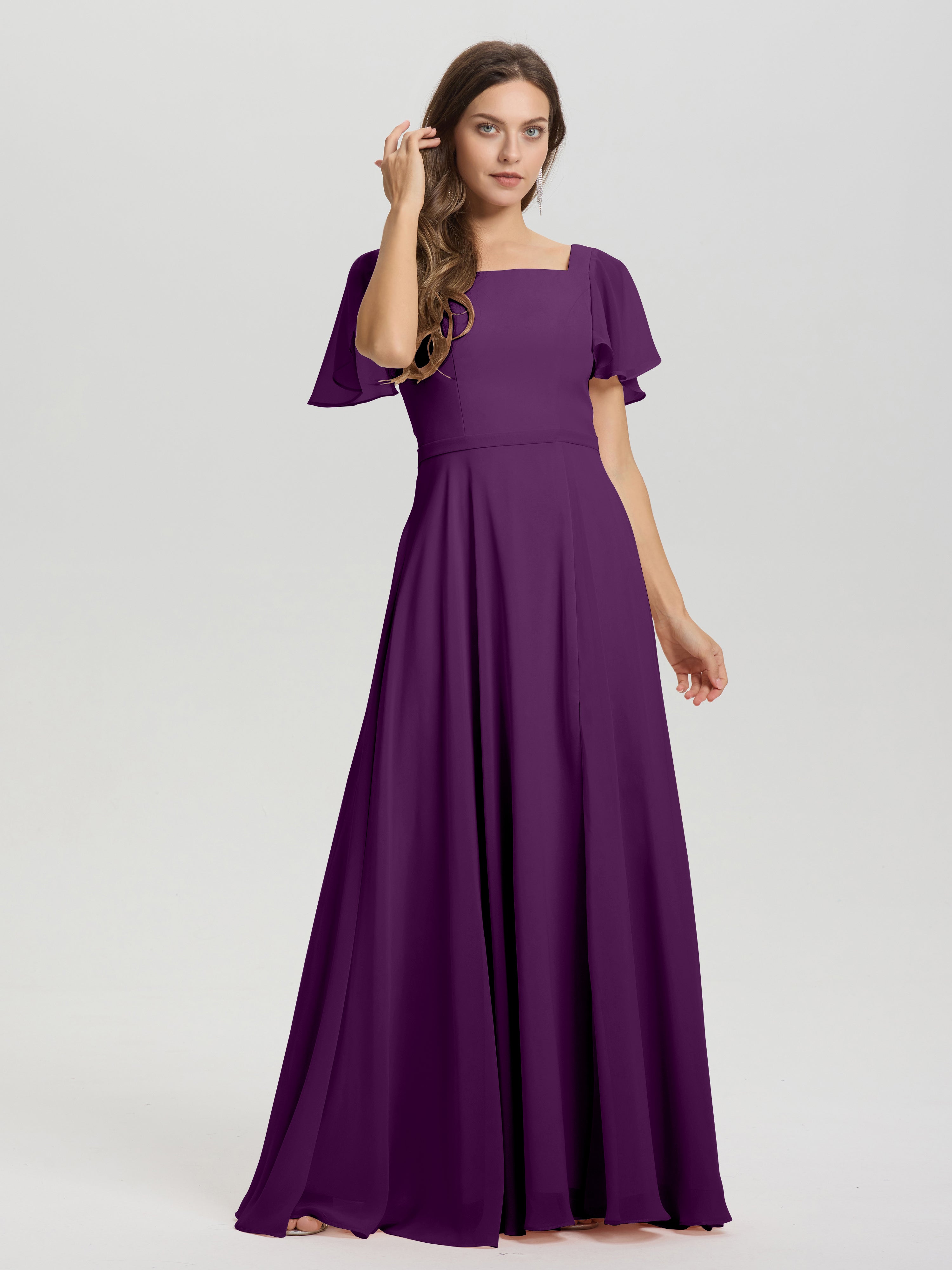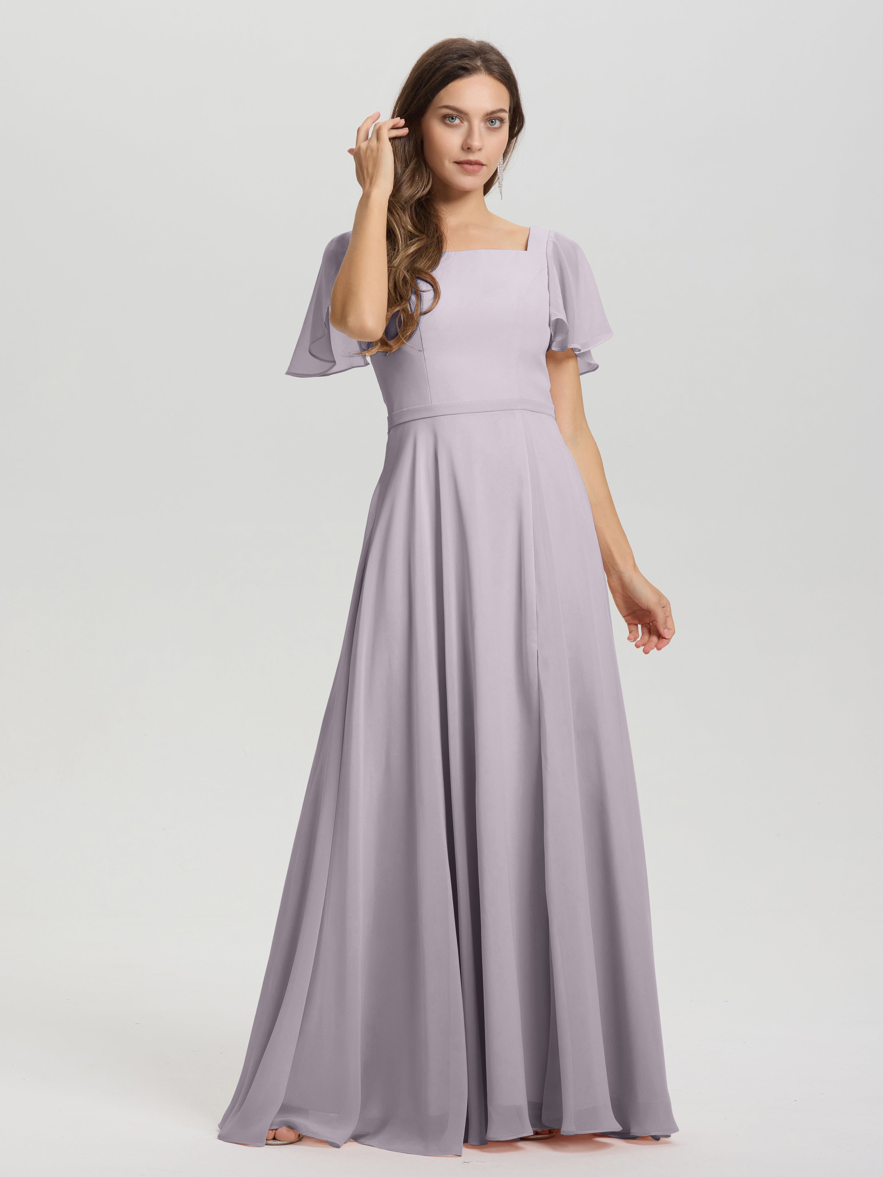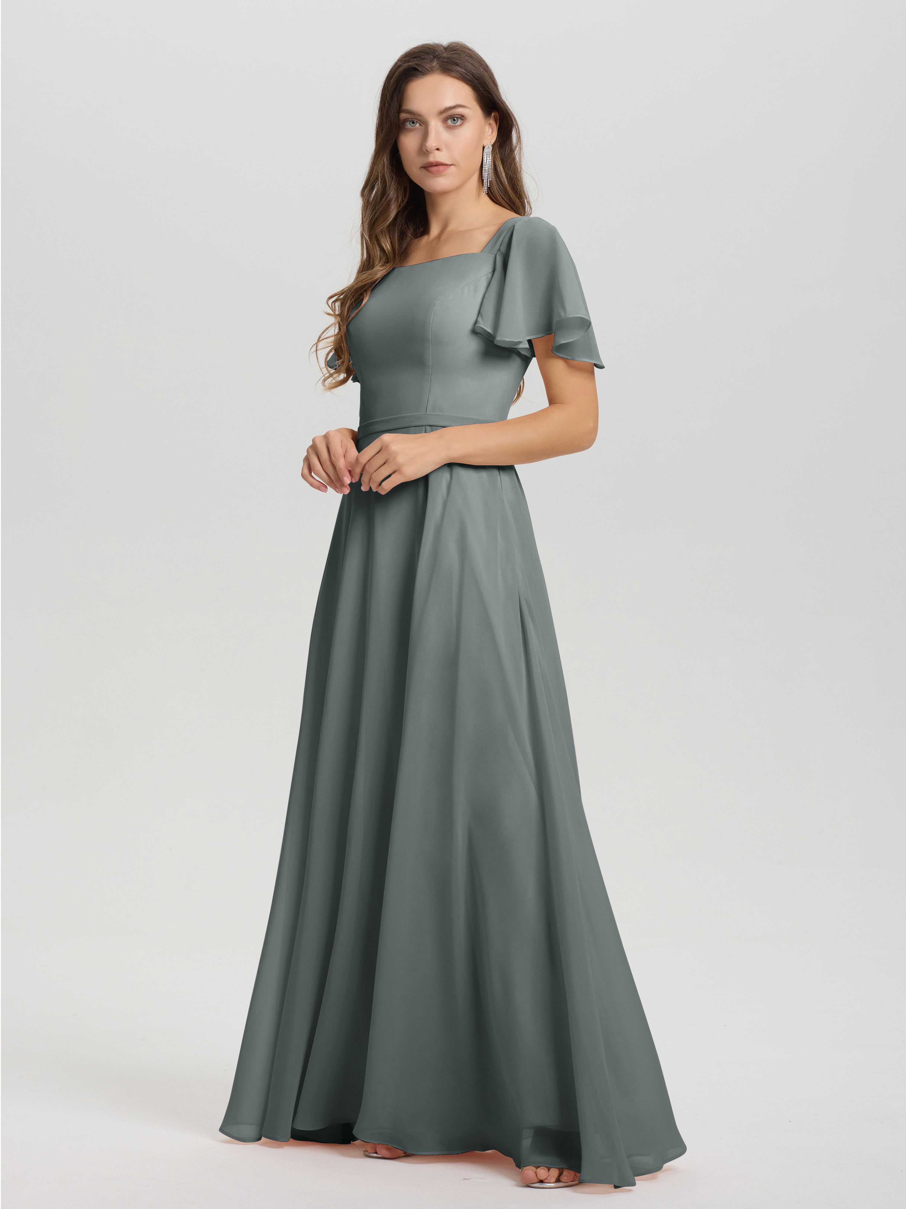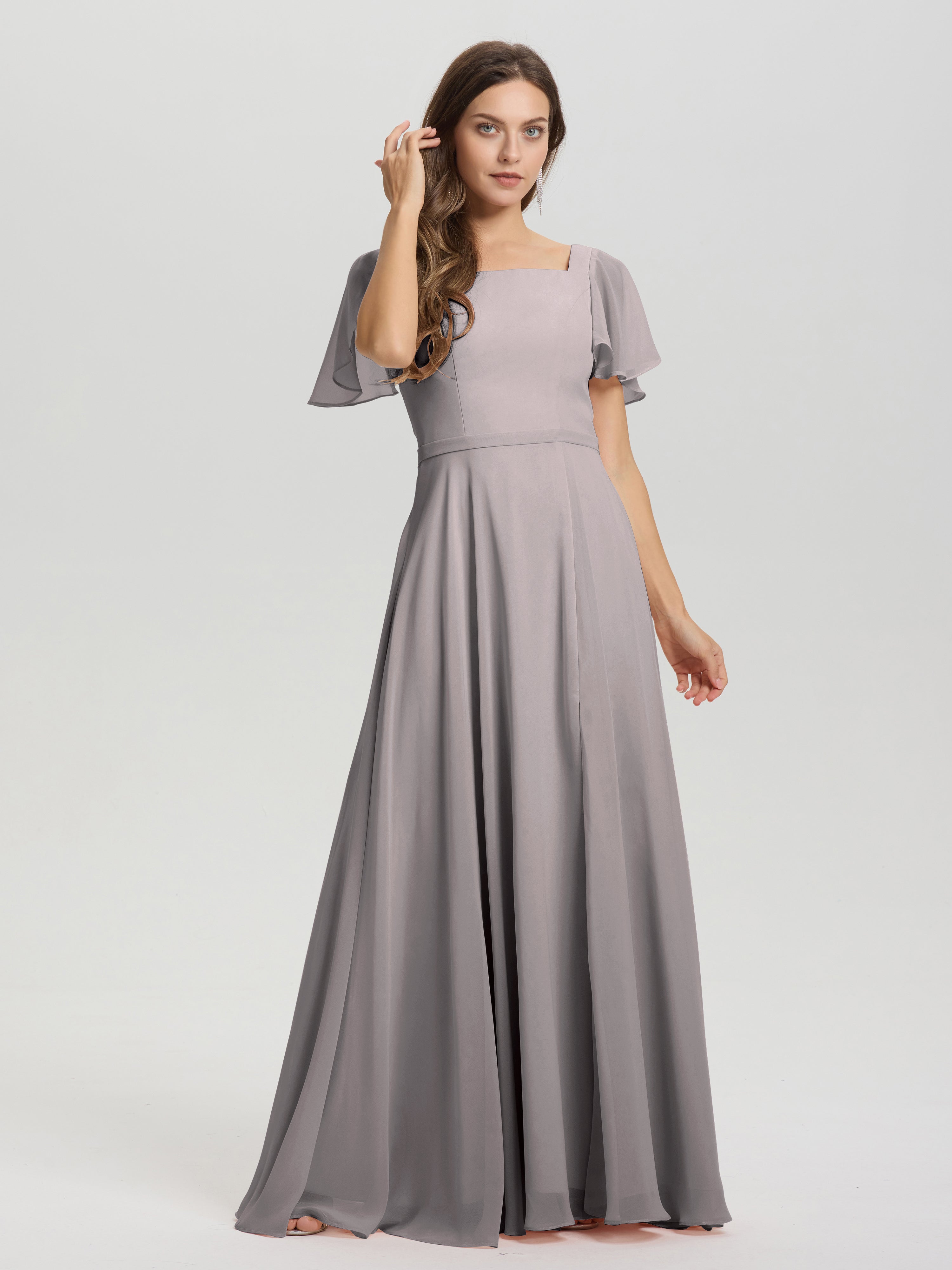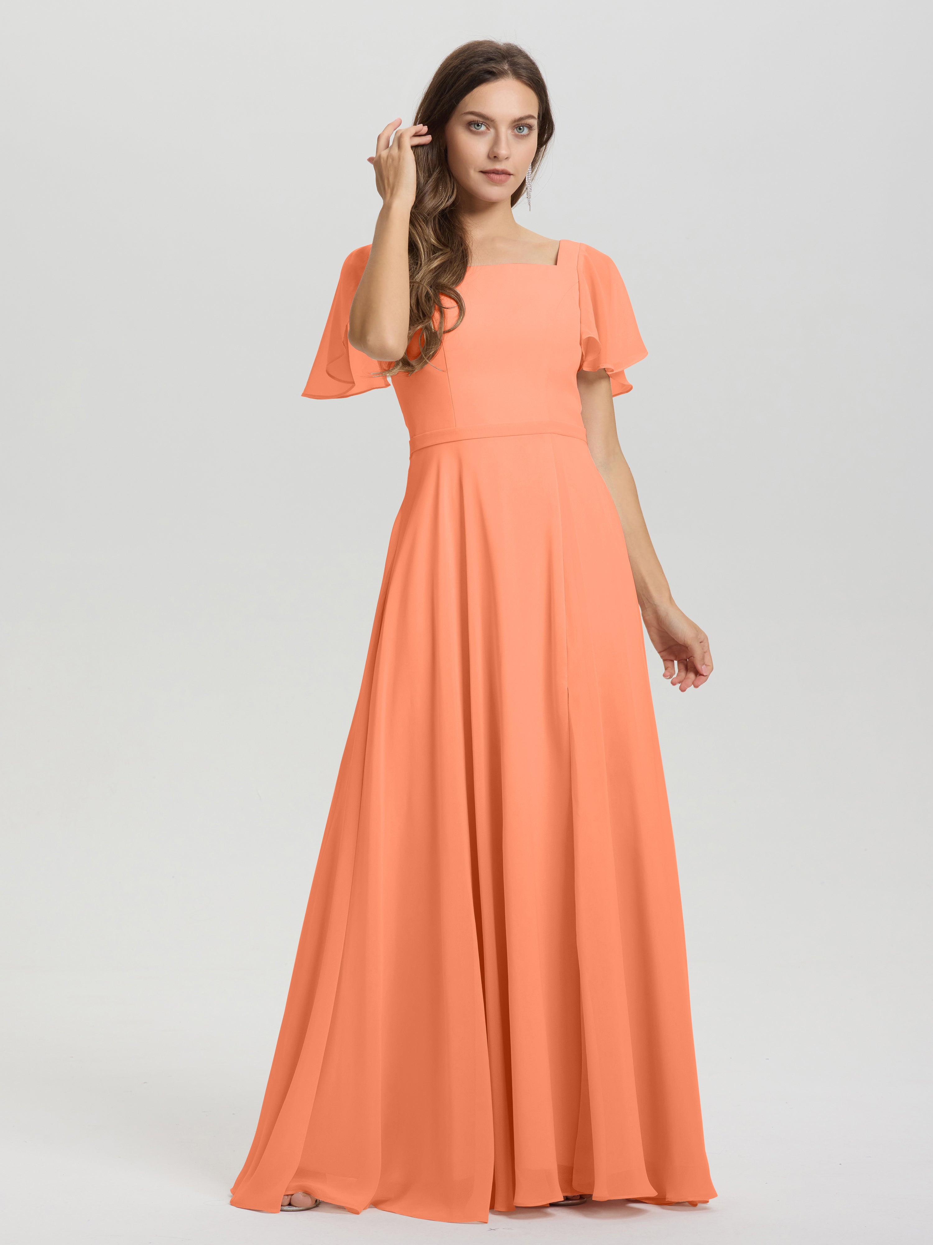 Square Neckline Short Sleeves Split Chiffon Bridesmaid Dresses