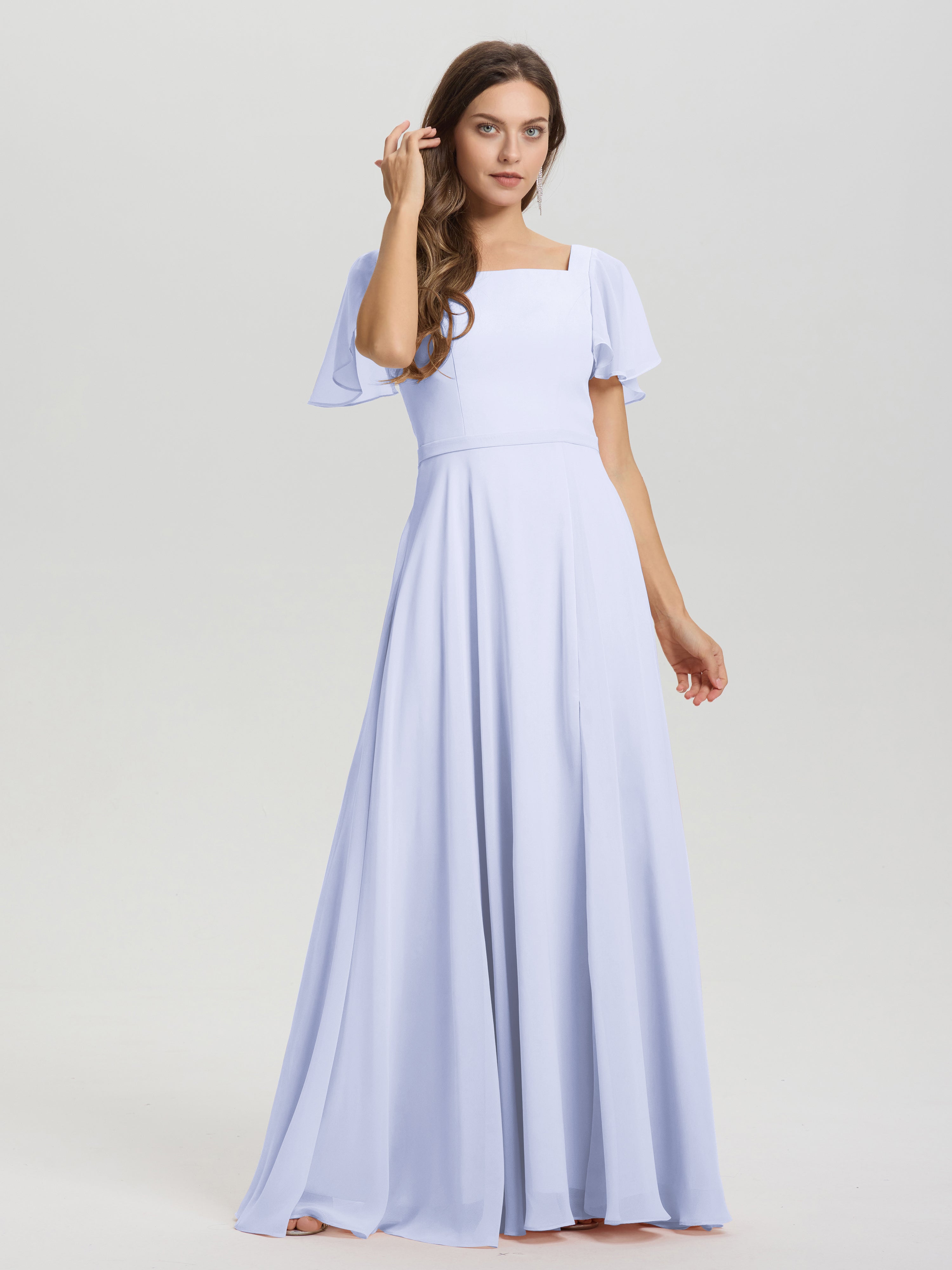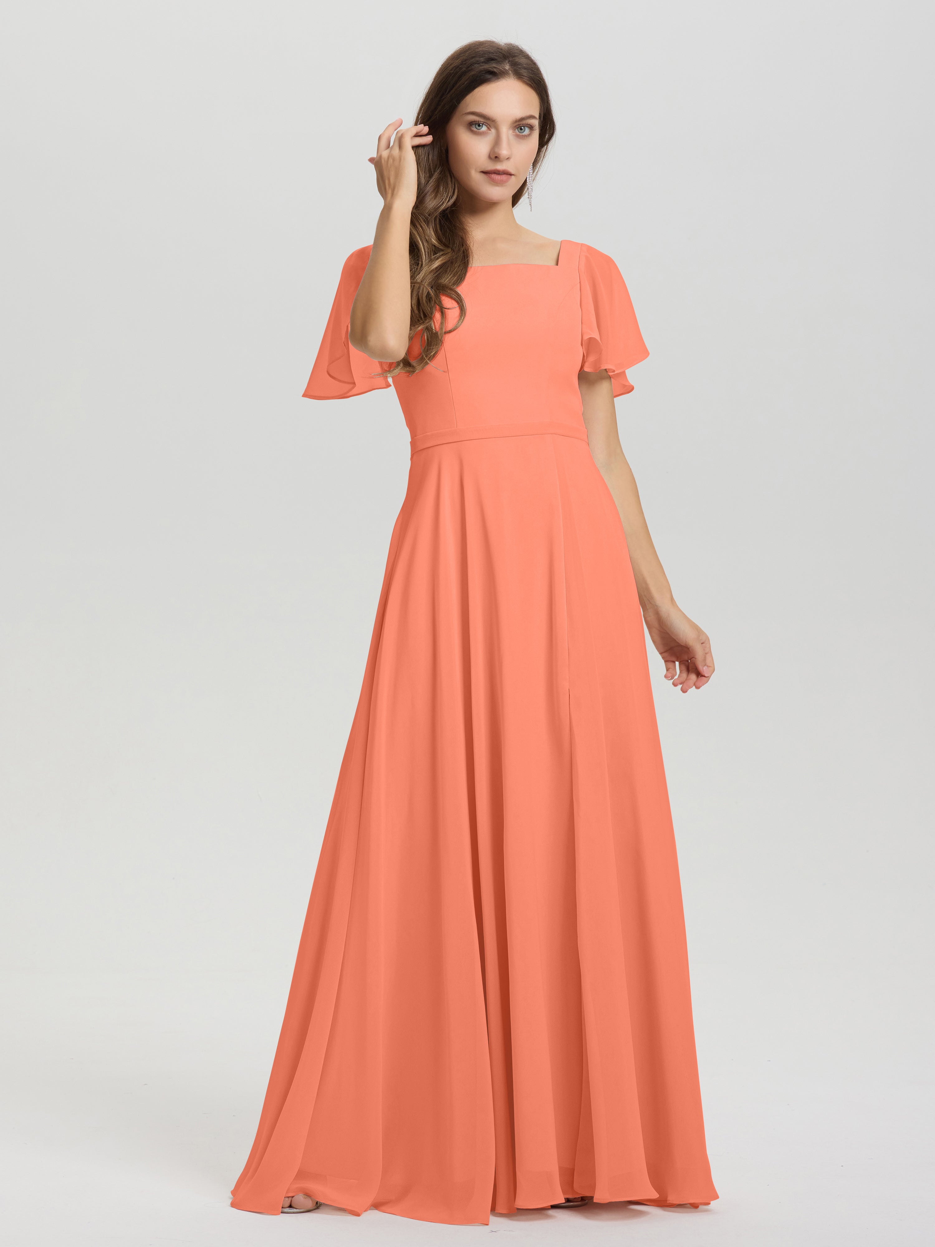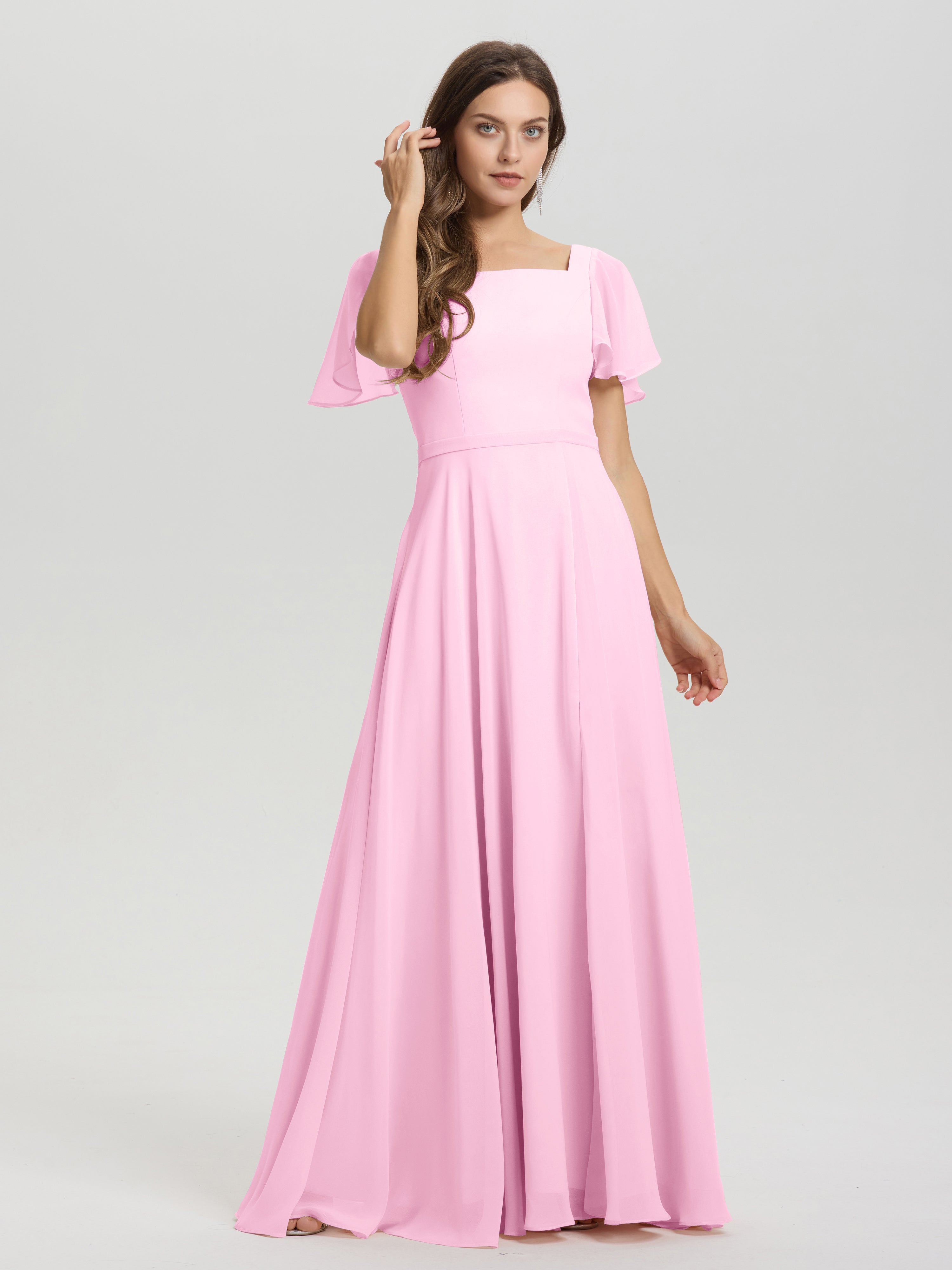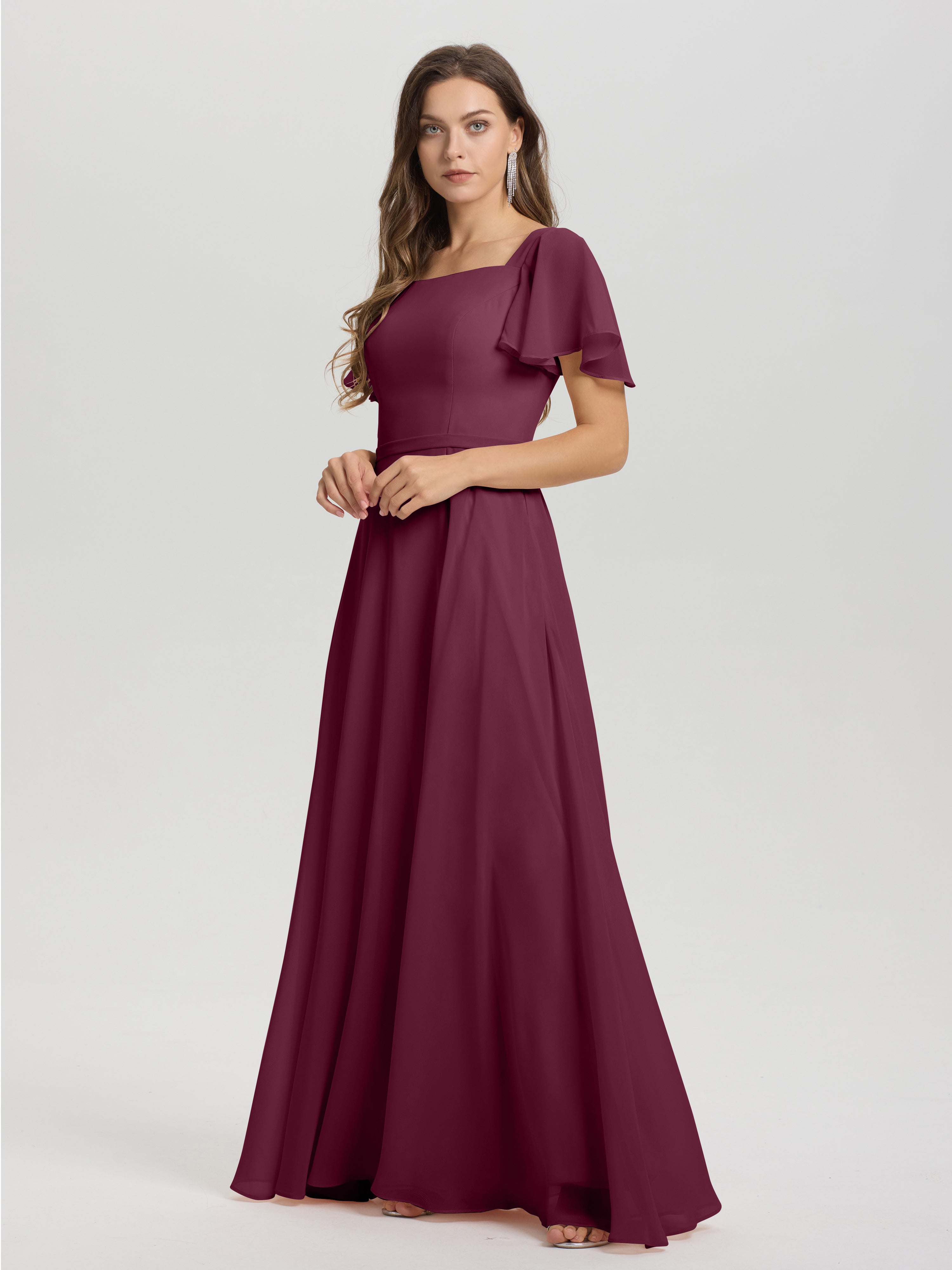 Square Neckline Short Sleeves Split Chiffon Bridesmaid Dresses