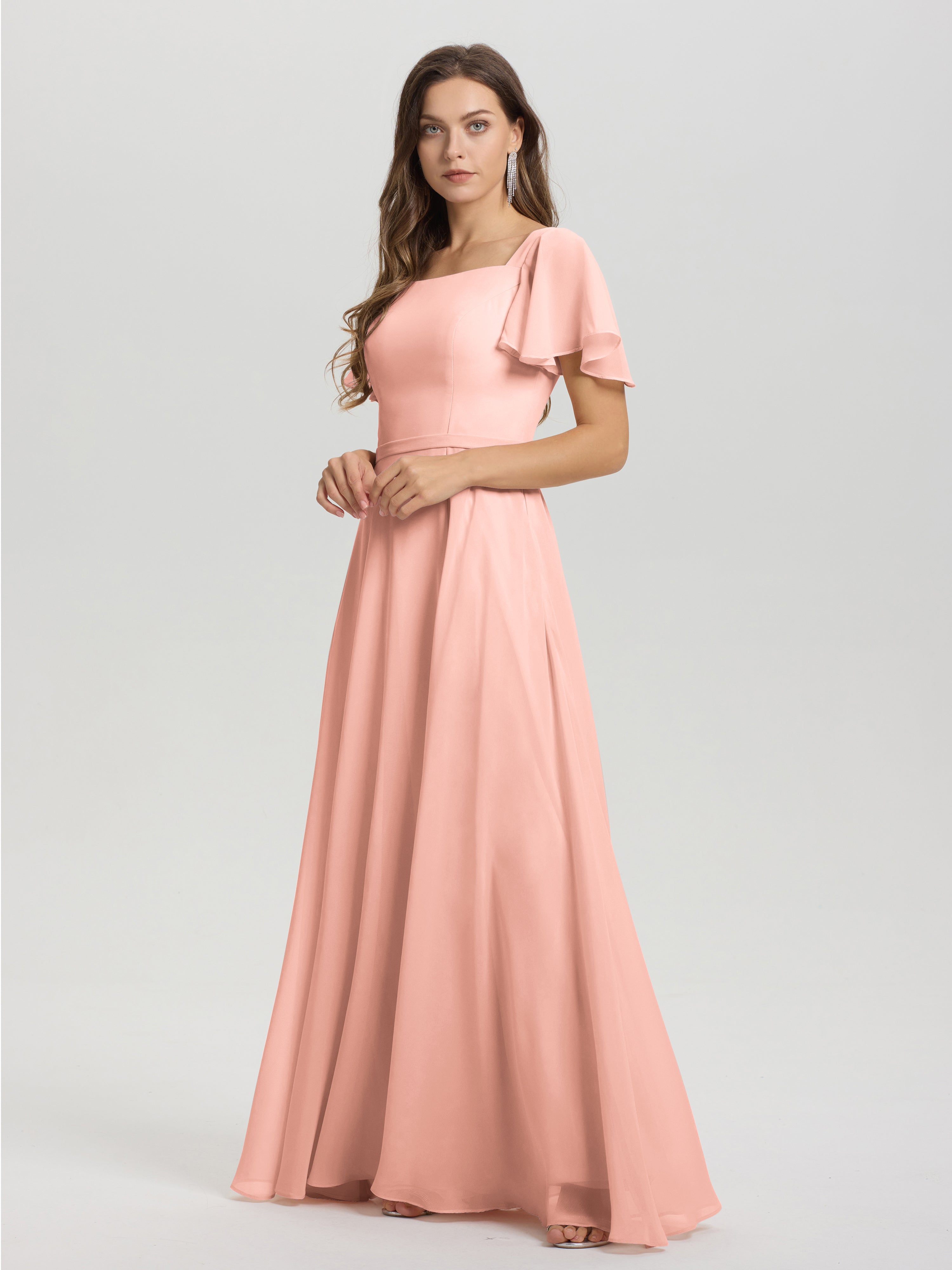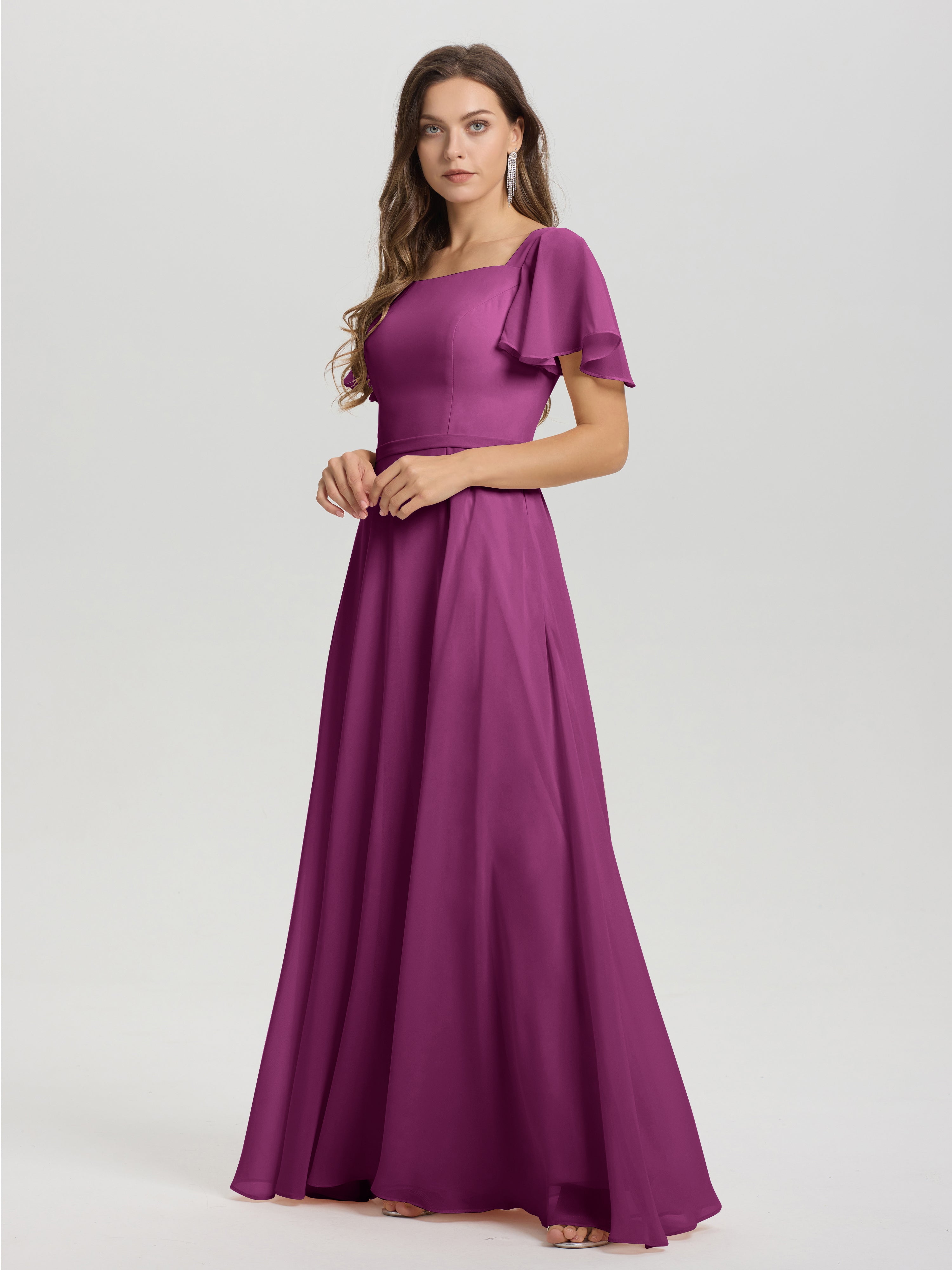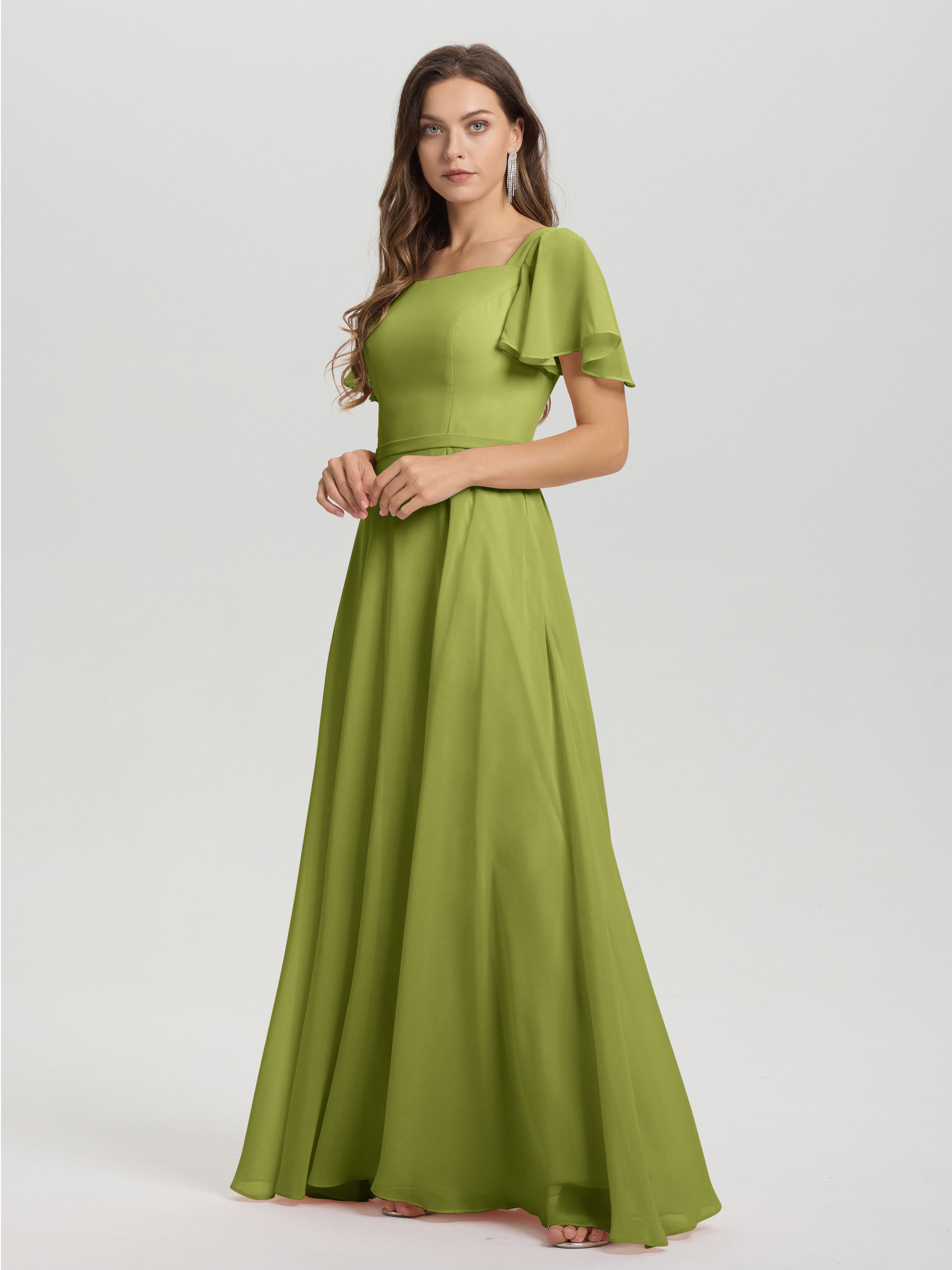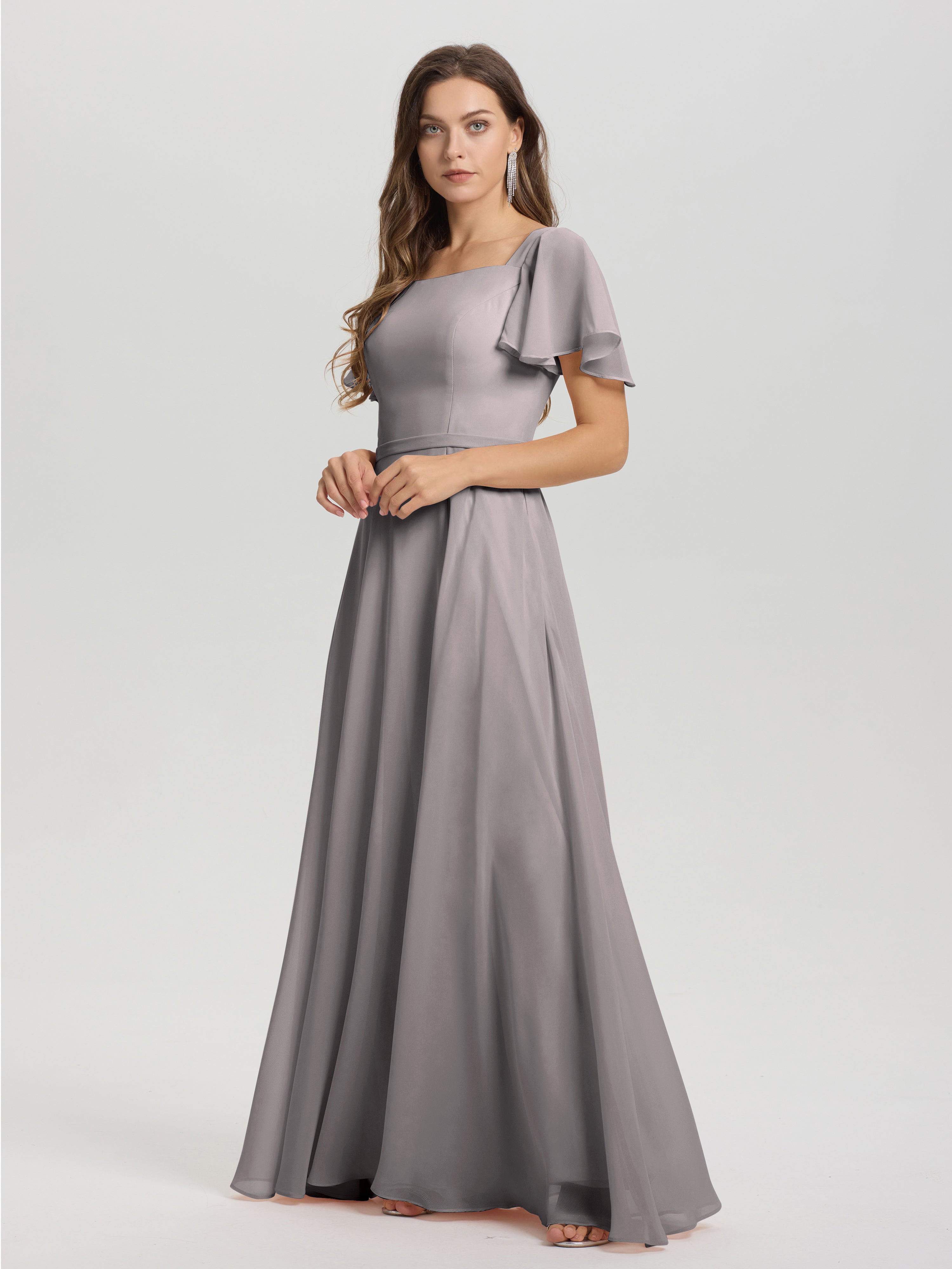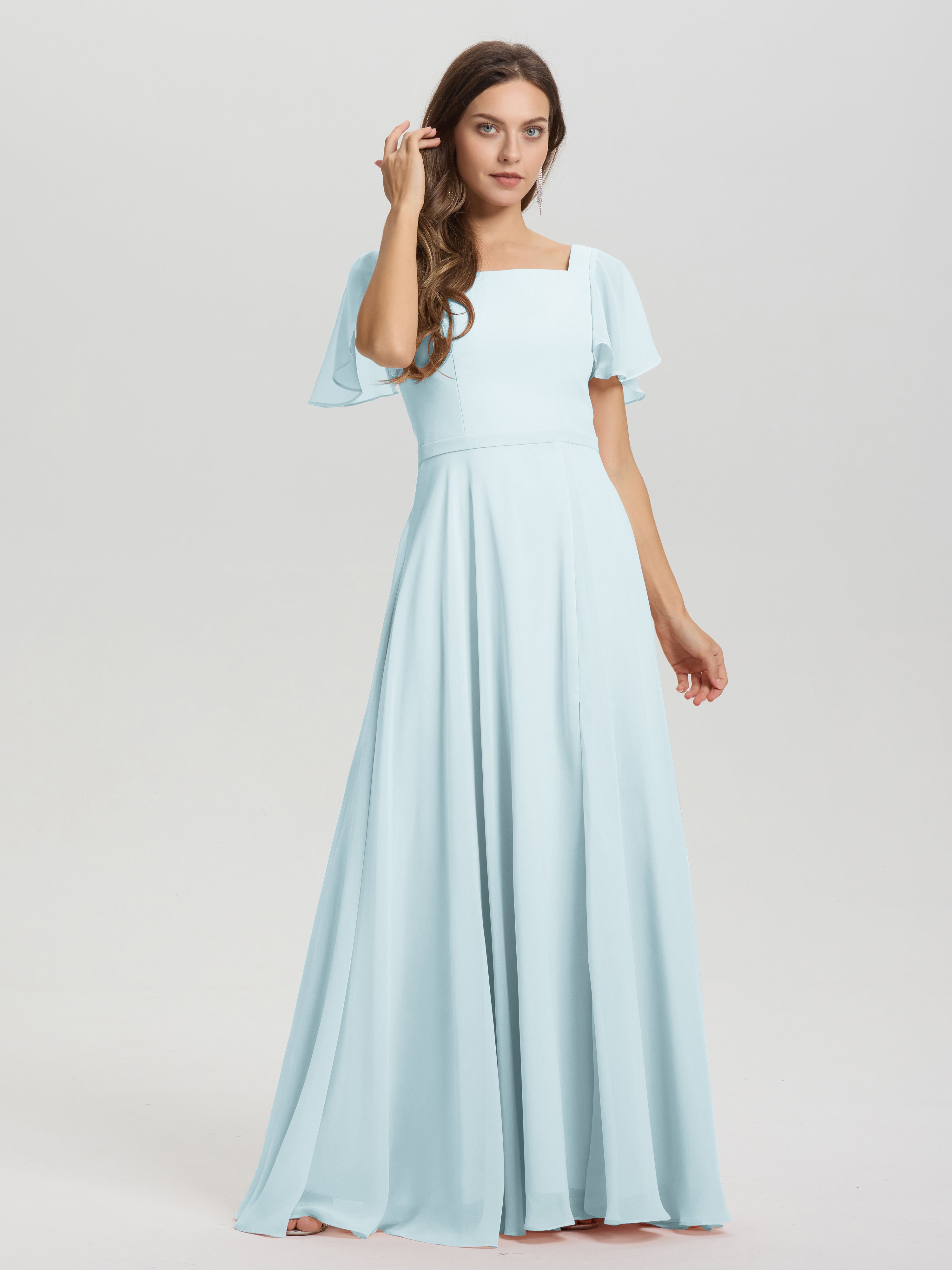Square Neckline Short Sleeves Split Chiffon Bridesmaid Dresses