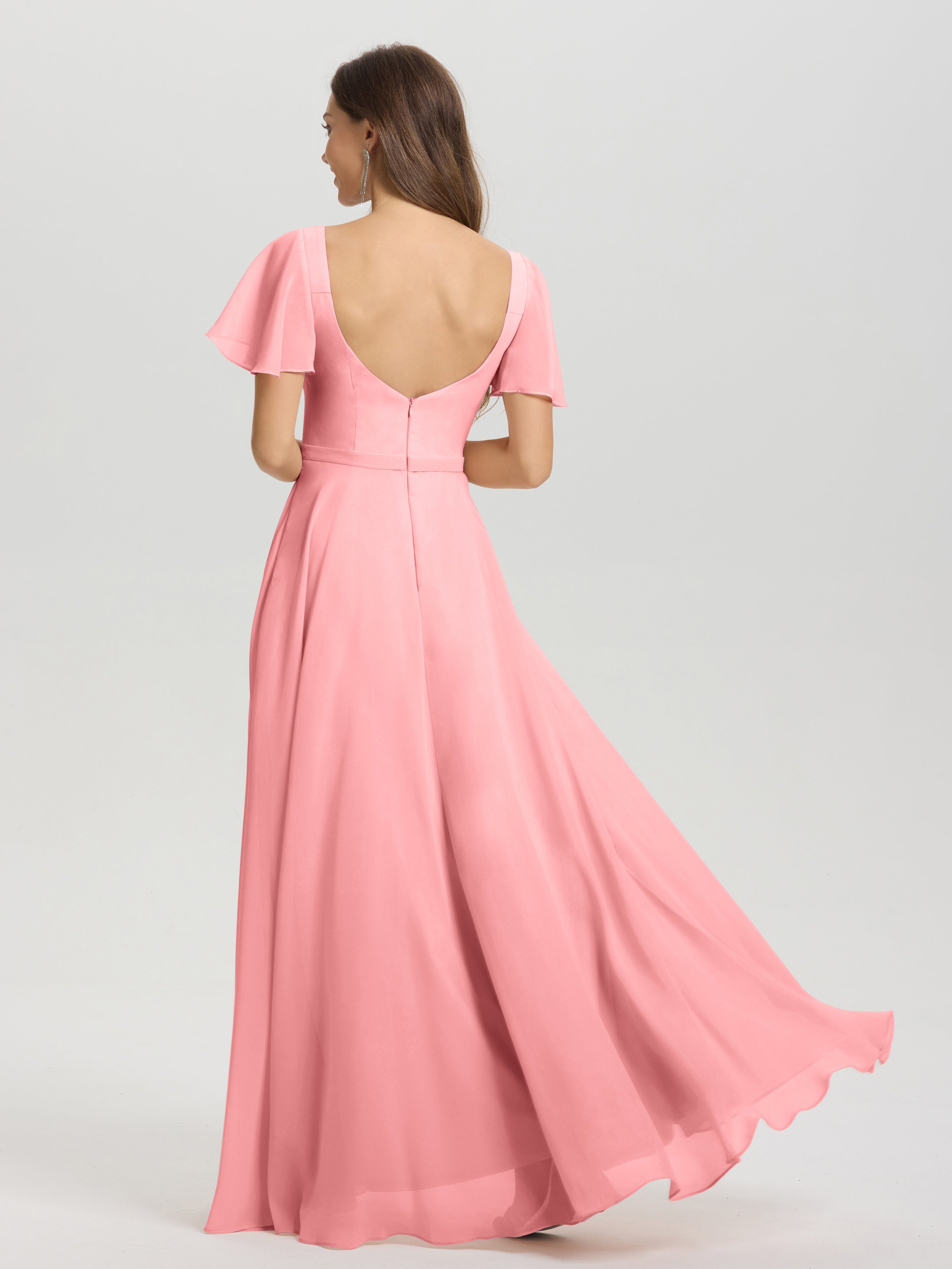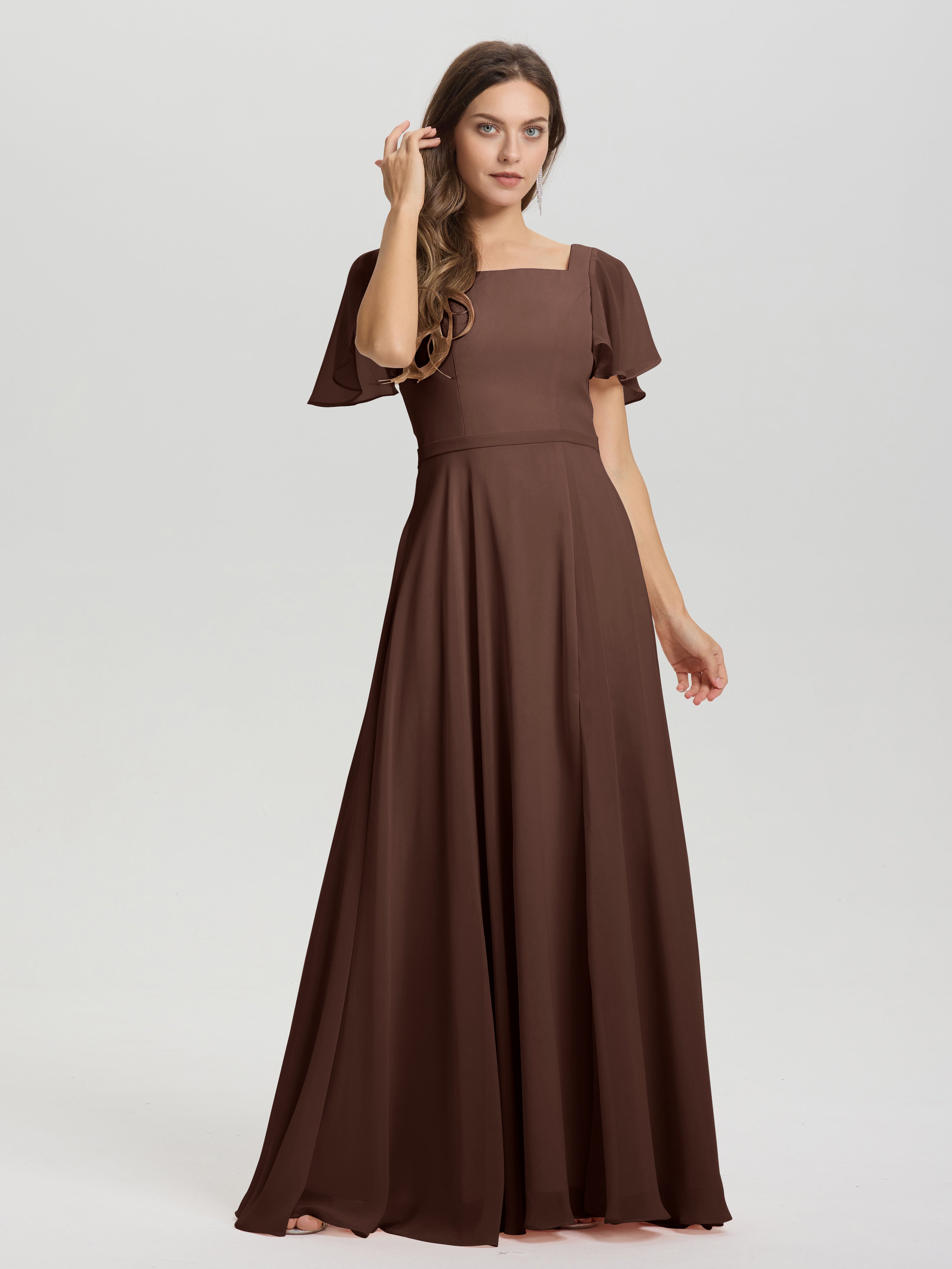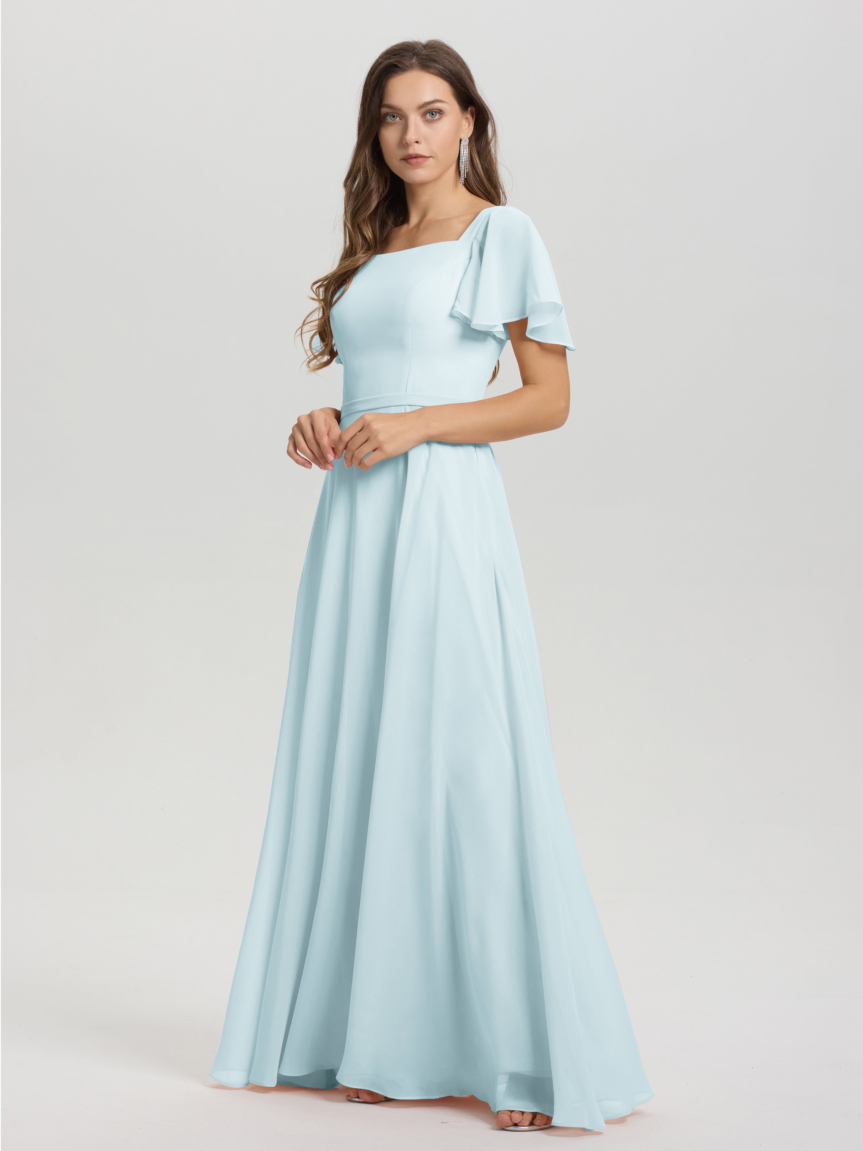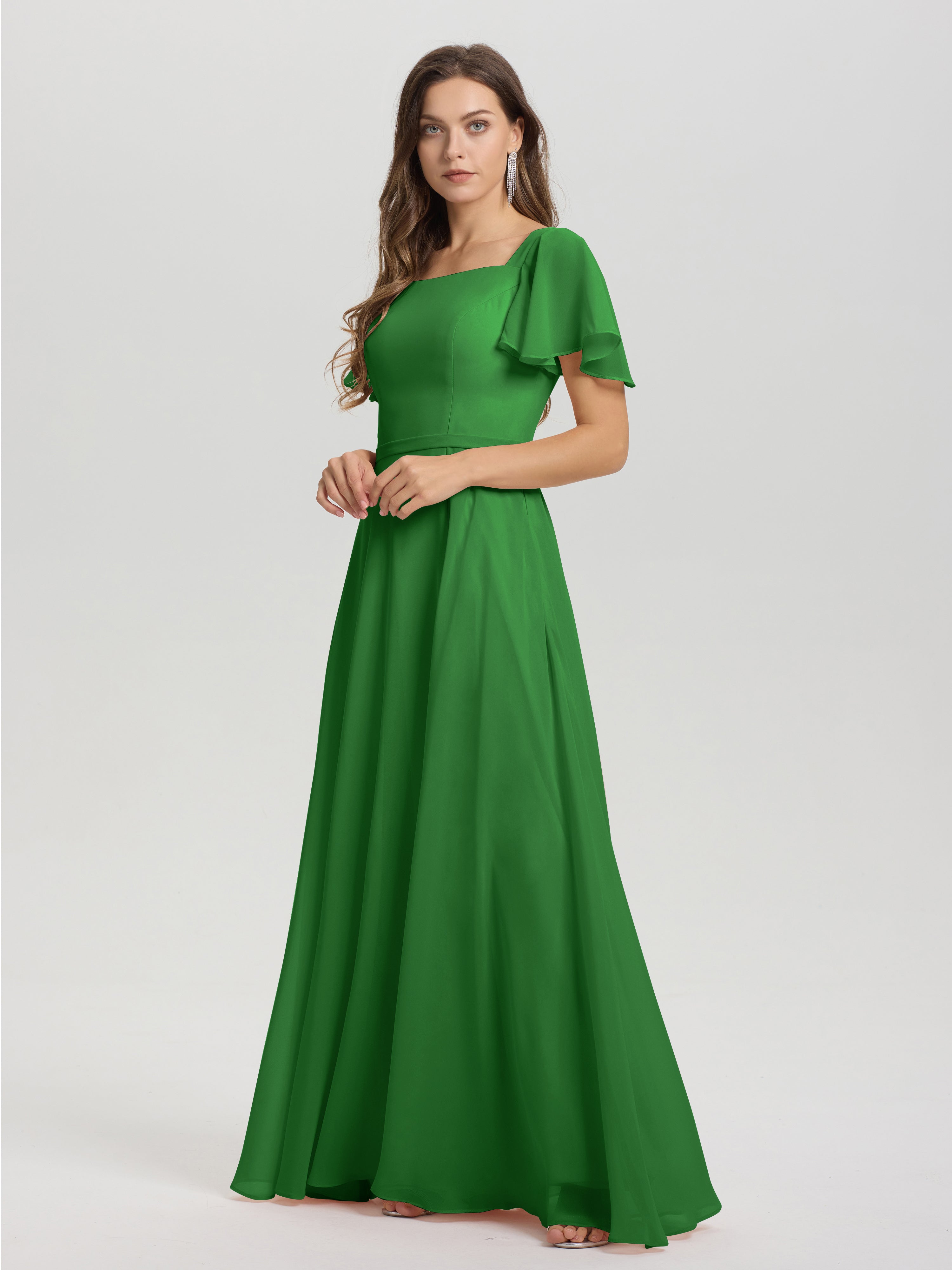 Square Neckline Short Sleeves Split Chiffon Bridesmaid Dresses