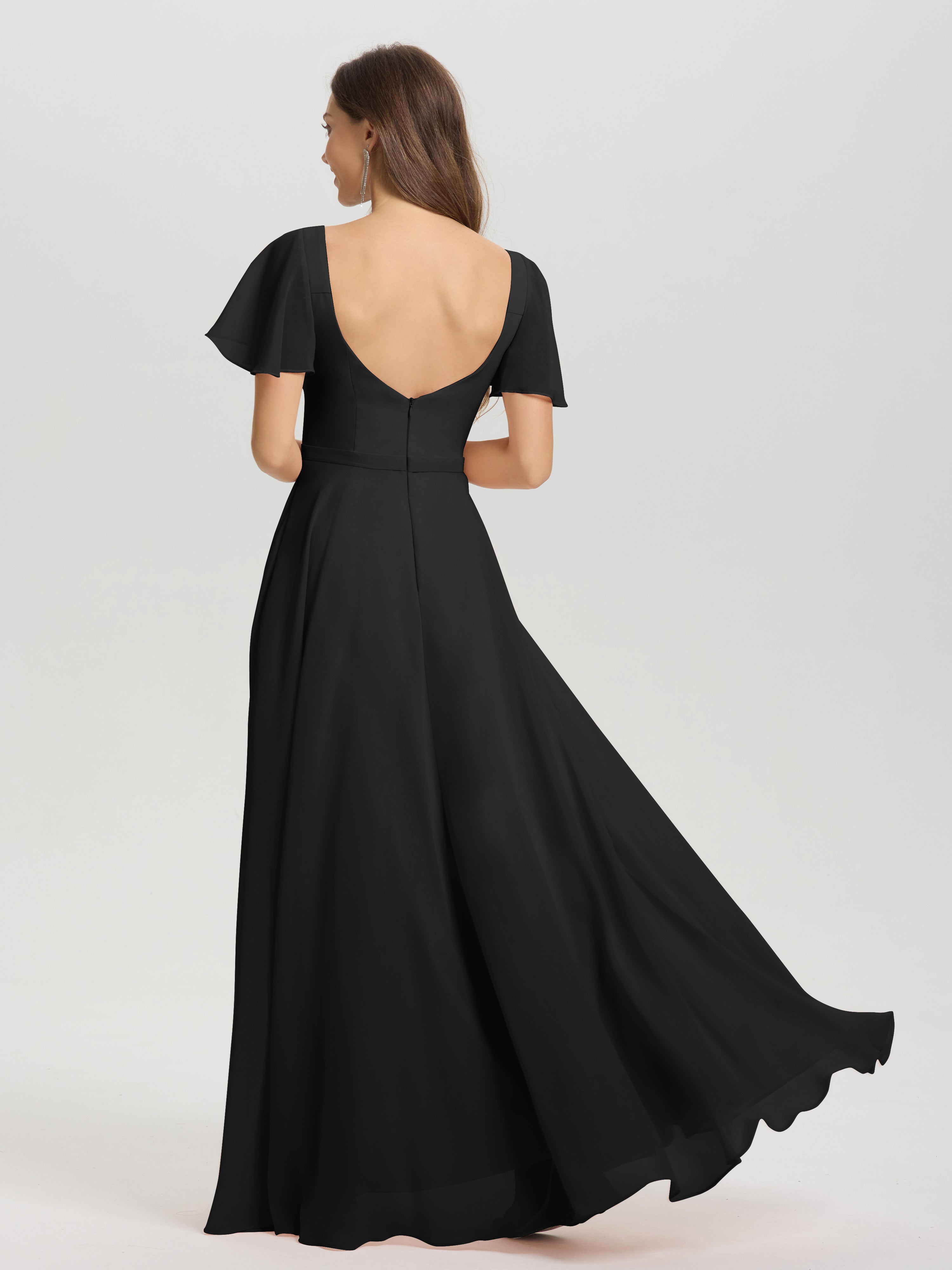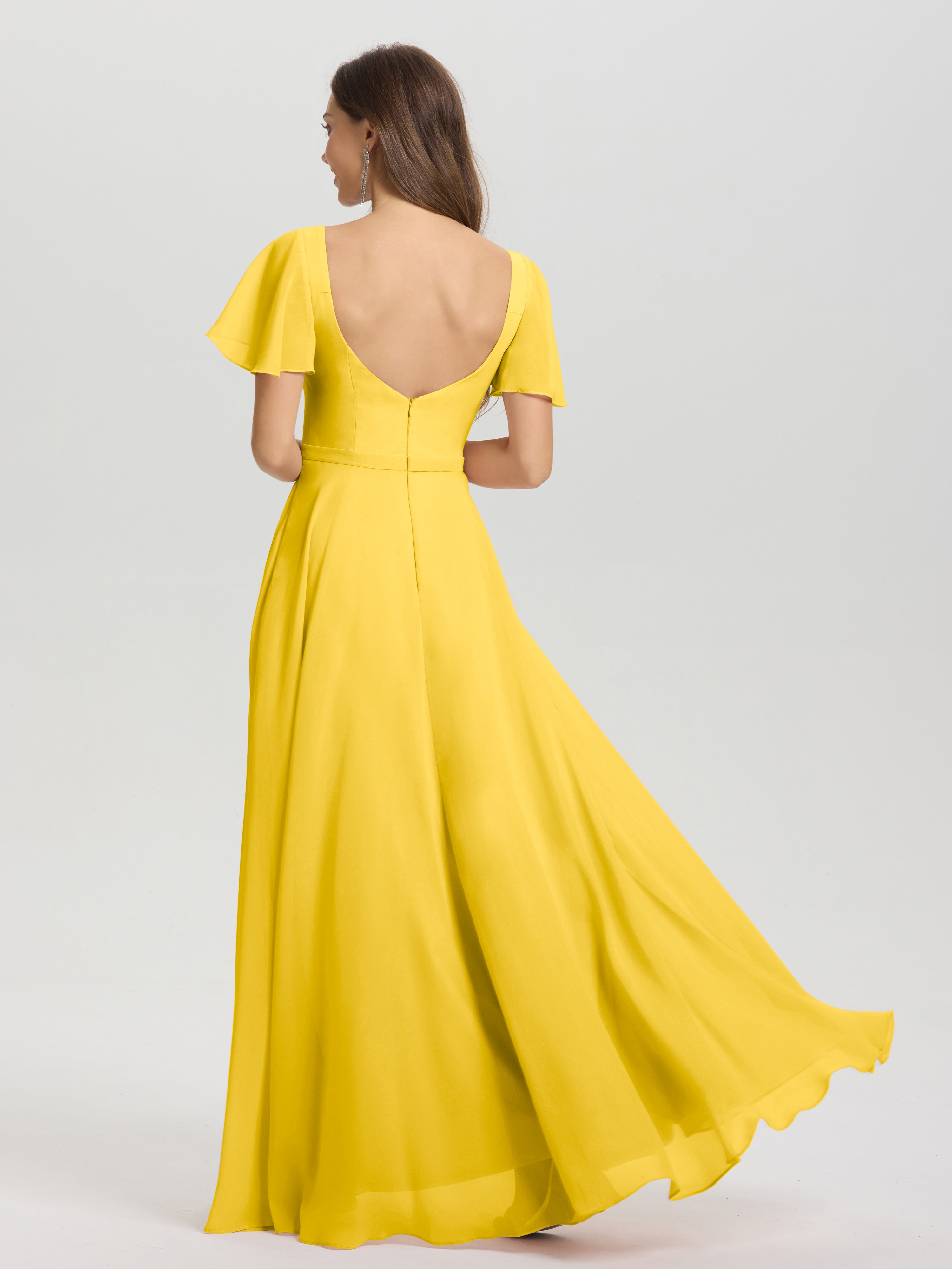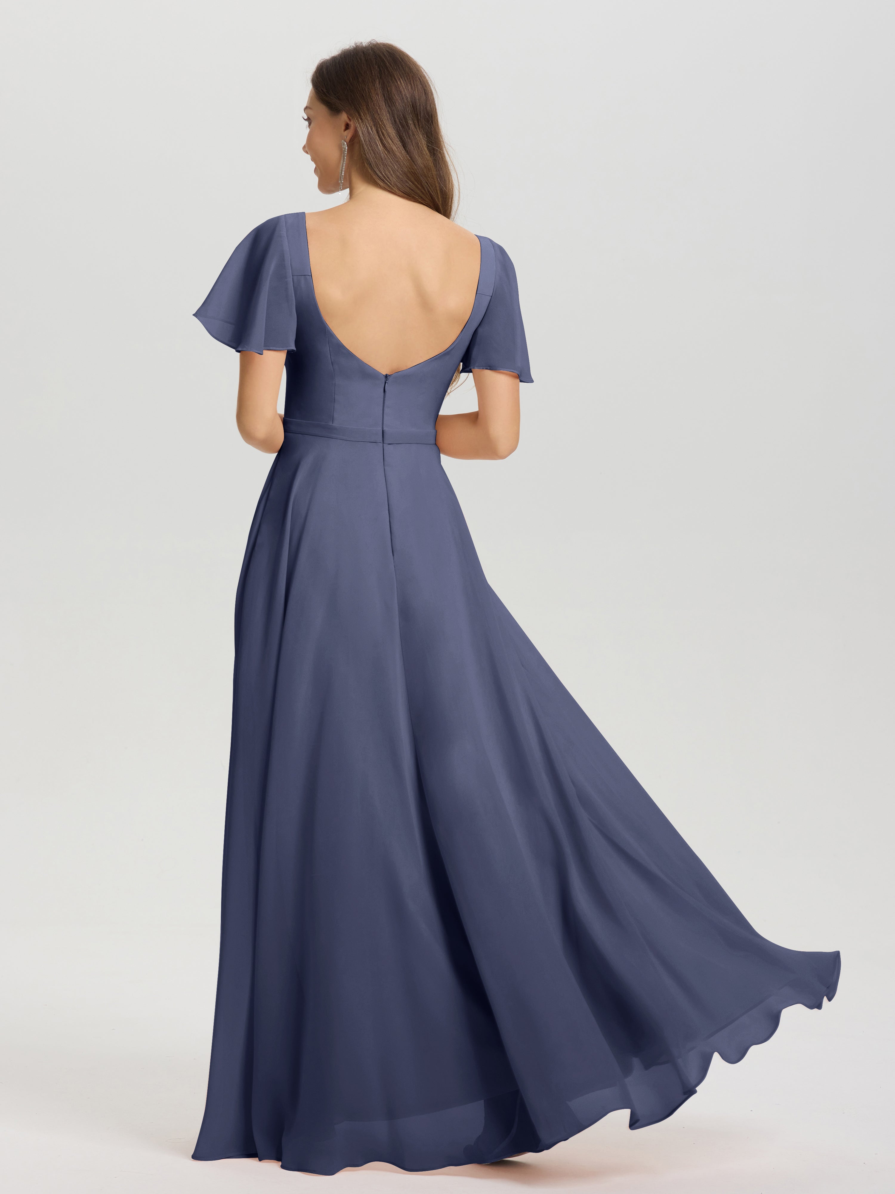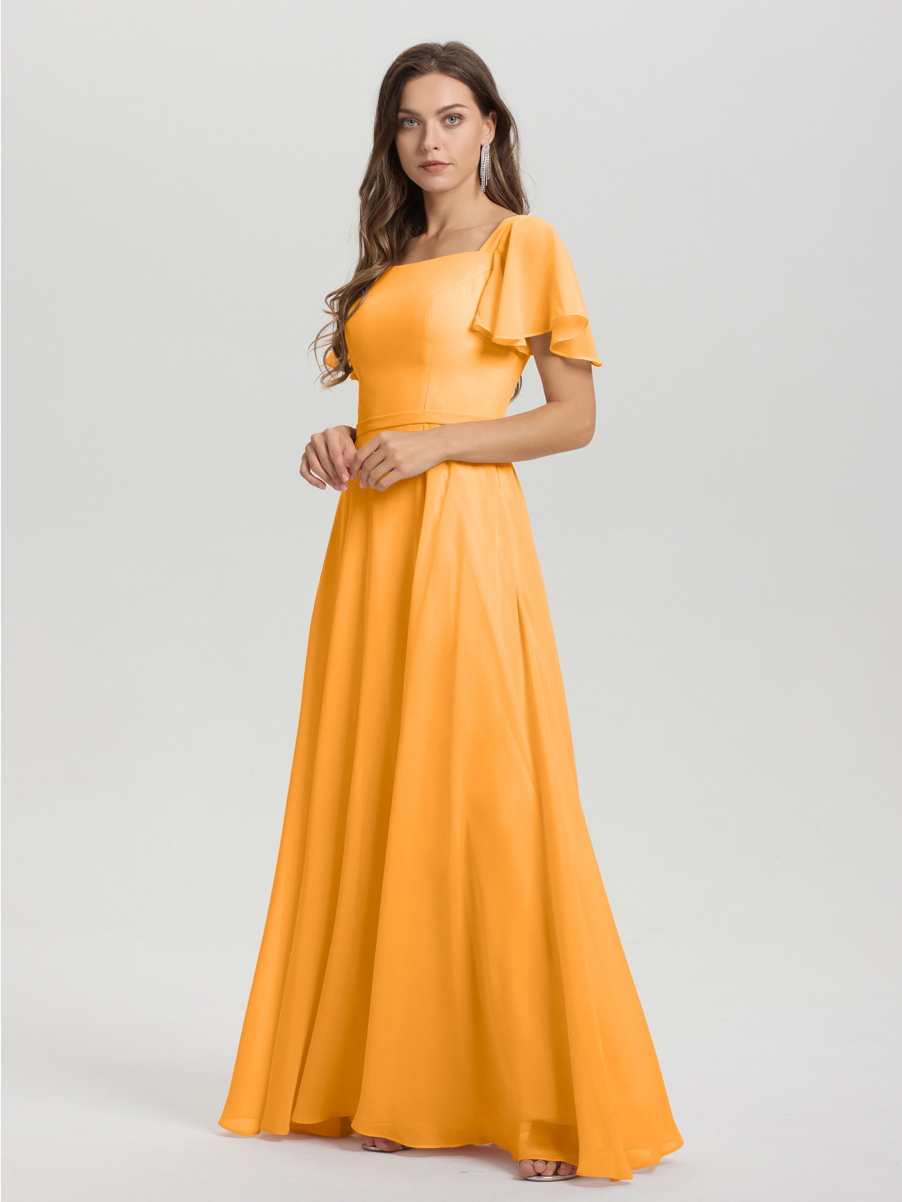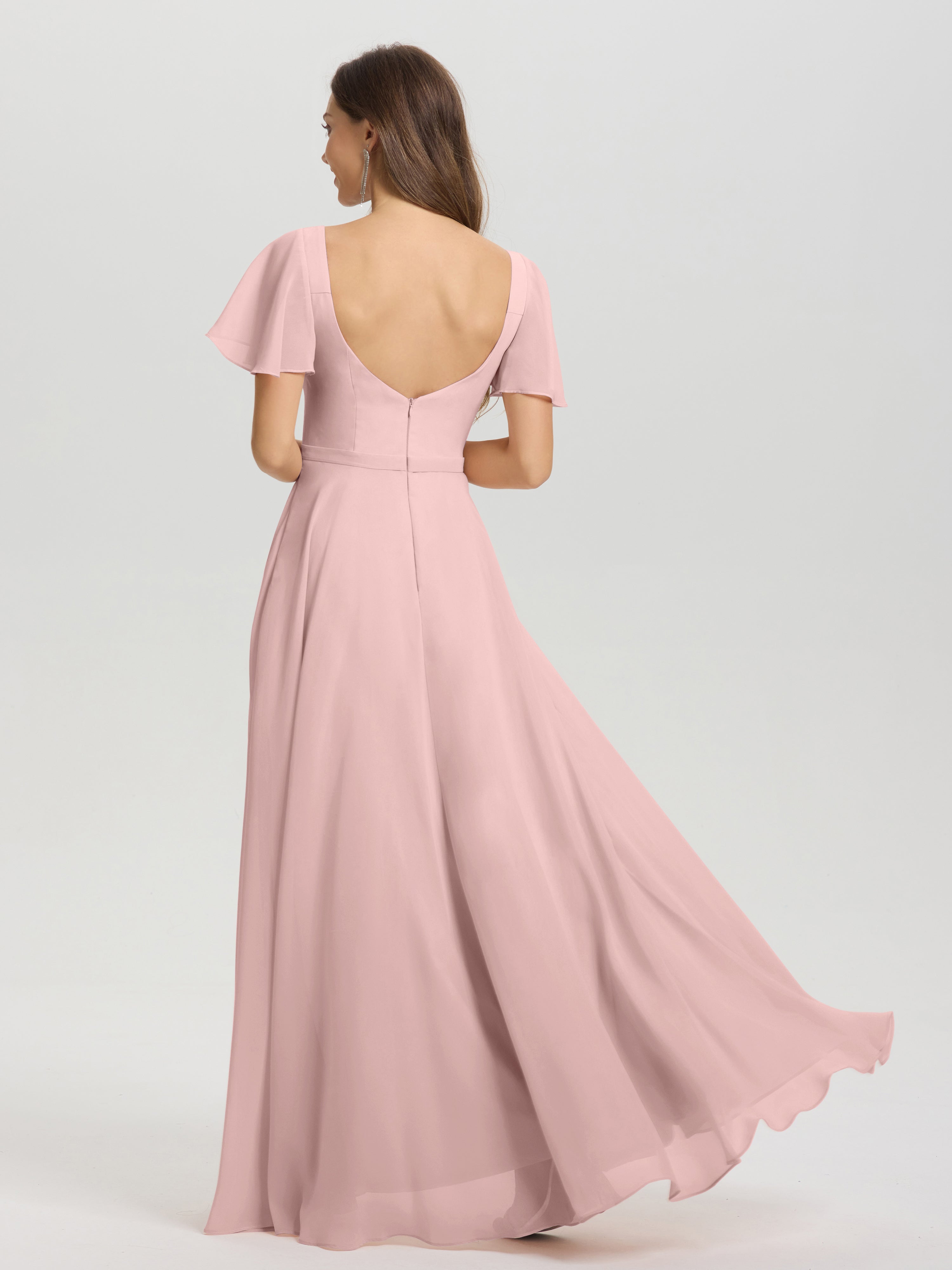 Square Neckline Short Sleeves Split Chiffon Bridesmaid Dresses