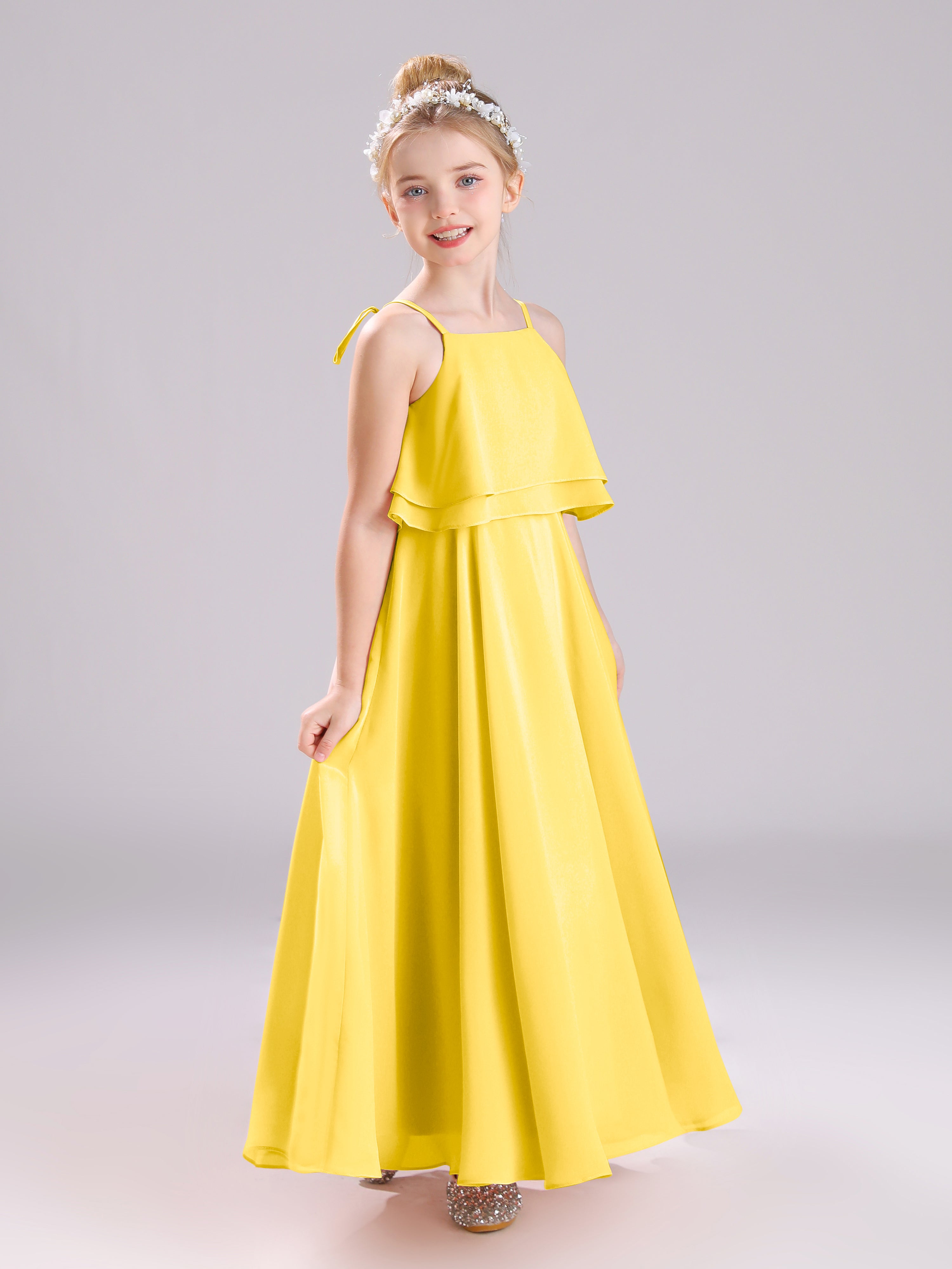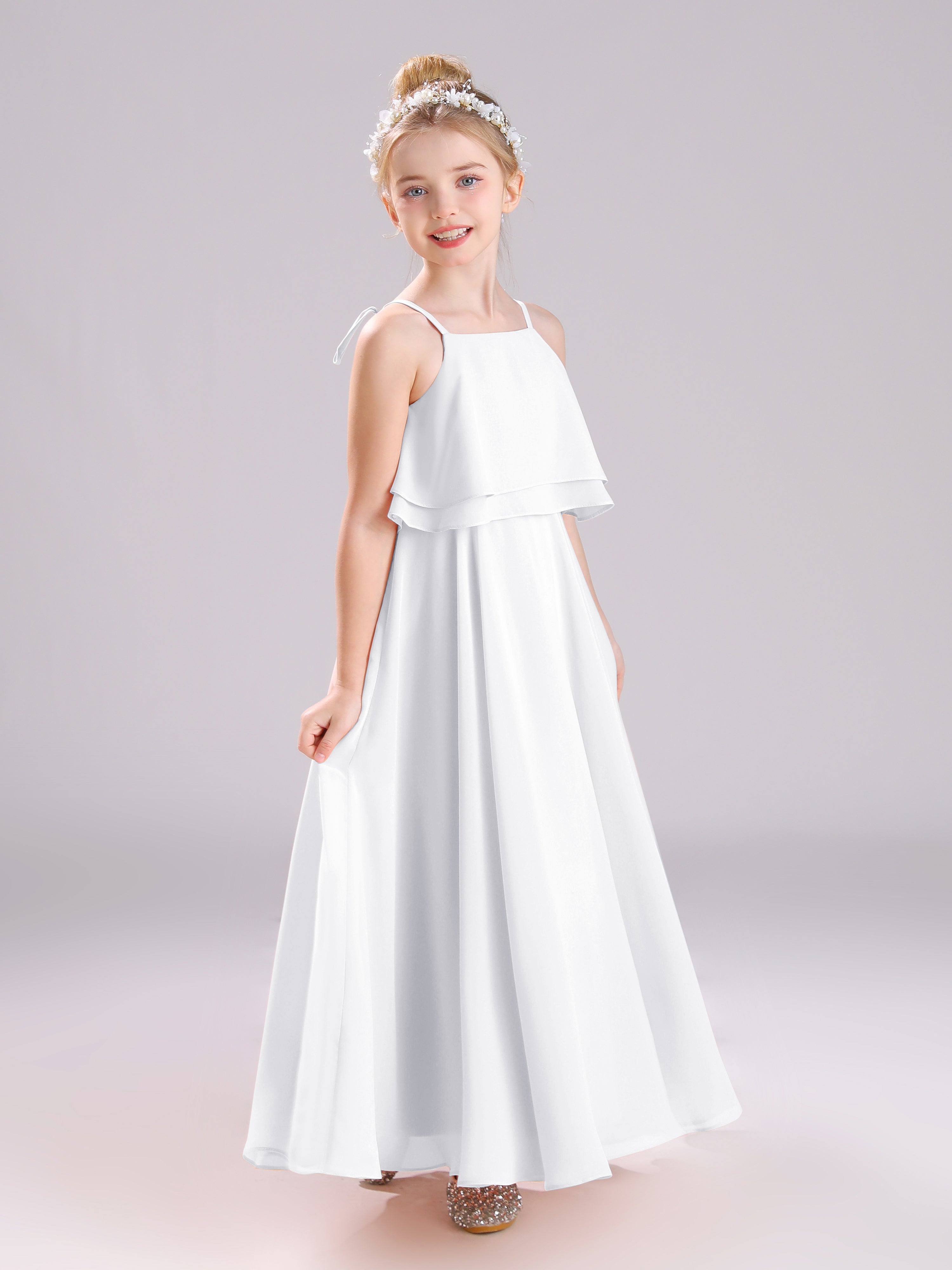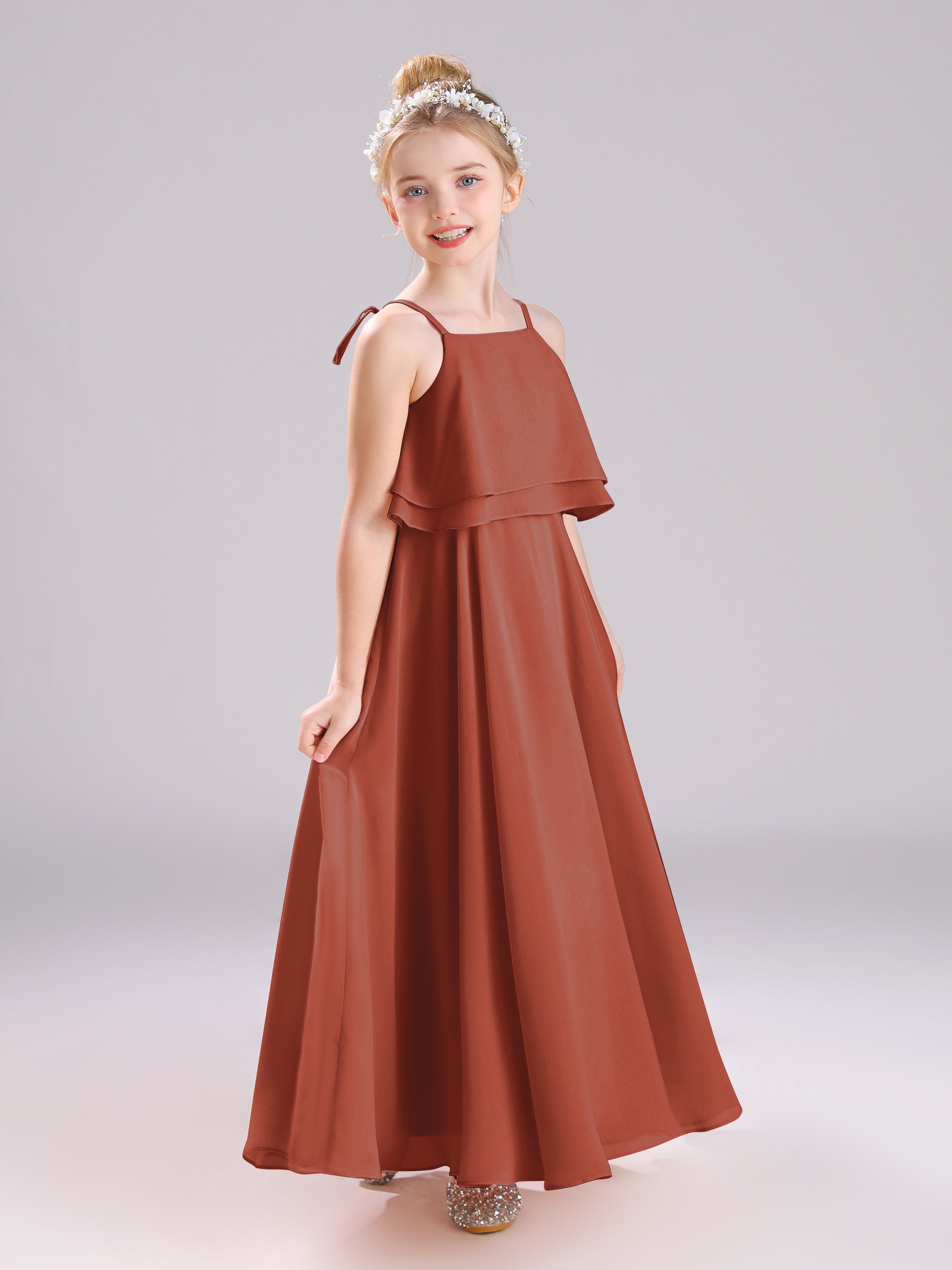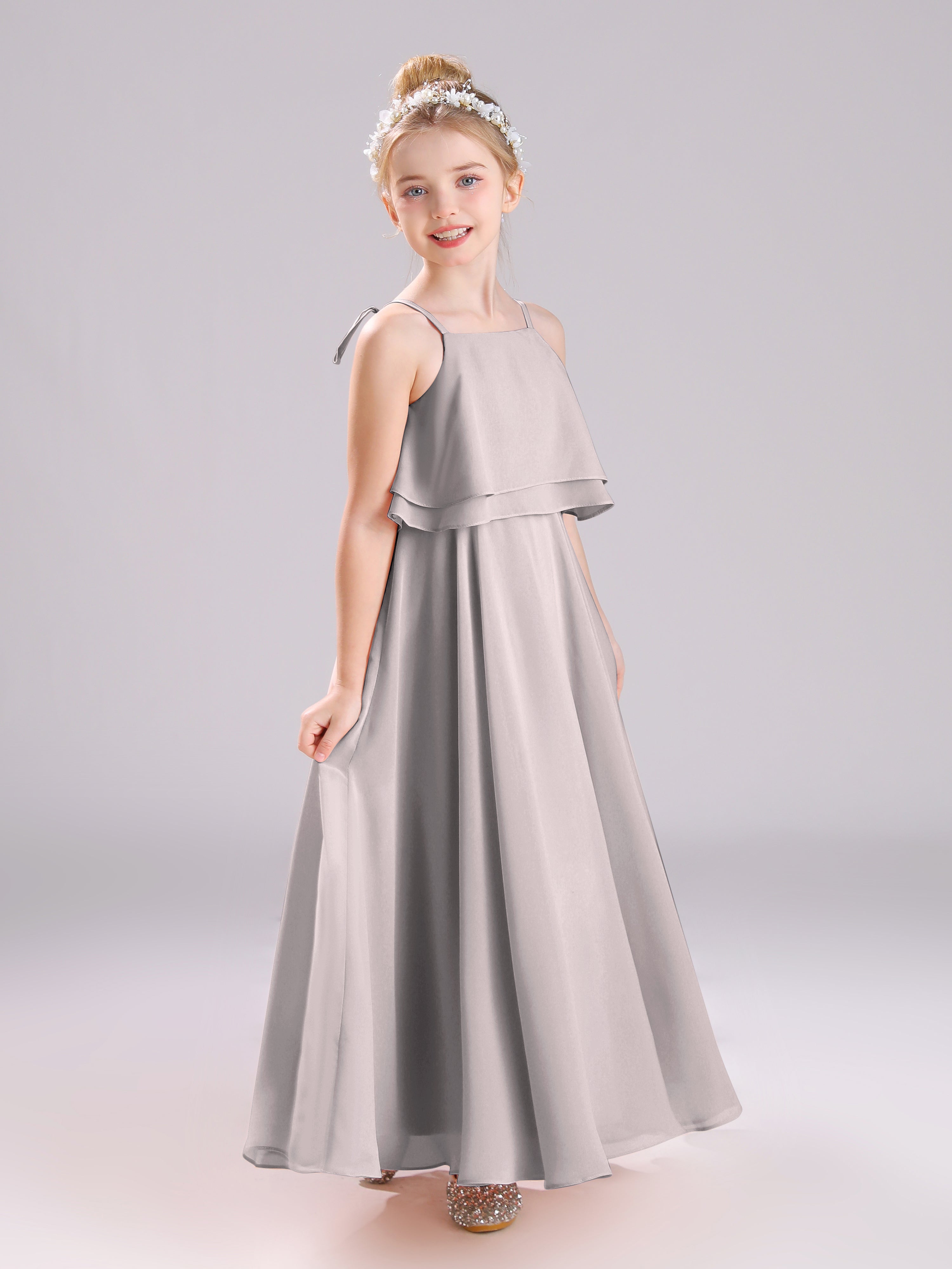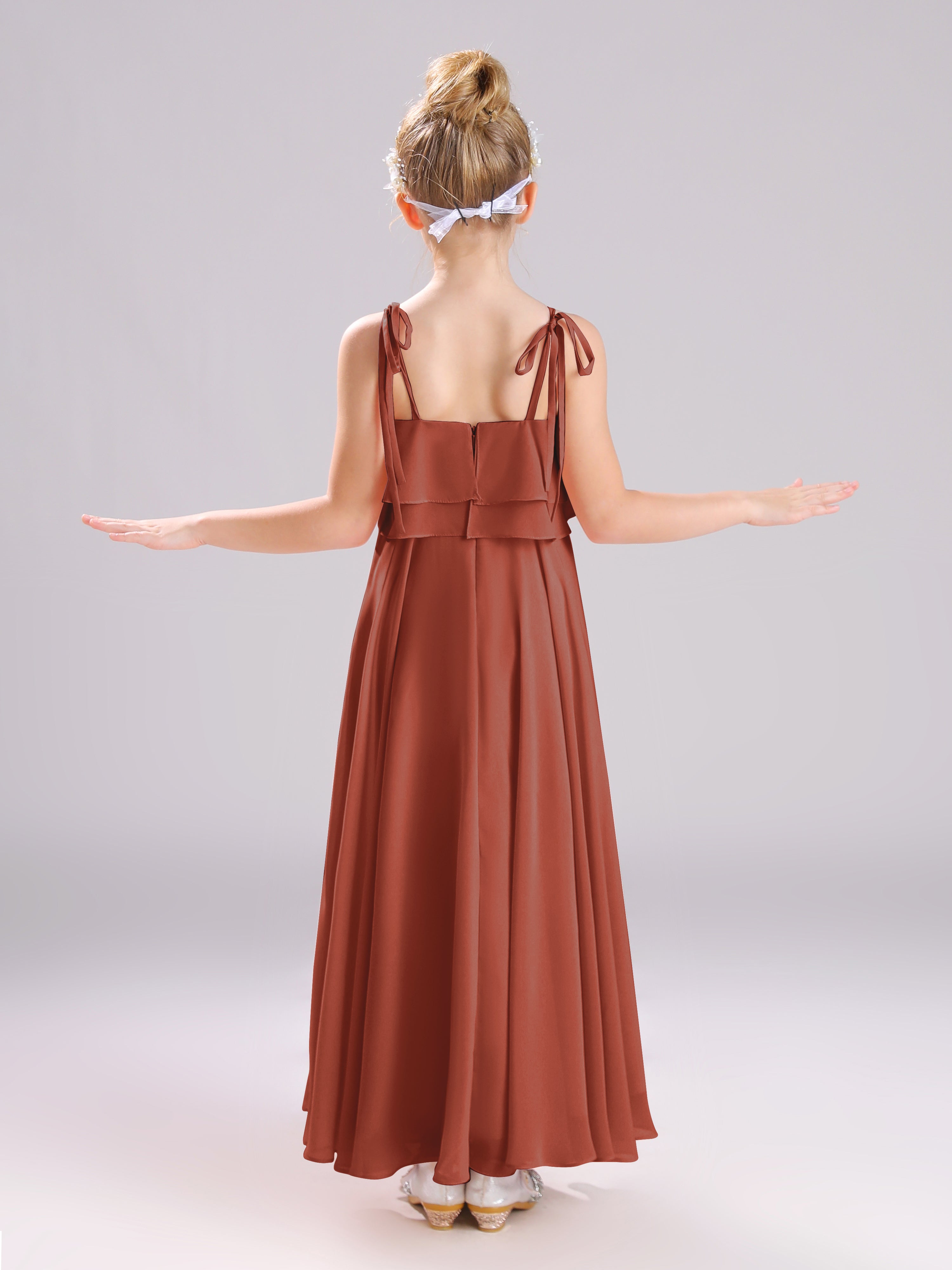 Elevate the junior bridesmaid's look with the Straps Floor Length Chiffon dress. The delicate straps and floor length cut add an elegant touch, while the chiffon material keeps her comfortable and free to move. Perfect for a sophisticated wedding party, this dress is sure to impress.