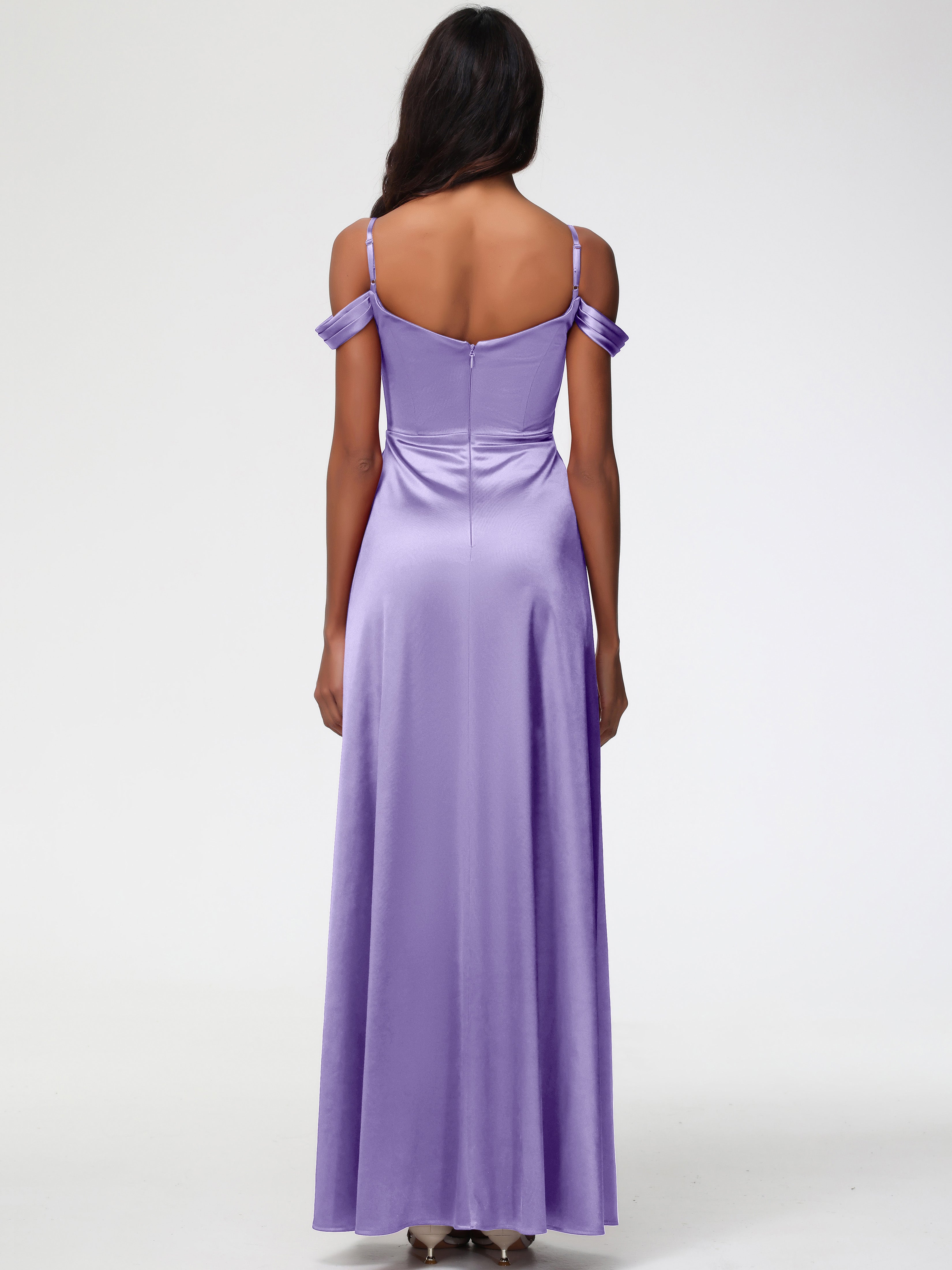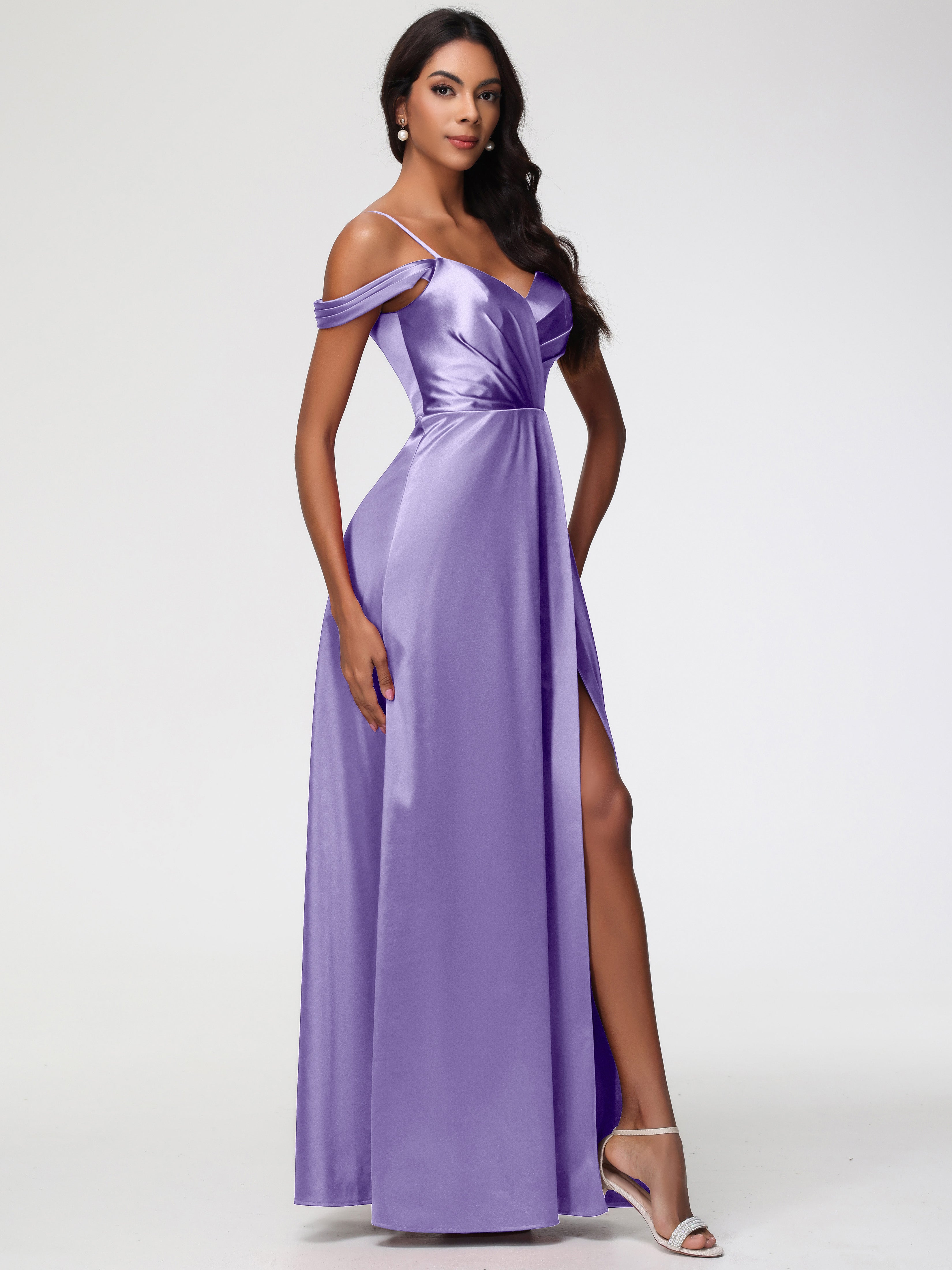 Tahiti Color Bridesmaid Dress A-Line V-Neck Off The Shoulder Long Stretch Satin Bridesmaid Dresses With Split