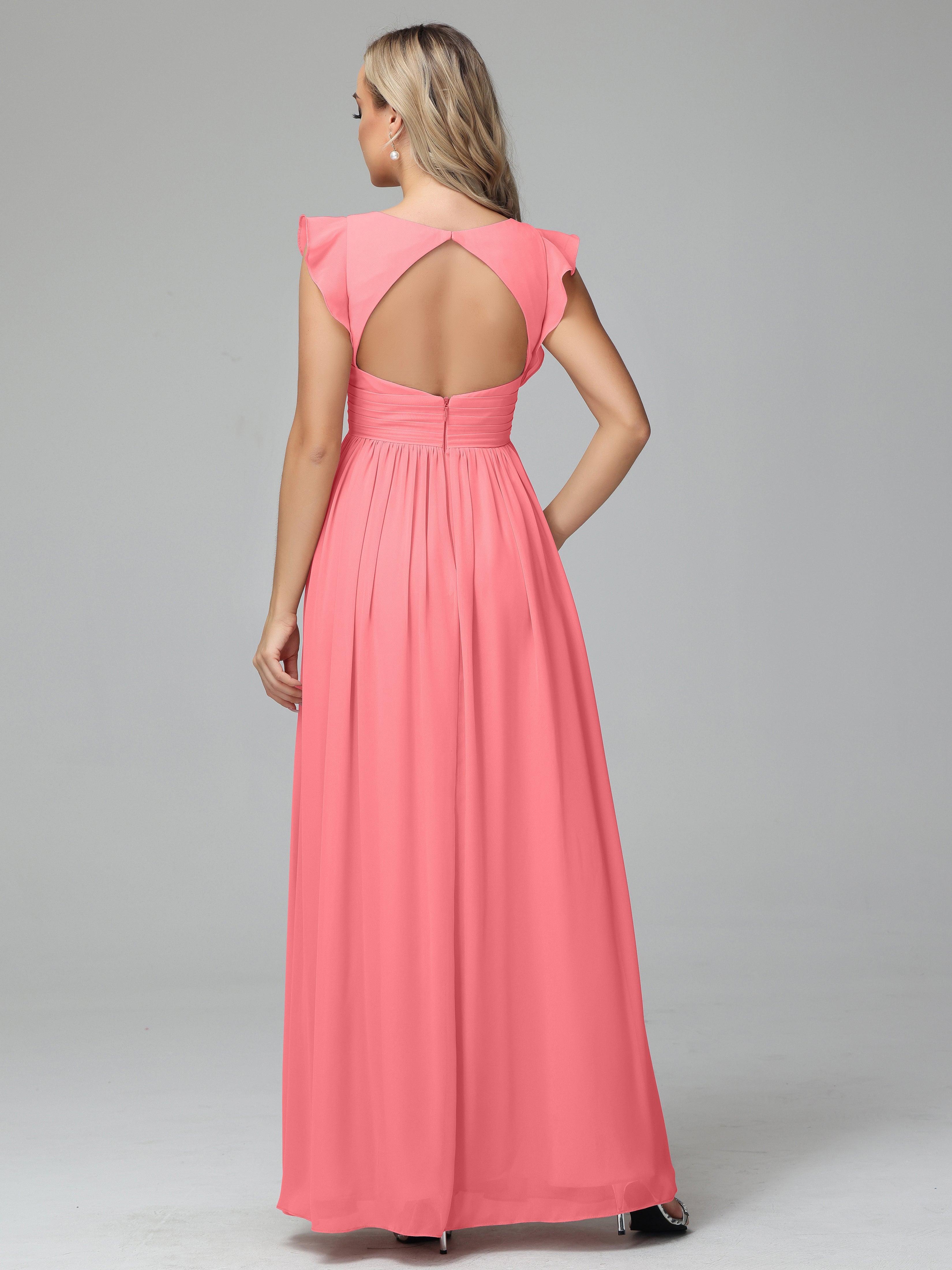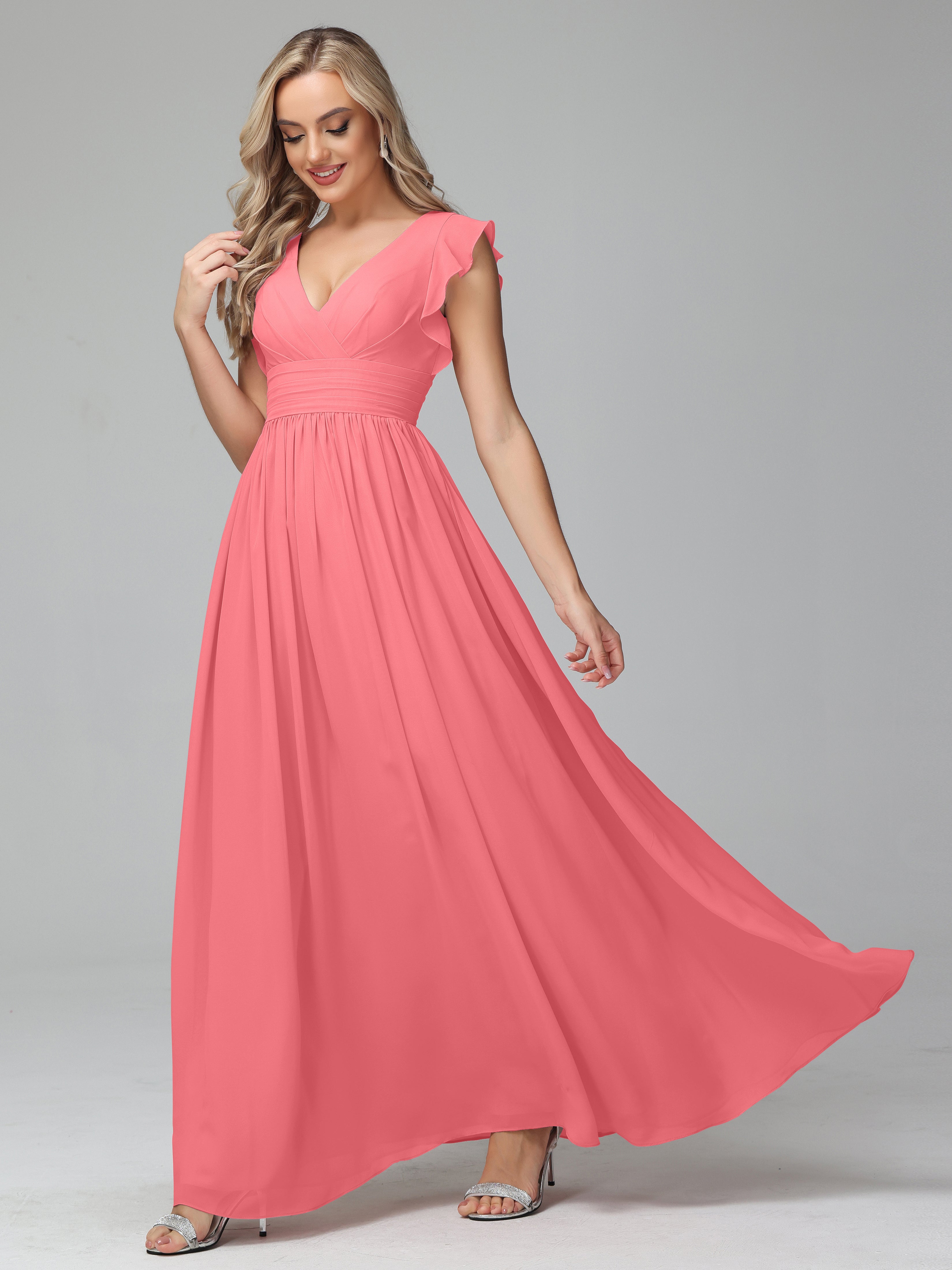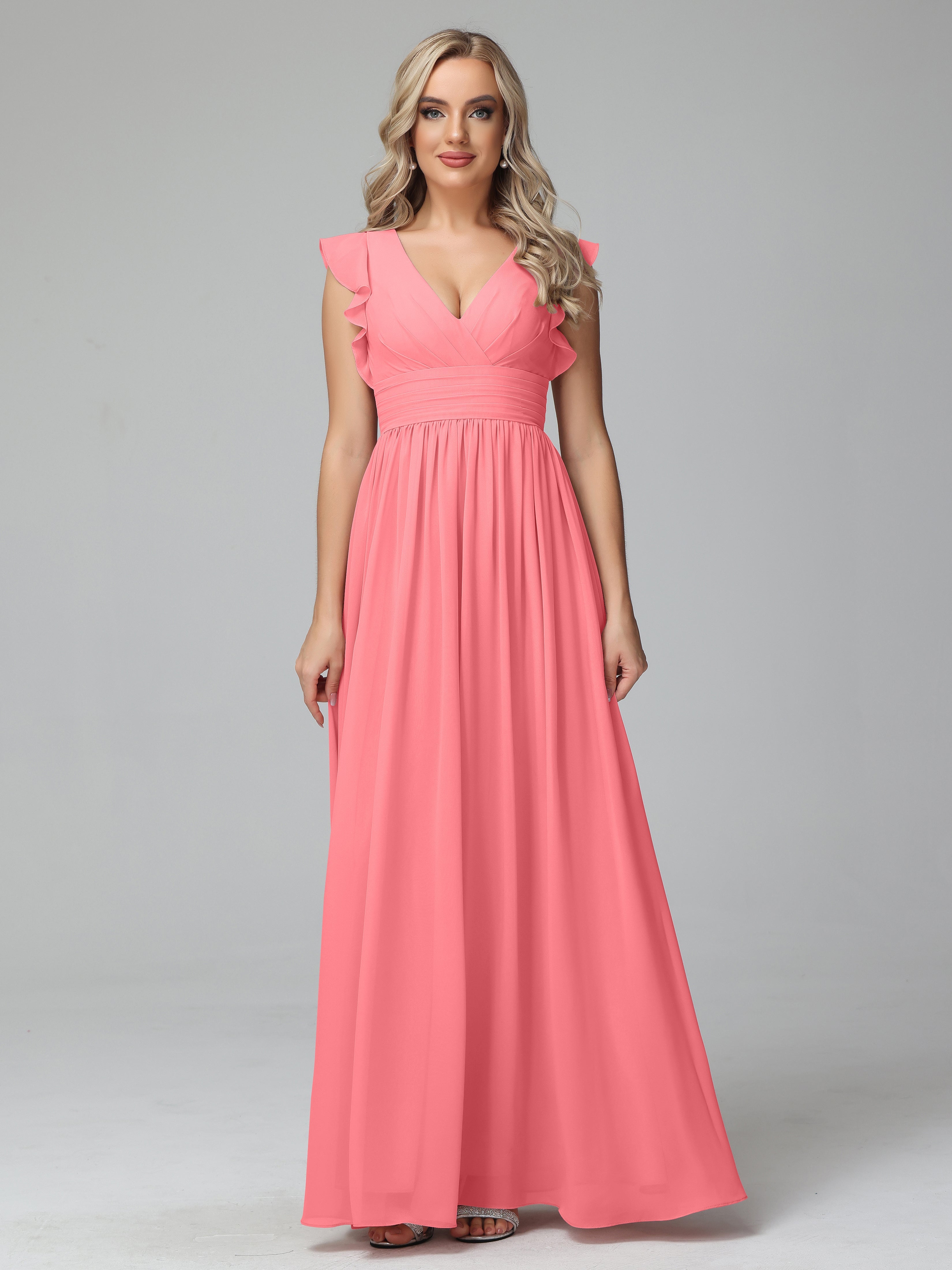 Watermelon Chiffon Bridesmaid Dress Bonnie V-Neck Chiffon Bridesmaid Dresses With Ruffle Sleeves