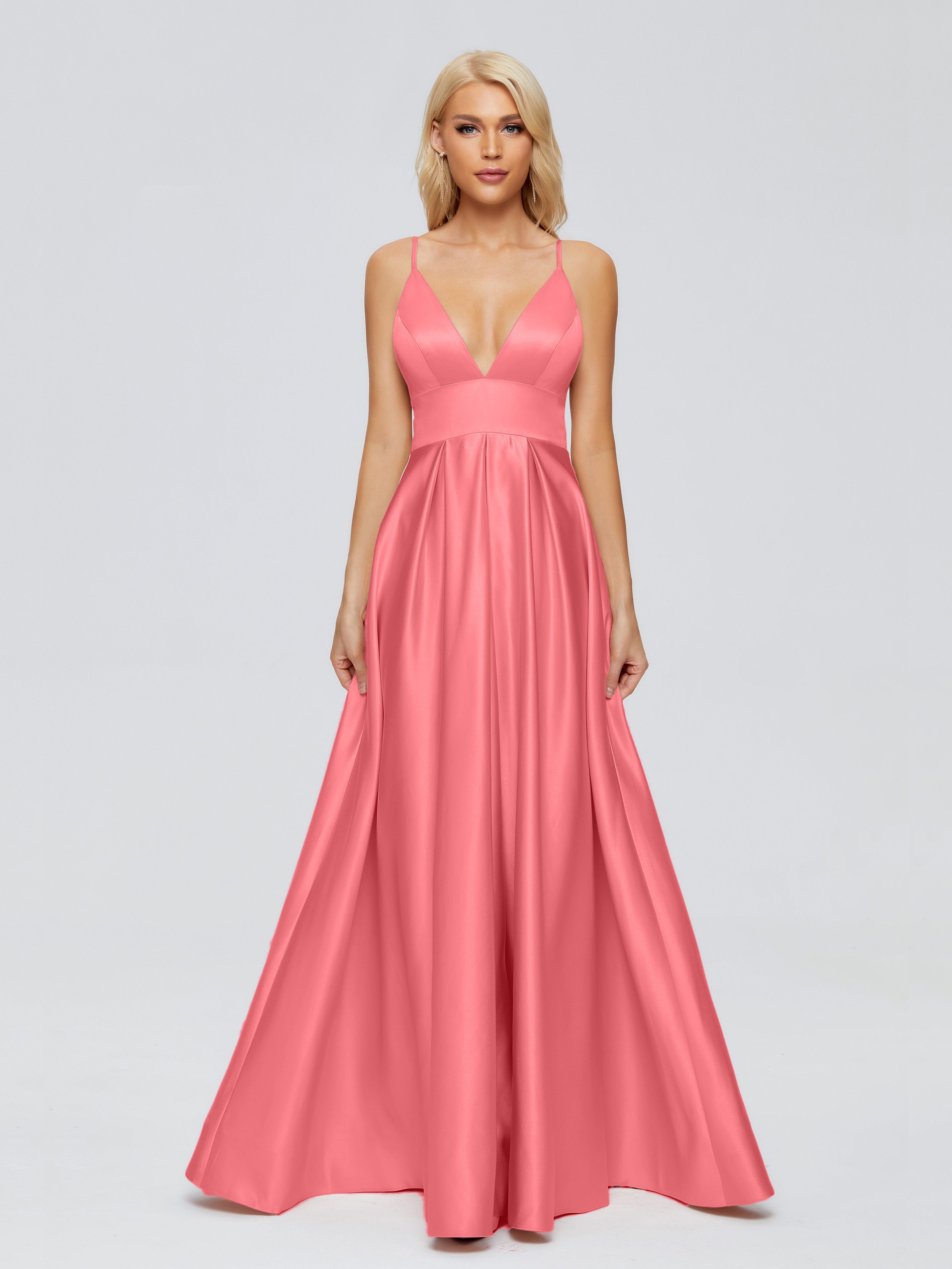Watermelon Color Bridesmaid Dress Spaghetti Straps Satin Long Bridesmaid Dresses